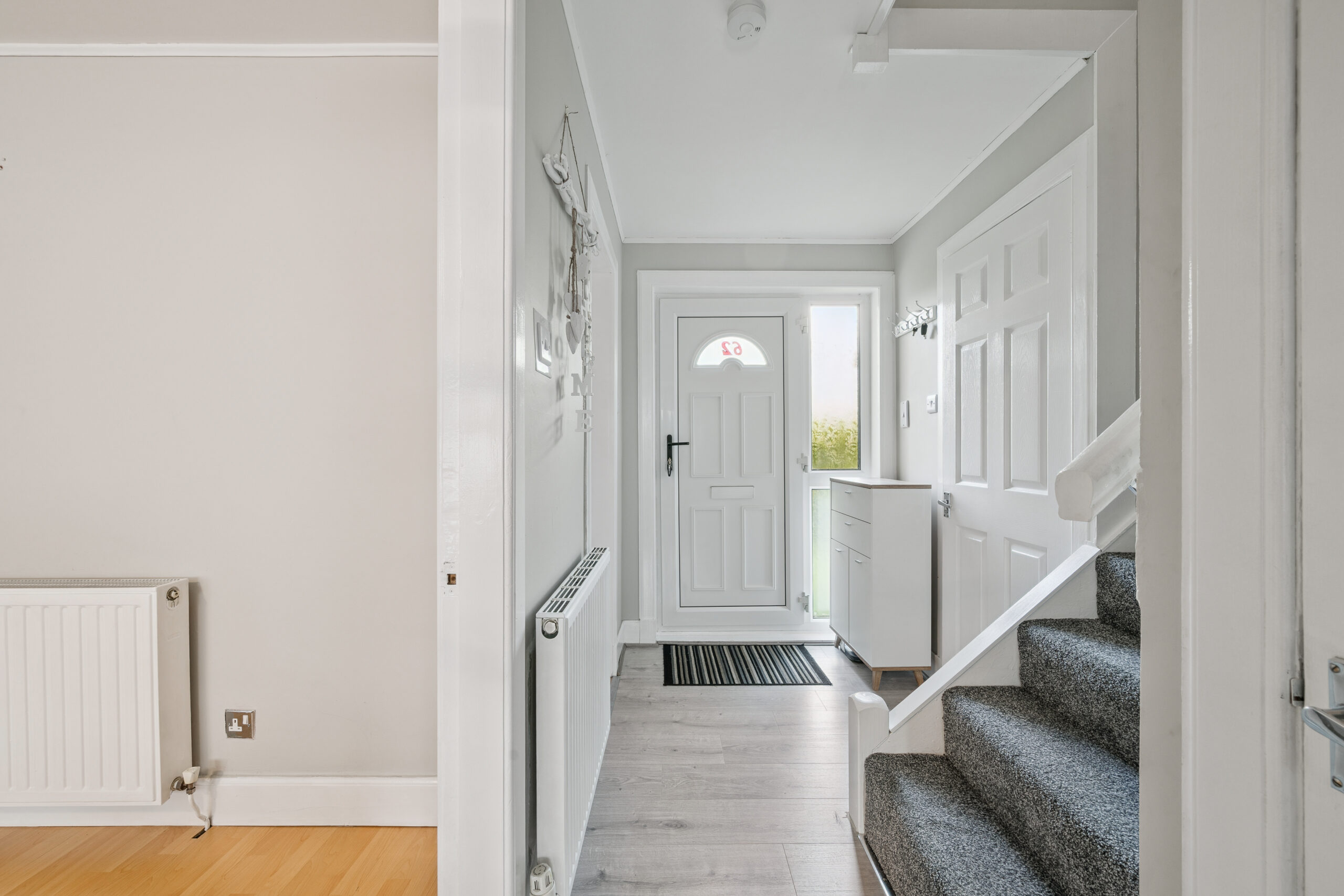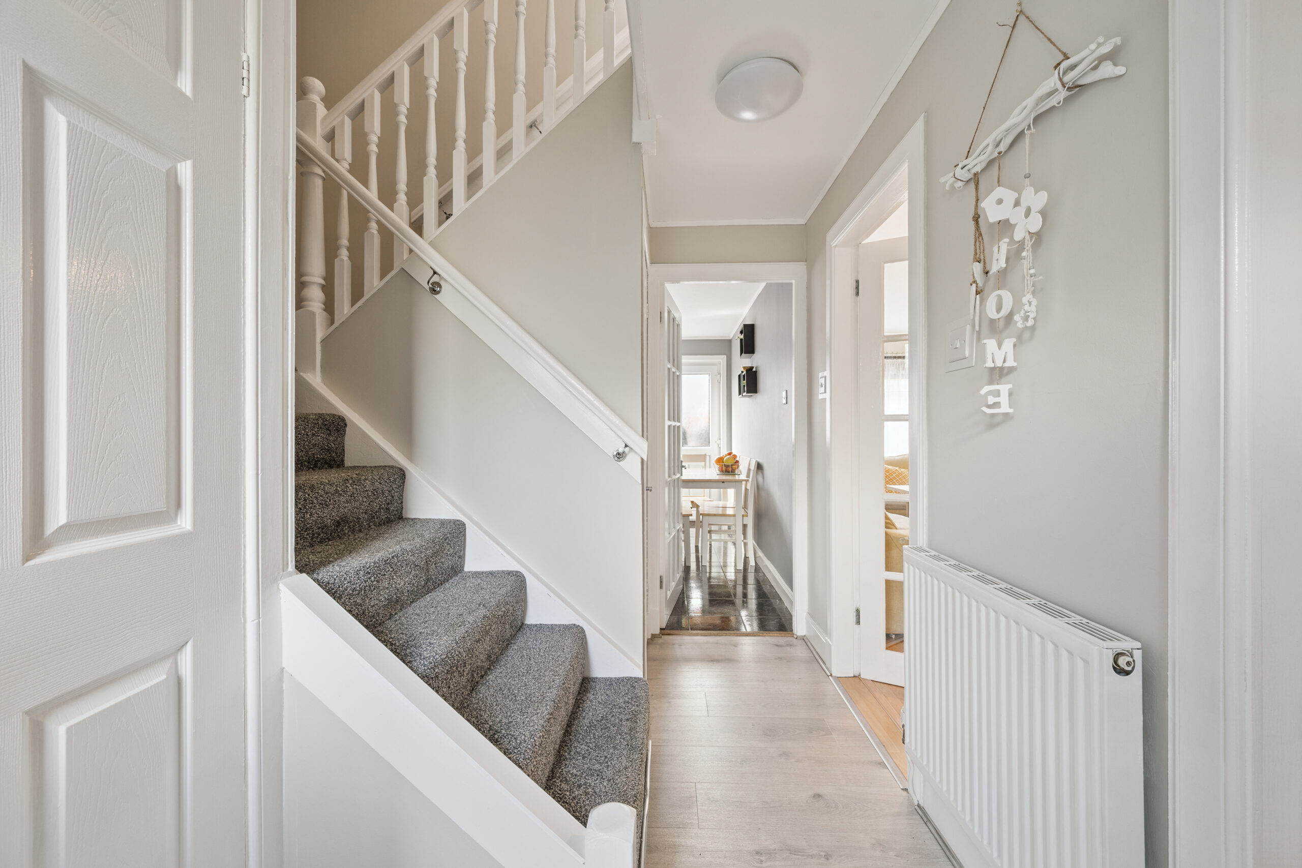Upon entering, you’re welcomed into a bright and airy hallway, which immediately sets the tone for this warm and inviting home. Just off the hallway, you’ll find a fully tiled downstairs WC, complete with chrome accents and a heated towel rail, providing everyday practicality and guest convenience. The main lounge is located to the right and is an impressive, light-filled room that spans almost the full length of the property. With space for two large sofas, a media wall, and more, this room is both comfortable and versatile. Dual-aspect windows let in plenty of natural light, creating a bright and relaxing living environment.