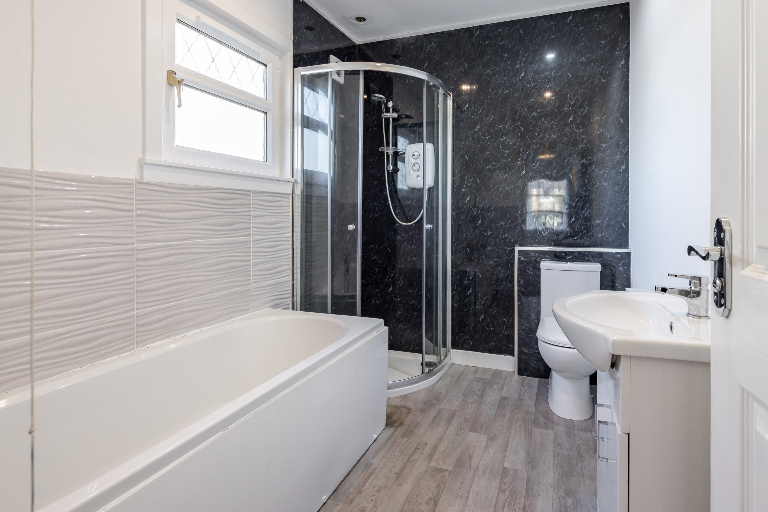 The ground floor also features a stylish and spacious family bathroom, complete with a large bath and a separate walk-in shower finished with modern wet wall panels. The proportions of this room offer superb potential to create a luxurious bathroom with both comfort and functionality in mind.