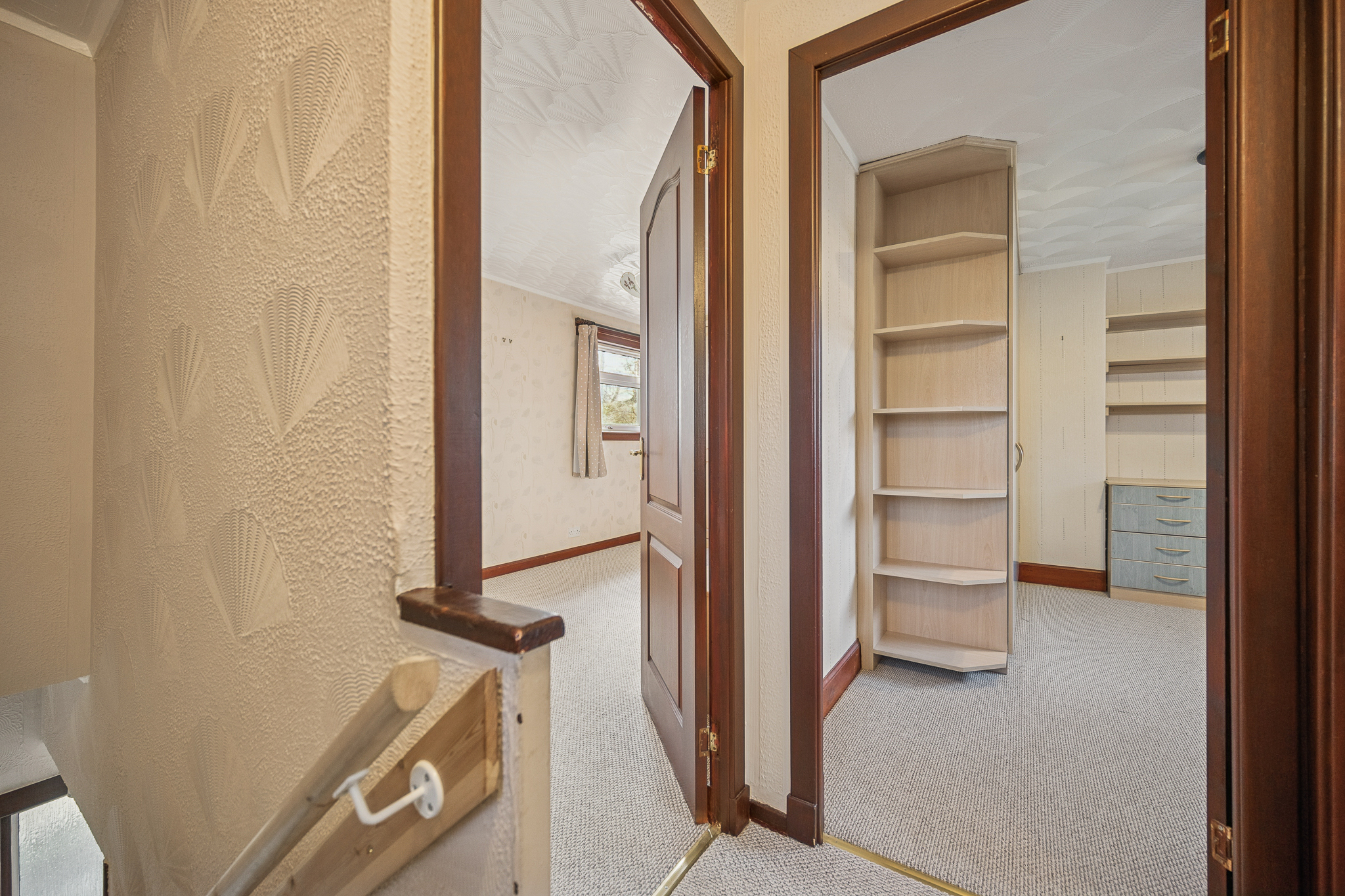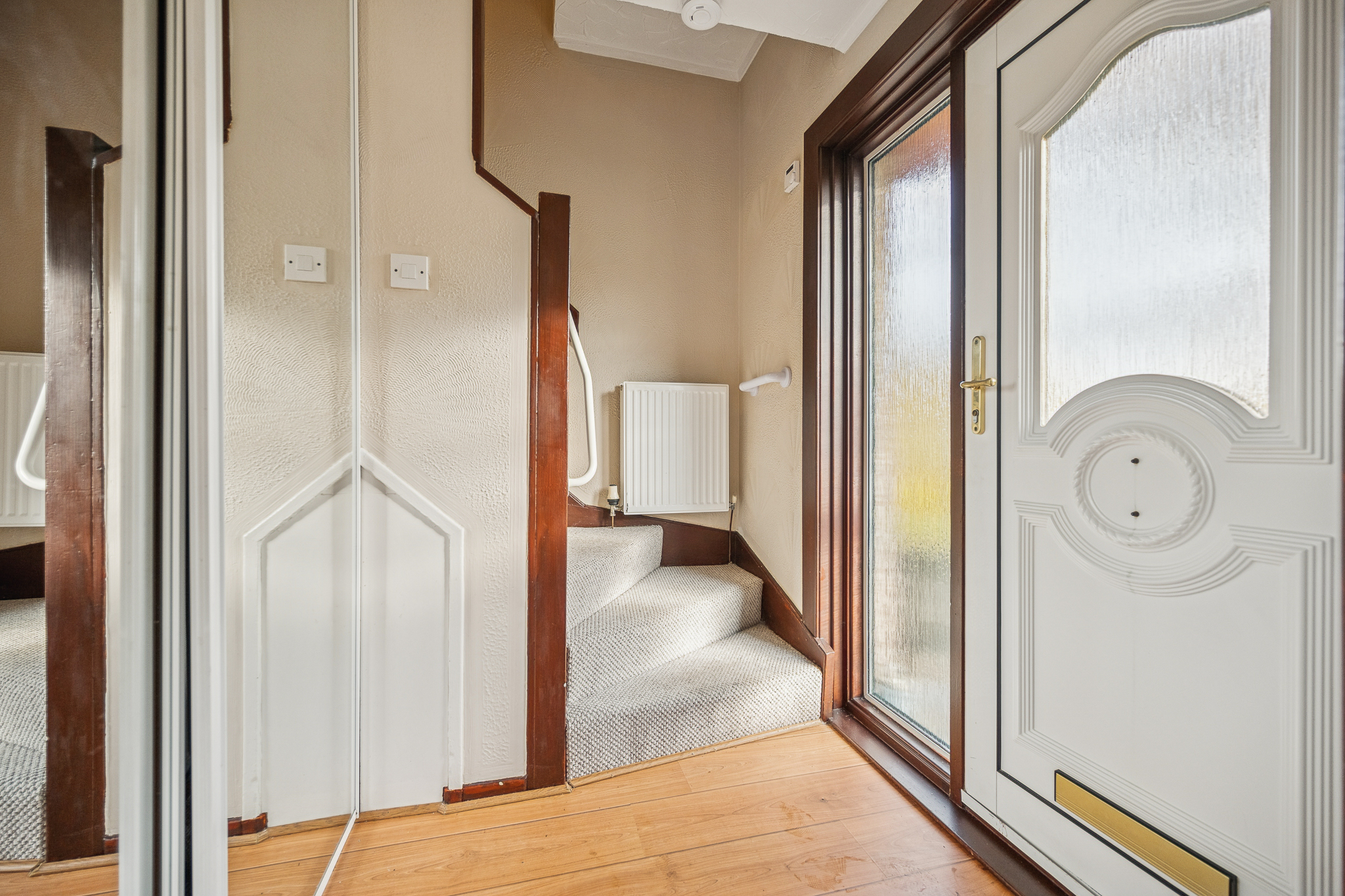 As you enter, you’re greeted by a light-filled hallway, enhanced by a floor-length frosted glass window that allows natural light to flow through the space. The hallway also hosts a large storage cupboard, thoughtfully updated with mirrored doors for a modern touch and added practicality.