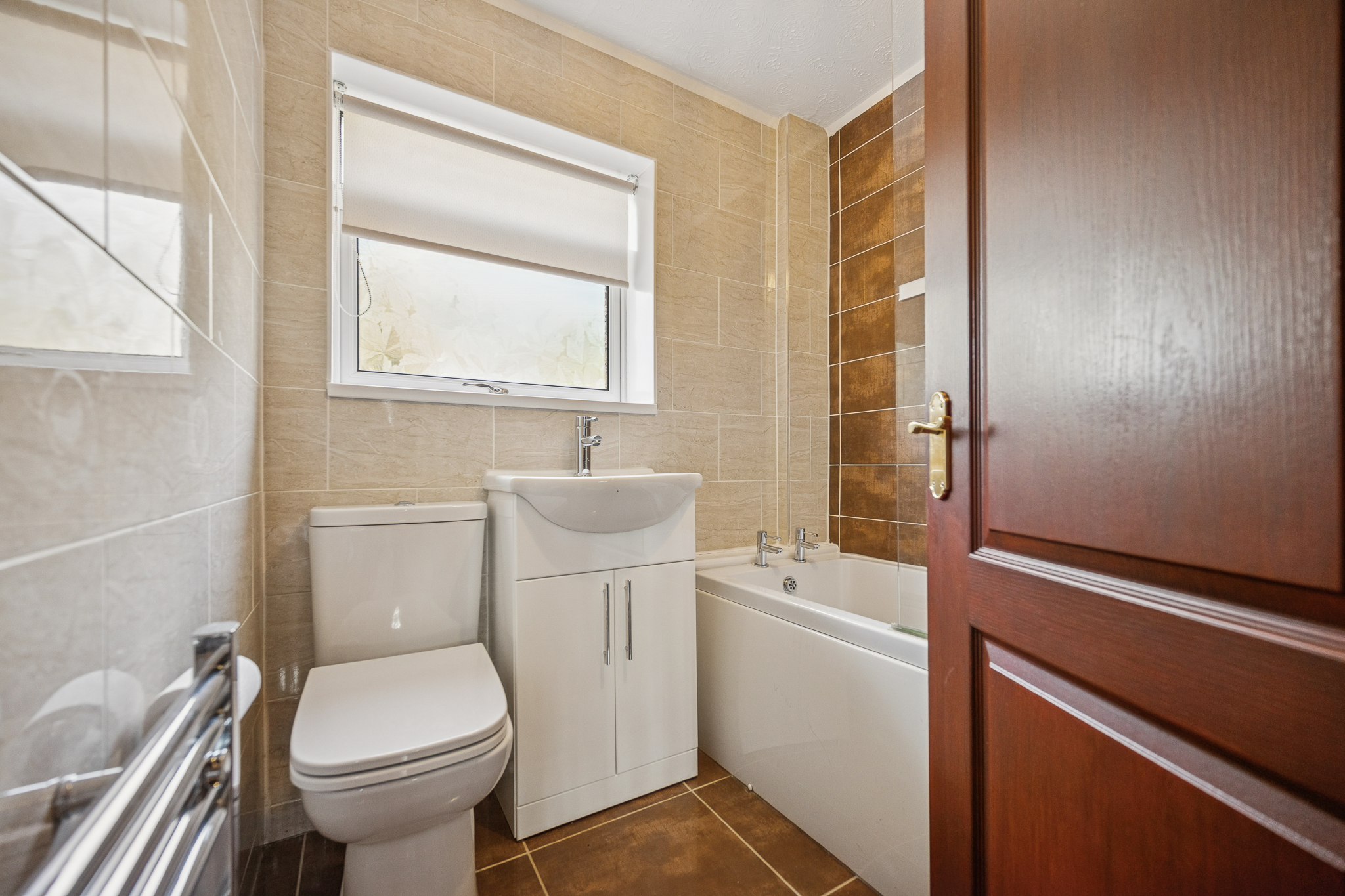 Upstairs, both bedrooms are generous doubles, each benefiting from built-in storage. Completing this floor is the modern bathroom, which is fully tiled and complete with a bath, overhead shower and chrome towel rail.