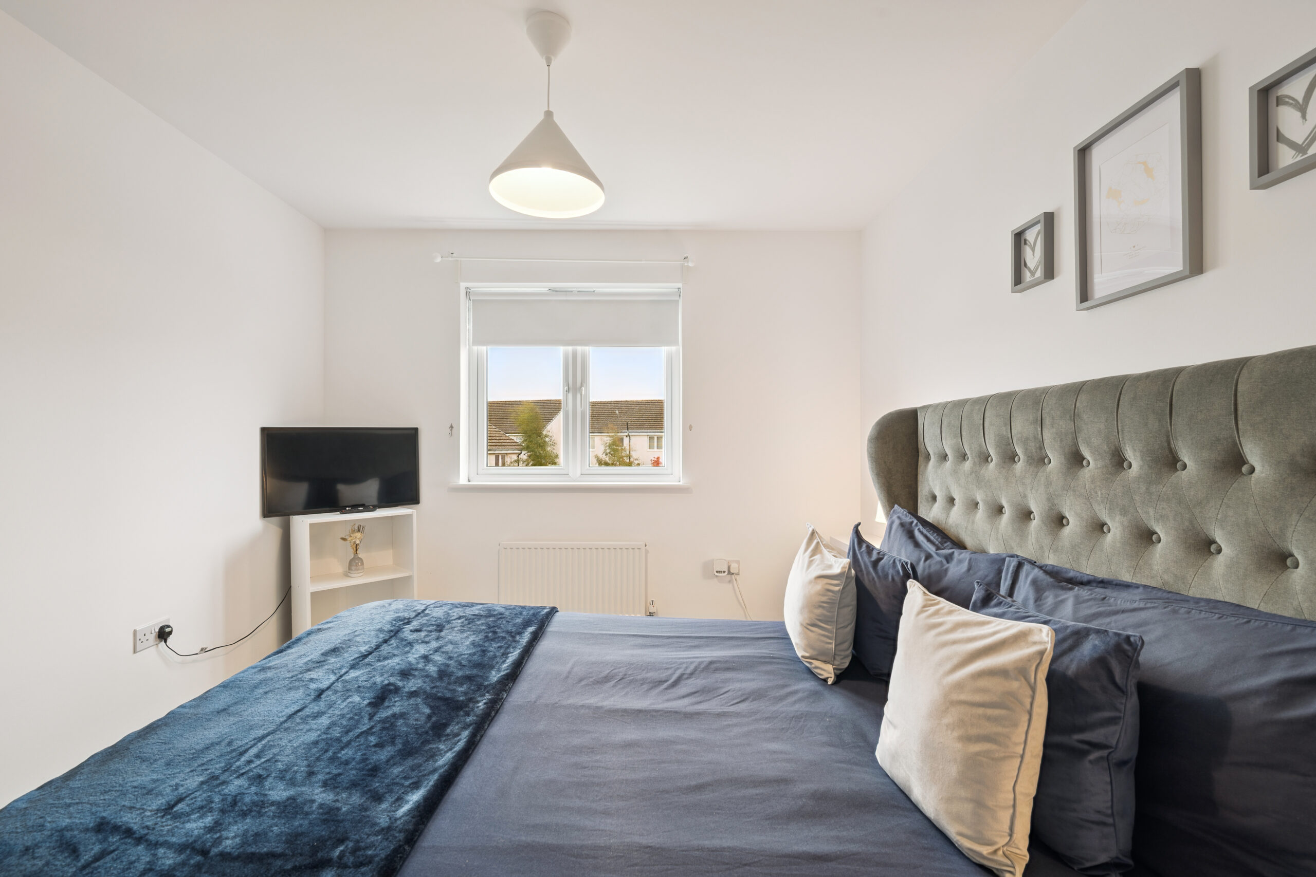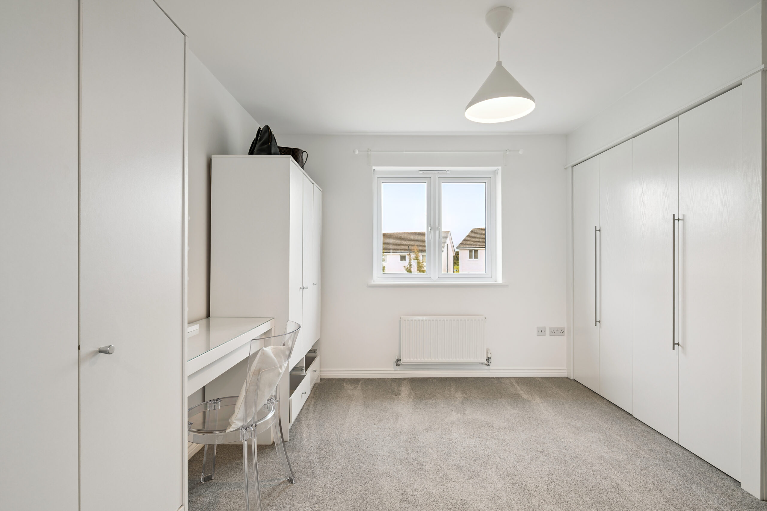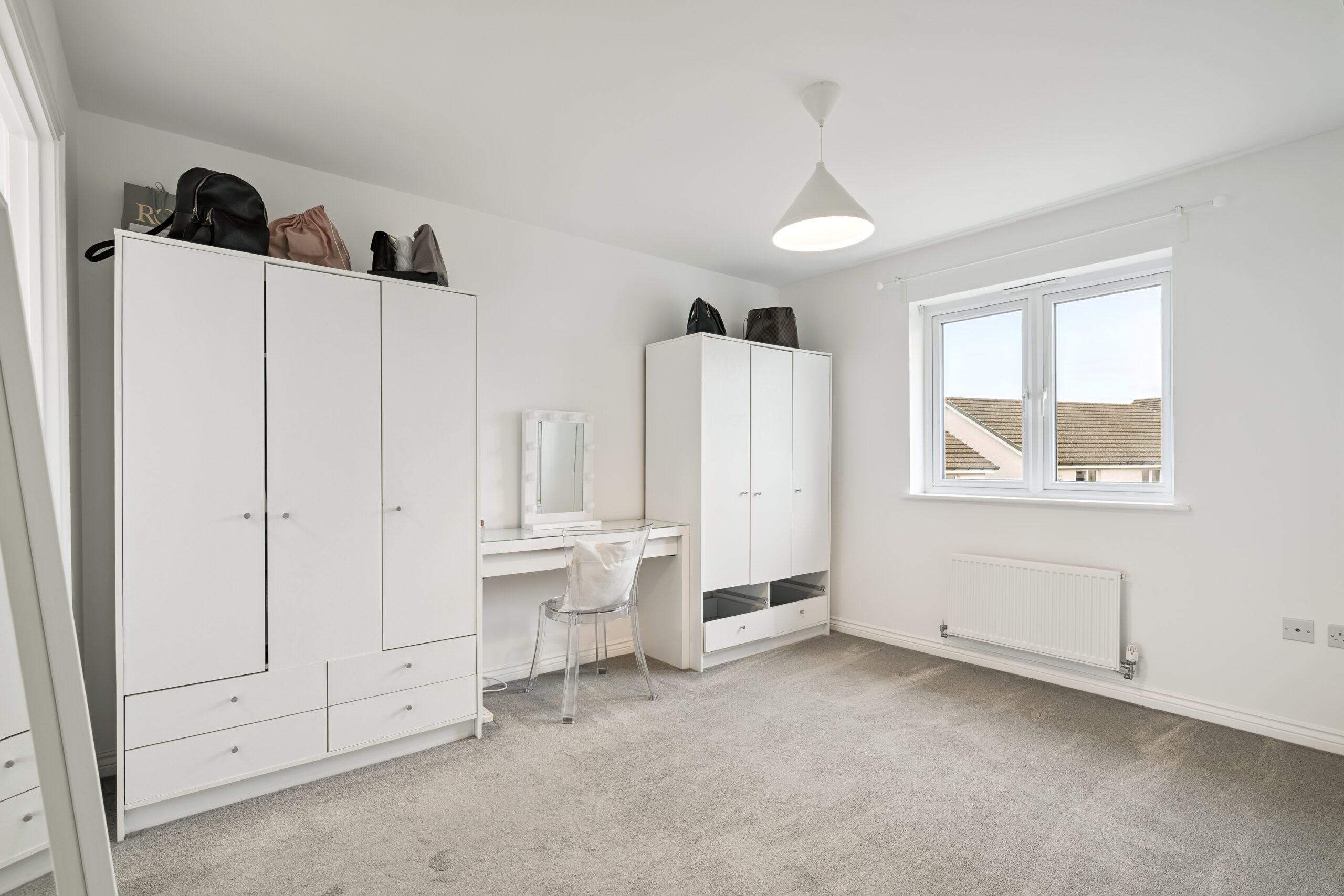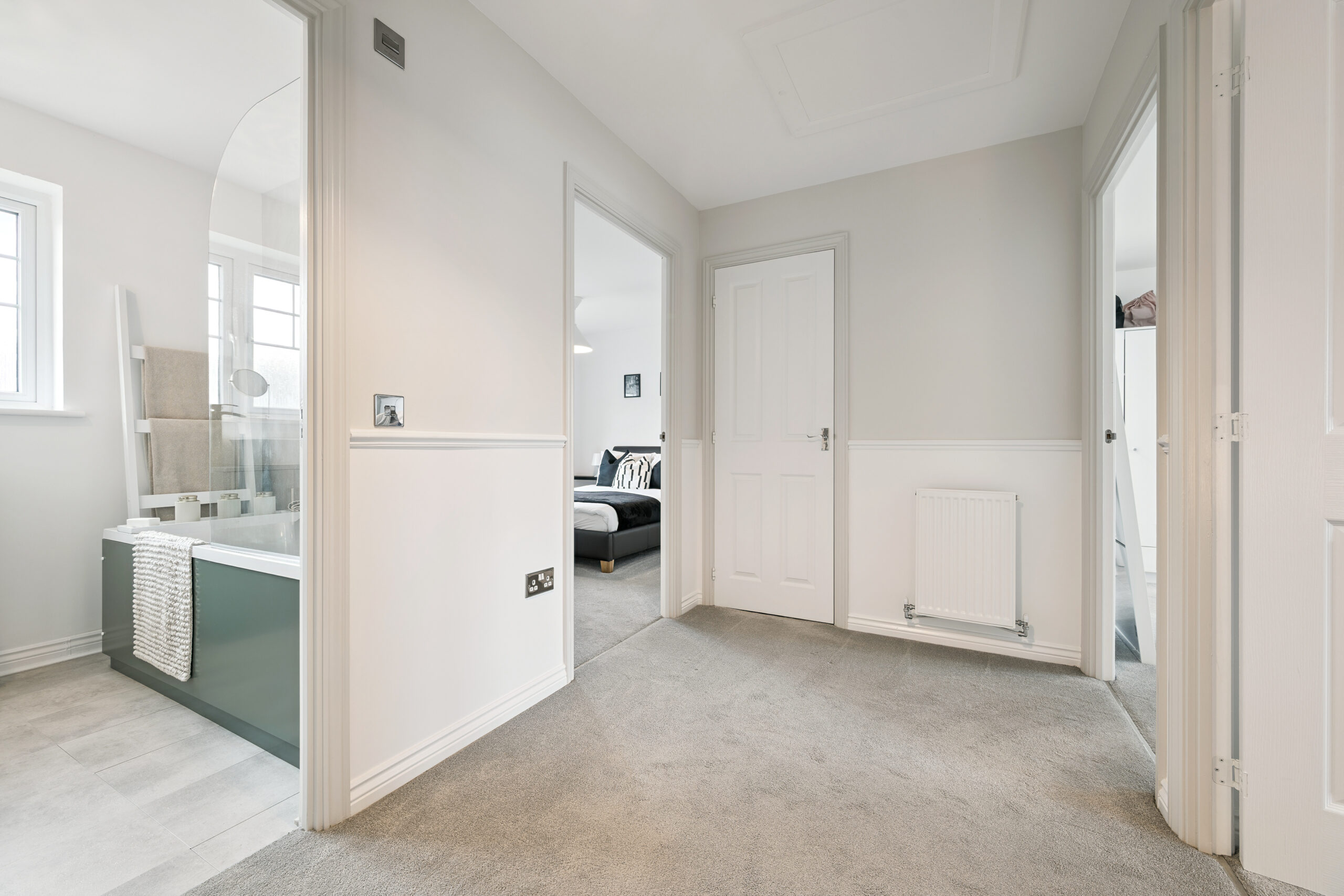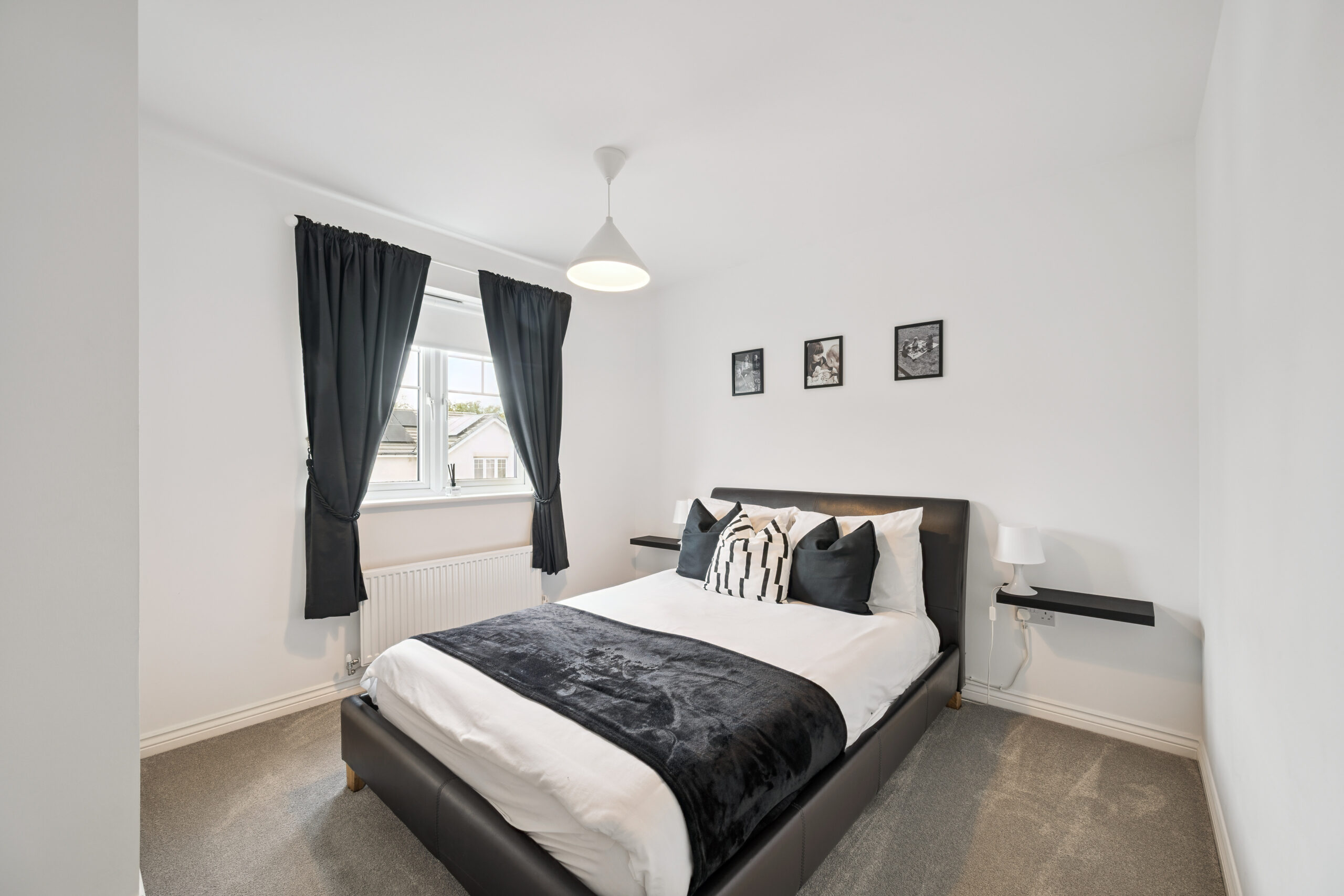 Upstairs, the landing introduces three spacious double bedrooms. The principal bedroom is a standout, comfortably hosting a king or even super king-size bed, with space for bedside cabinets and a chest of drawers. It also benefits from a private en-suite with a standing shower, splashback tiling, and a modern, neutral finish. The second bedroom also accommodates a king-size bed with furniture, while the third bedroom is ideal as a double room, perfect for guests, children, or a home office.