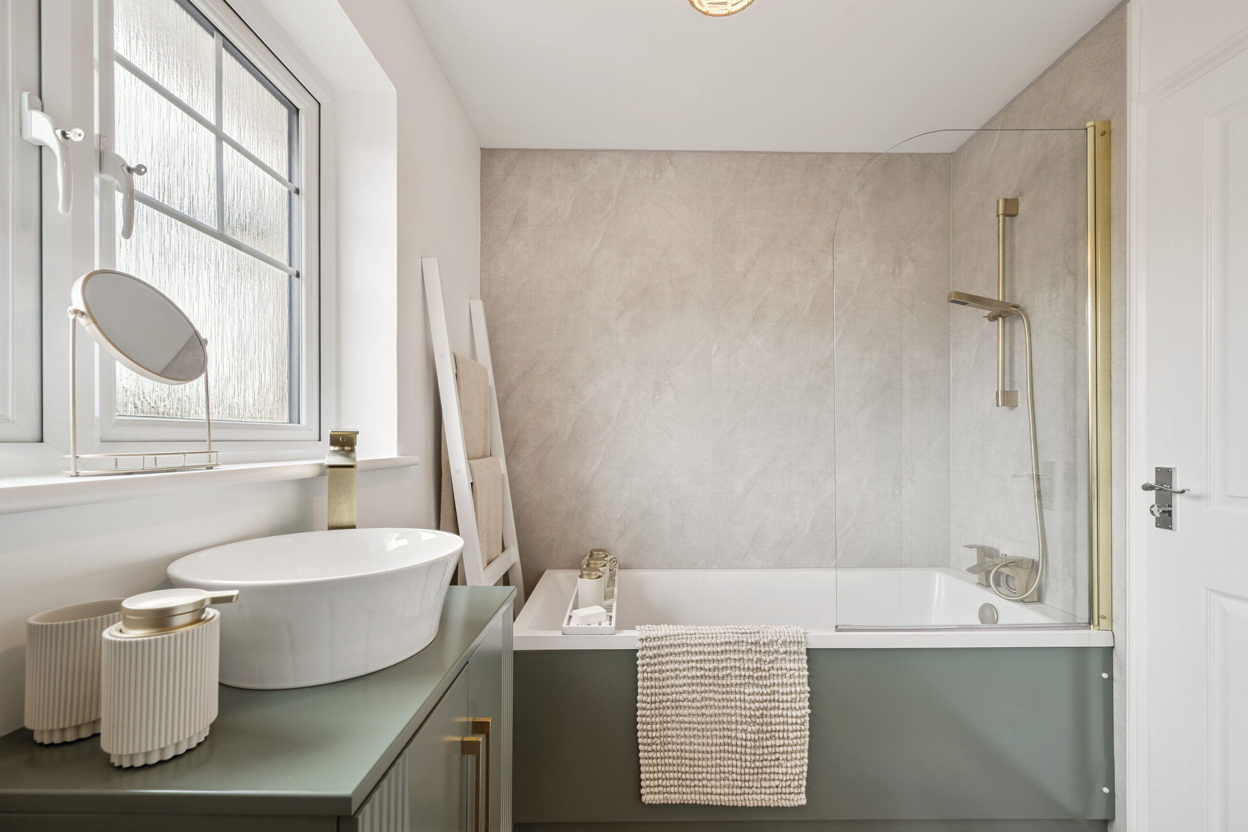 The family bathroom has been recently upgraded to an exceptional standard, offering a stylish three-piece suite with a bathtub, overhead shower, and elegant wet wall tiling throughout. Gold accents bring a touch of luxury to this inviting space.