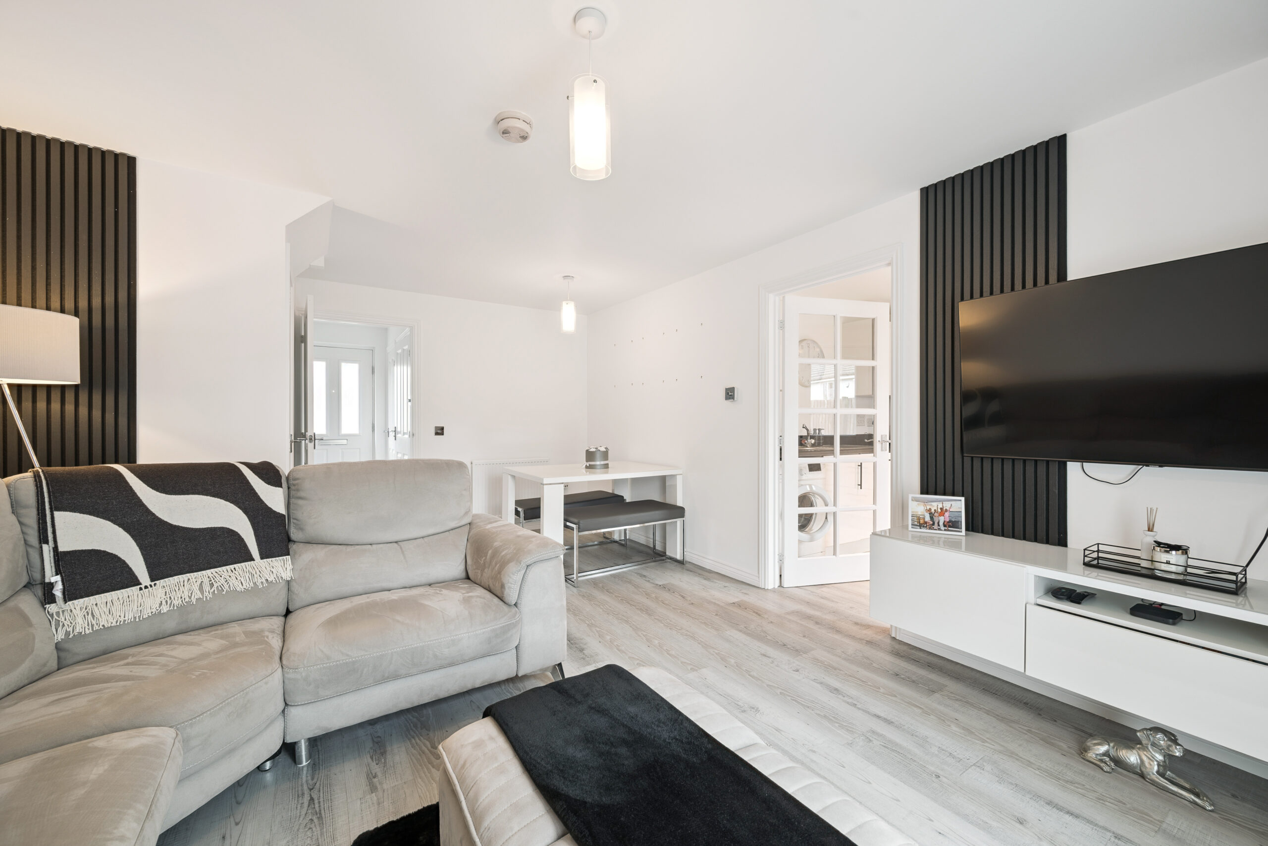 As you step inside, you are greeted by a bright and welcoming hallway that sets the tone for the home. Straight ahead, the spacious open-plan lounge and dining area provides a versatile setting for both everyday living and entertaining. With ample space for a large sofa, media wall, and a dining table for four to five people, this room is perfect for family gatherings. Patio doors open directly onto the rear garden, seamlessly blending indoor and outdoor living. A handy under stair storage cupboard adds practicality.