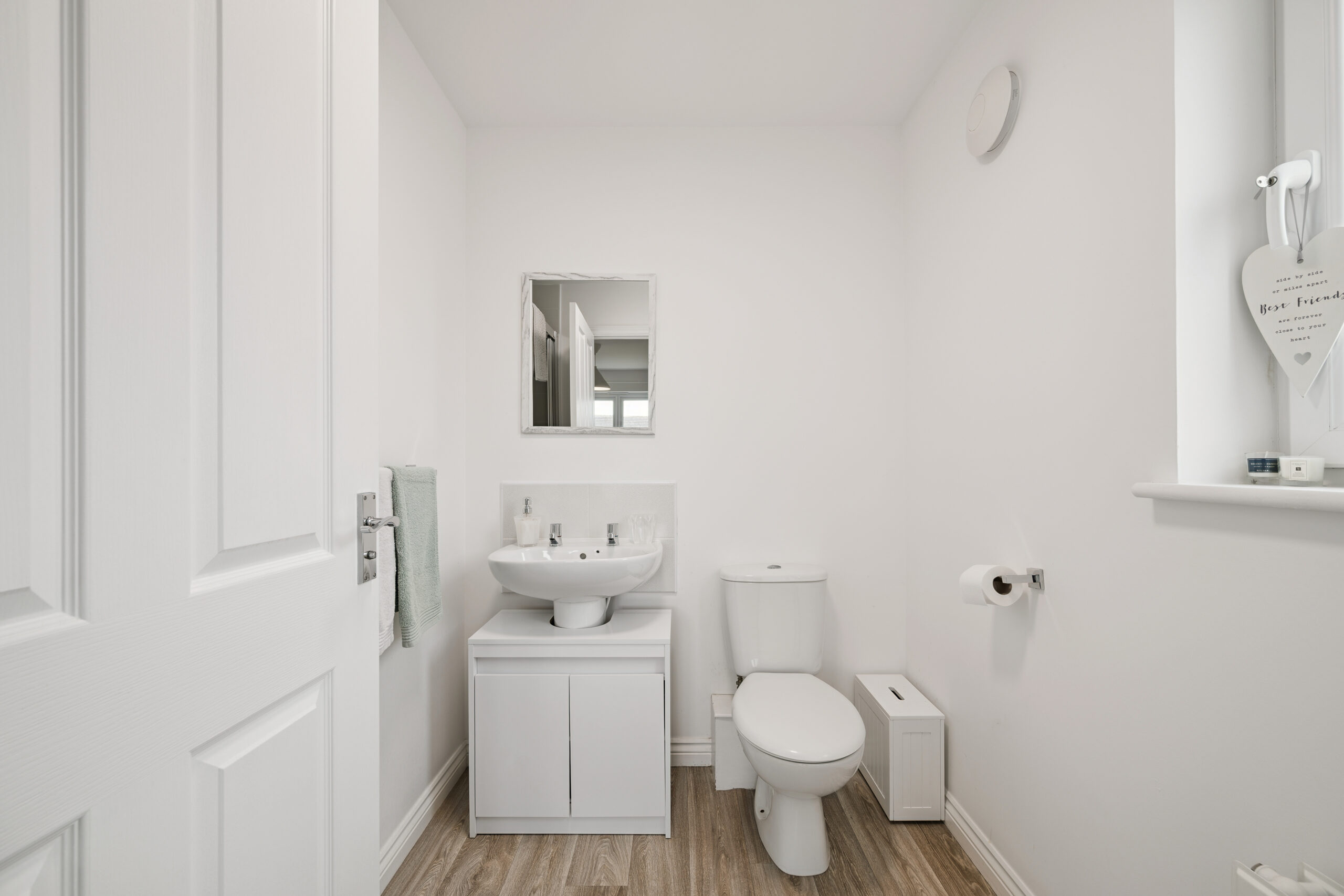 To the side of the property, the modern kitchen offers both style and functionality. Finished with white-gloss cabinetry and black worktops, it features an integrated oven and grill, fridge freezer, four-point gas hob, dishwasher, and washing machine. The layout provides excellent worktop space, with room for a breakfast table for casual dining. Completing the ground floor is a well-sized WC, finished in neutral tones with splashback tiling.