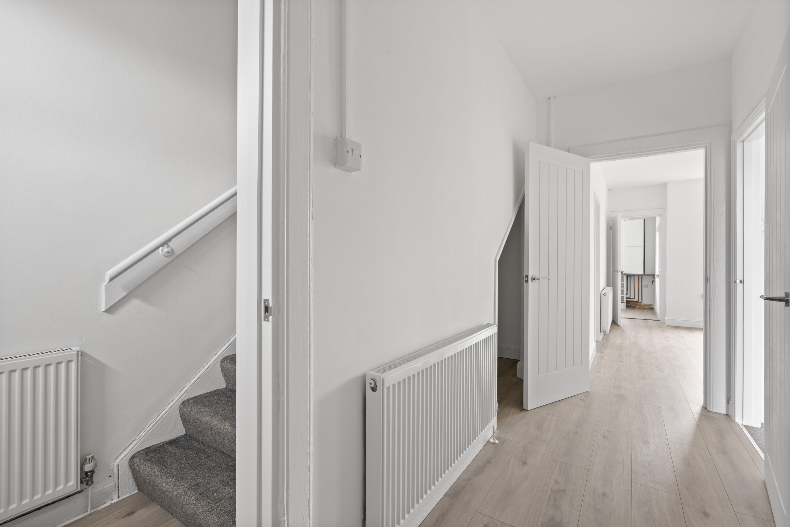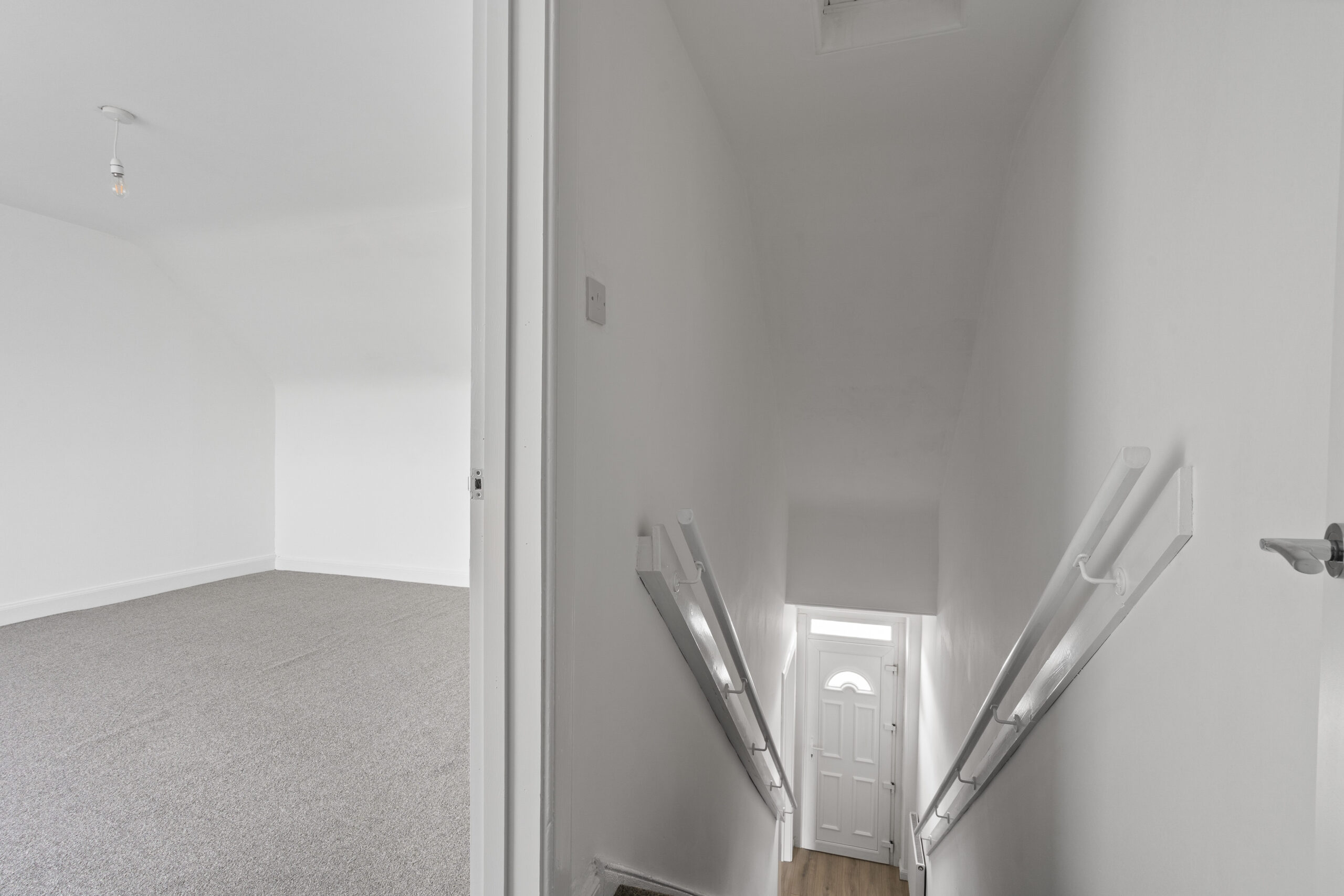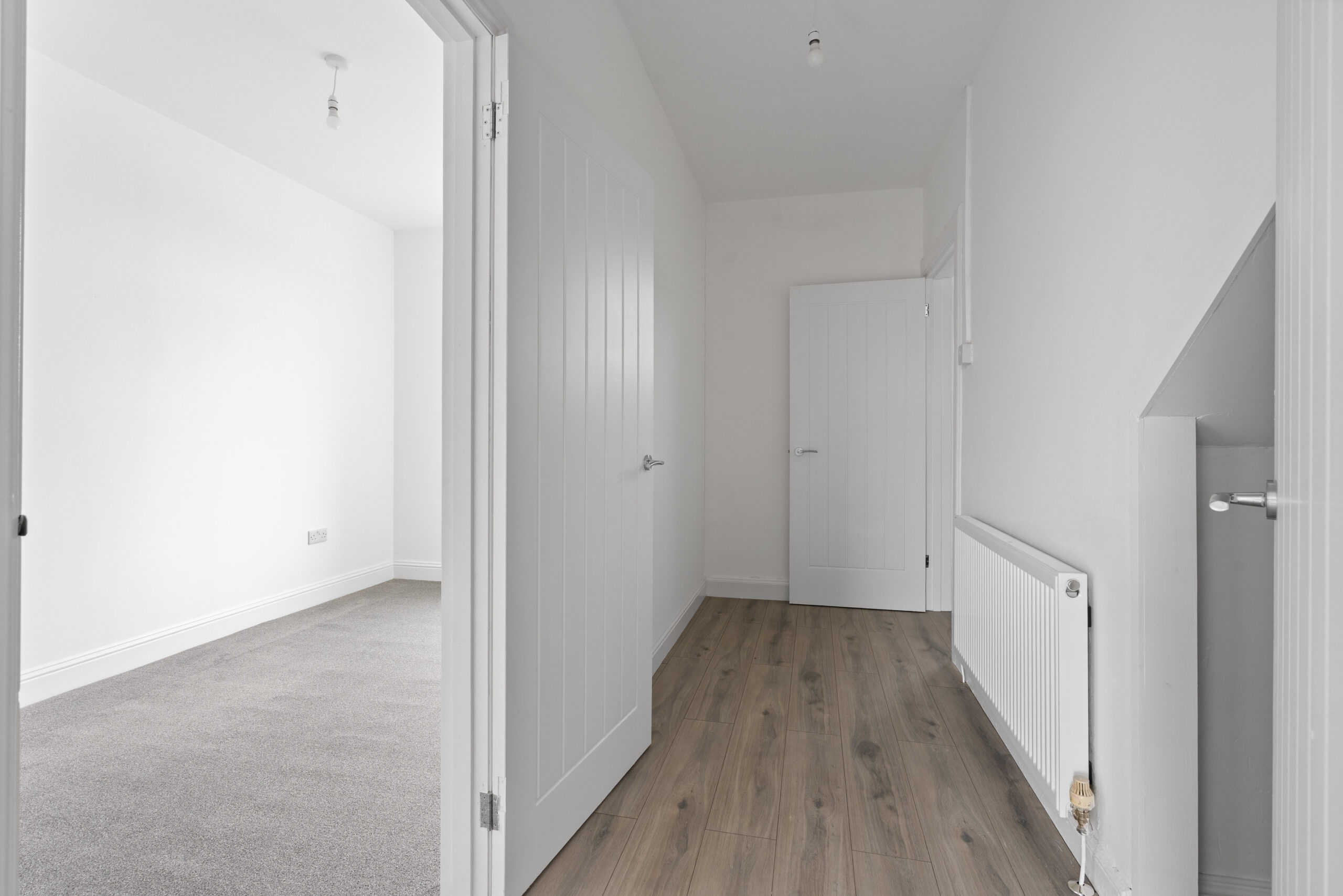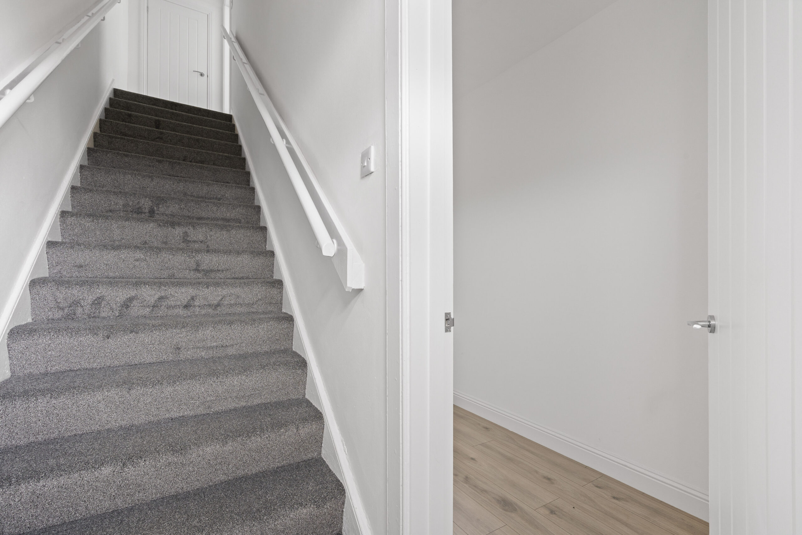 Upon entering the property through the front door, the staircase is directly ahead, finished with modern grey carpeting and white handrails, creating a welcoming first impression. Turning right leads into the entrance hallway, which provides access to the main living accommodation.