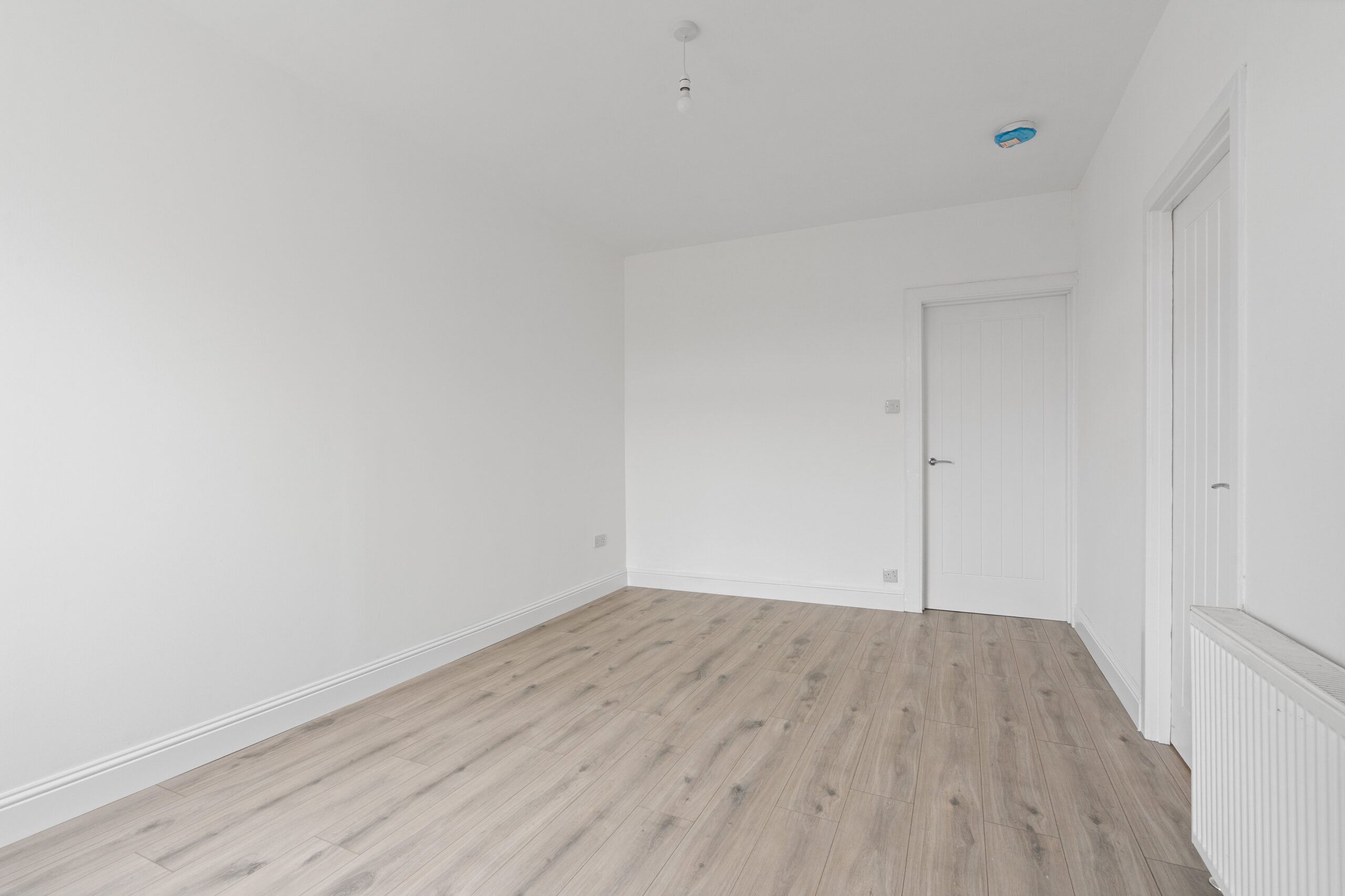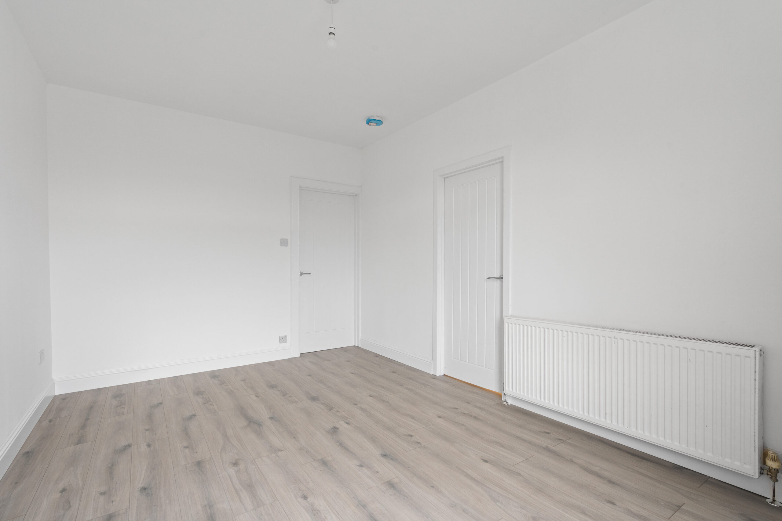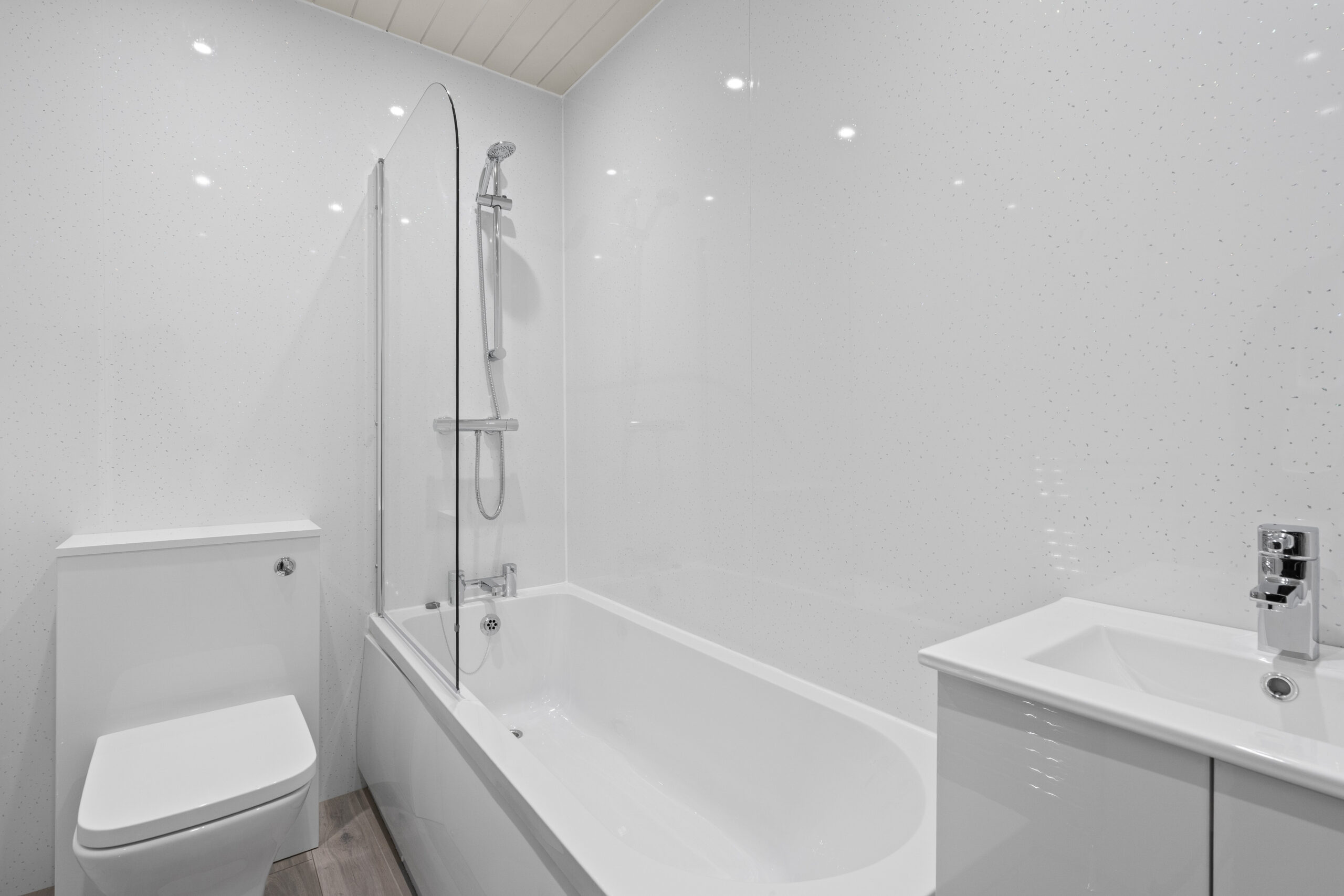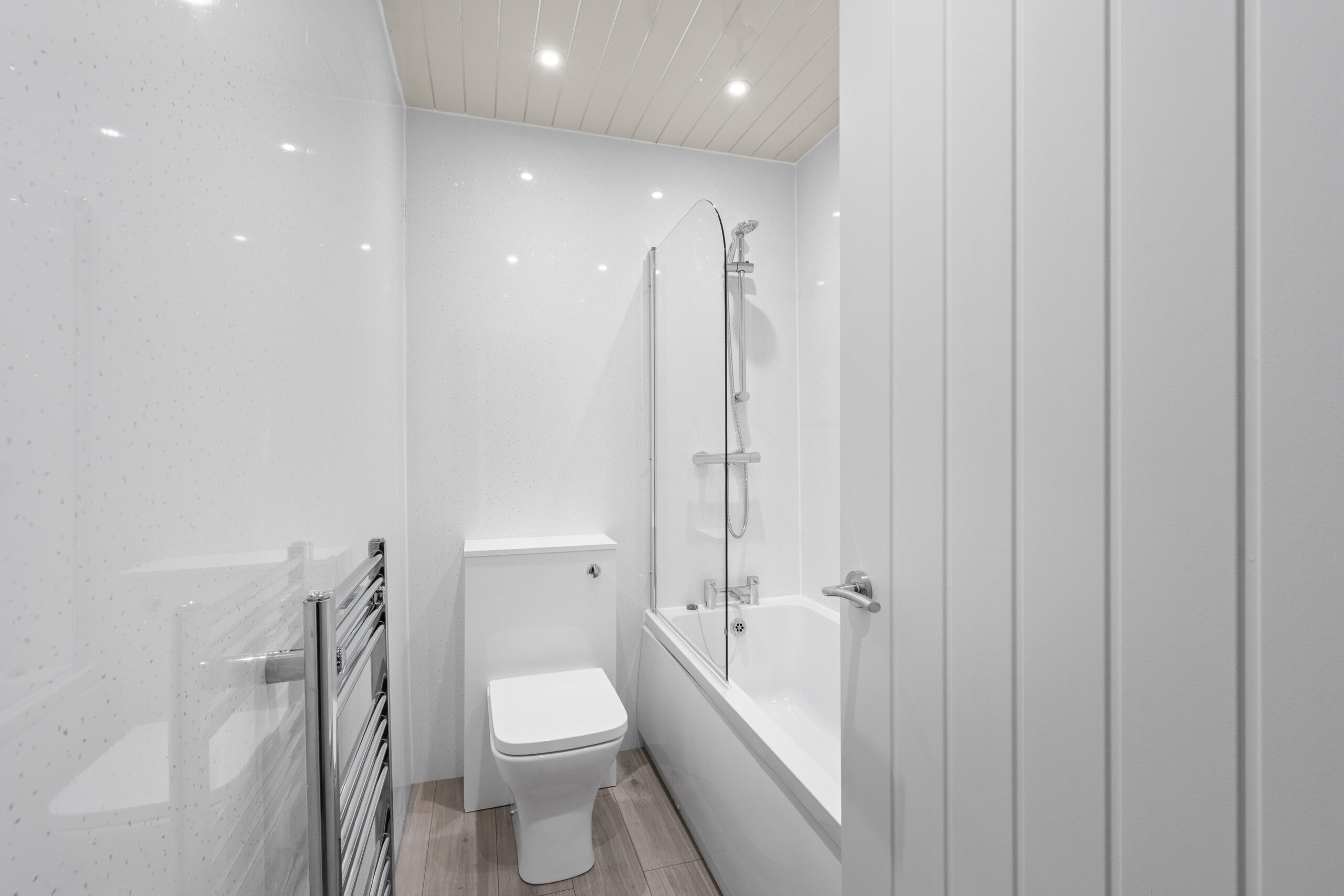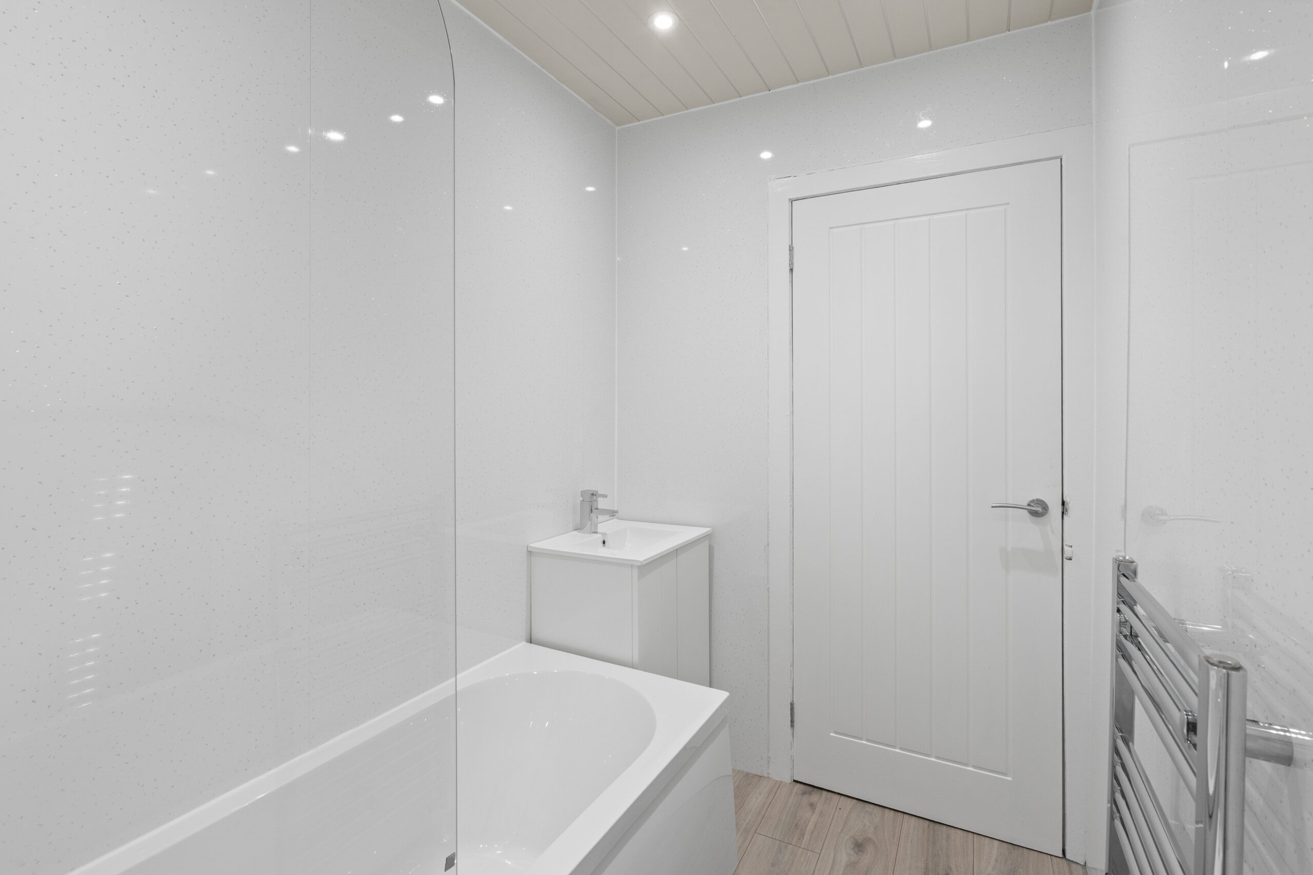 From the lounge, a door leads to a small inner hallway, where the newly fitted bathroom is located on the right. The bathroom features a modern white suite including bath with overhead shower, WC and contemporary fittings. To the left of this hallway is a useful storage cupboard, ideal for additional household storage.