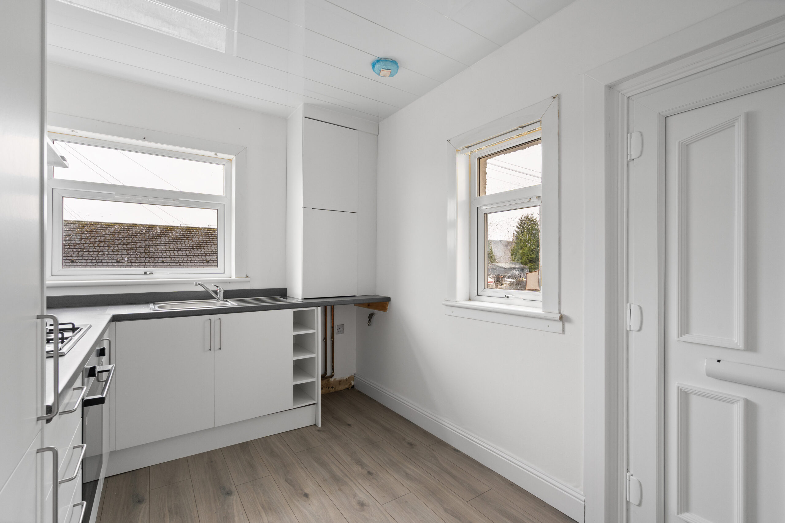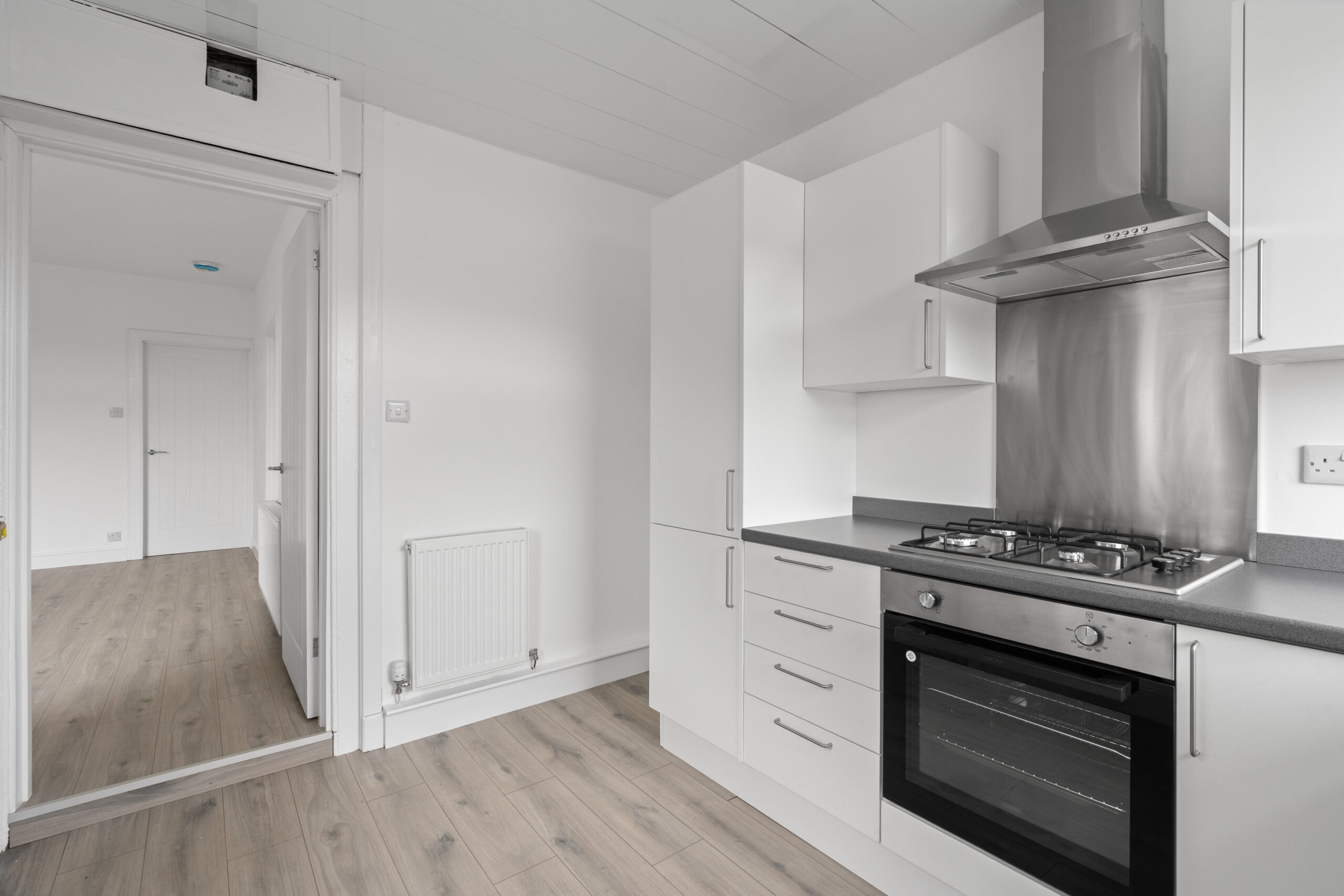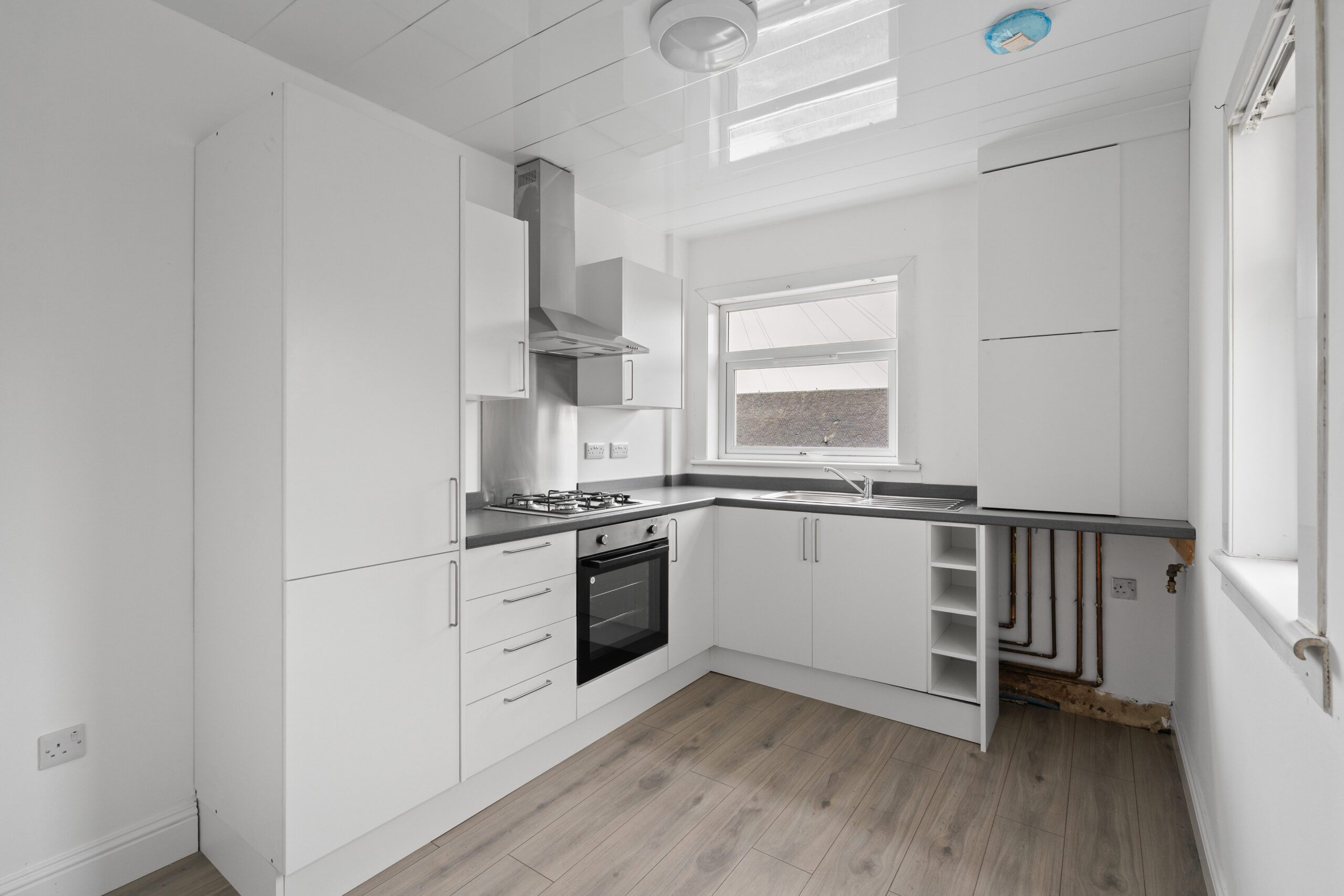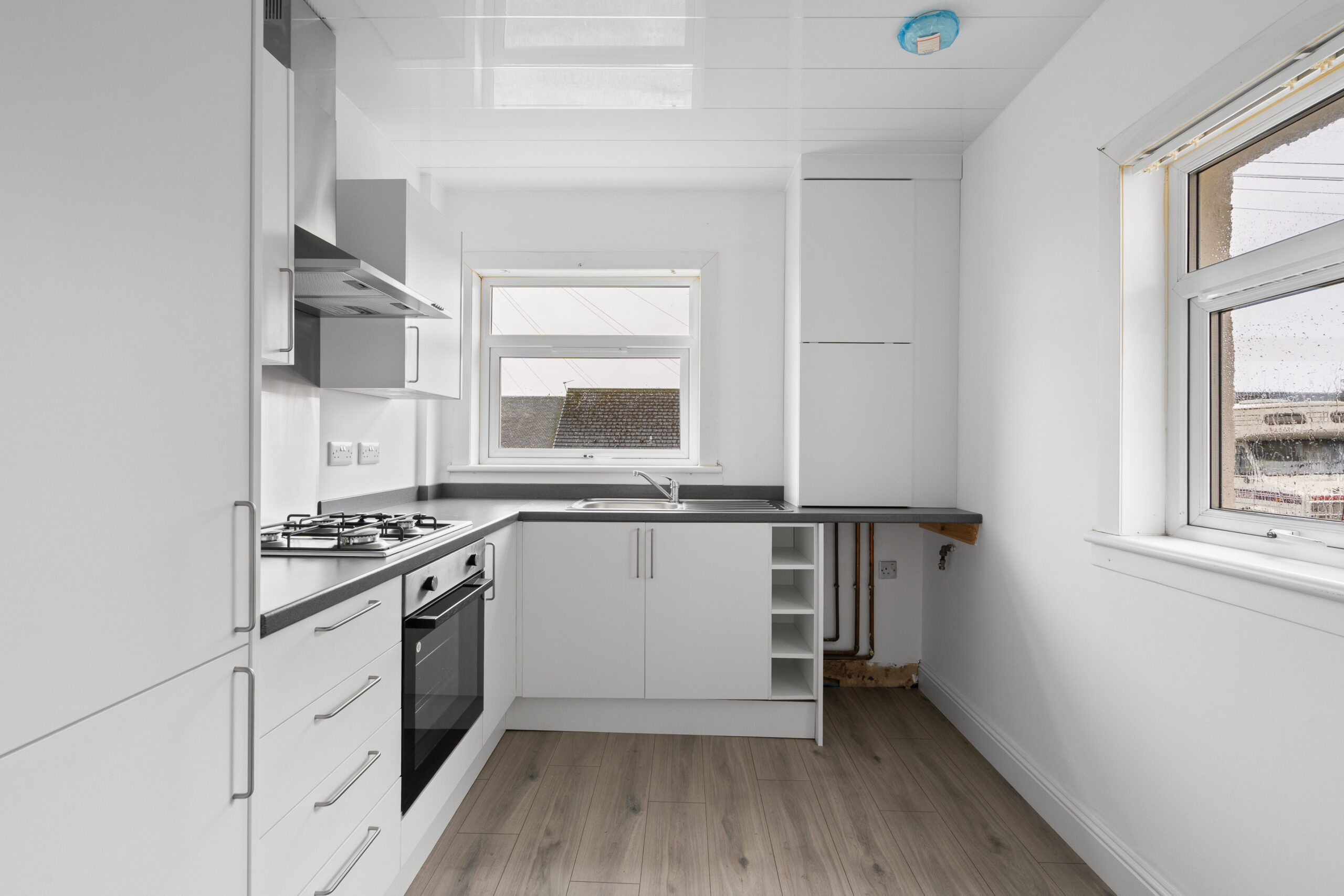 The lounge also provides access to the the kitchen which has been newly fitted with a range of modern white wall and base units, complemented by contemporary dark worktops that provide ample preparation space. The layout offers both practicality and style, with an integrated oven and gas hob with extractor above, stainless steel sink positioned beneath the window, and additional storage units. The clean white cabinetry combined with the contrasting worktops creates a bright and modern finish that fits perfectly with the overall refurbishment of the property.