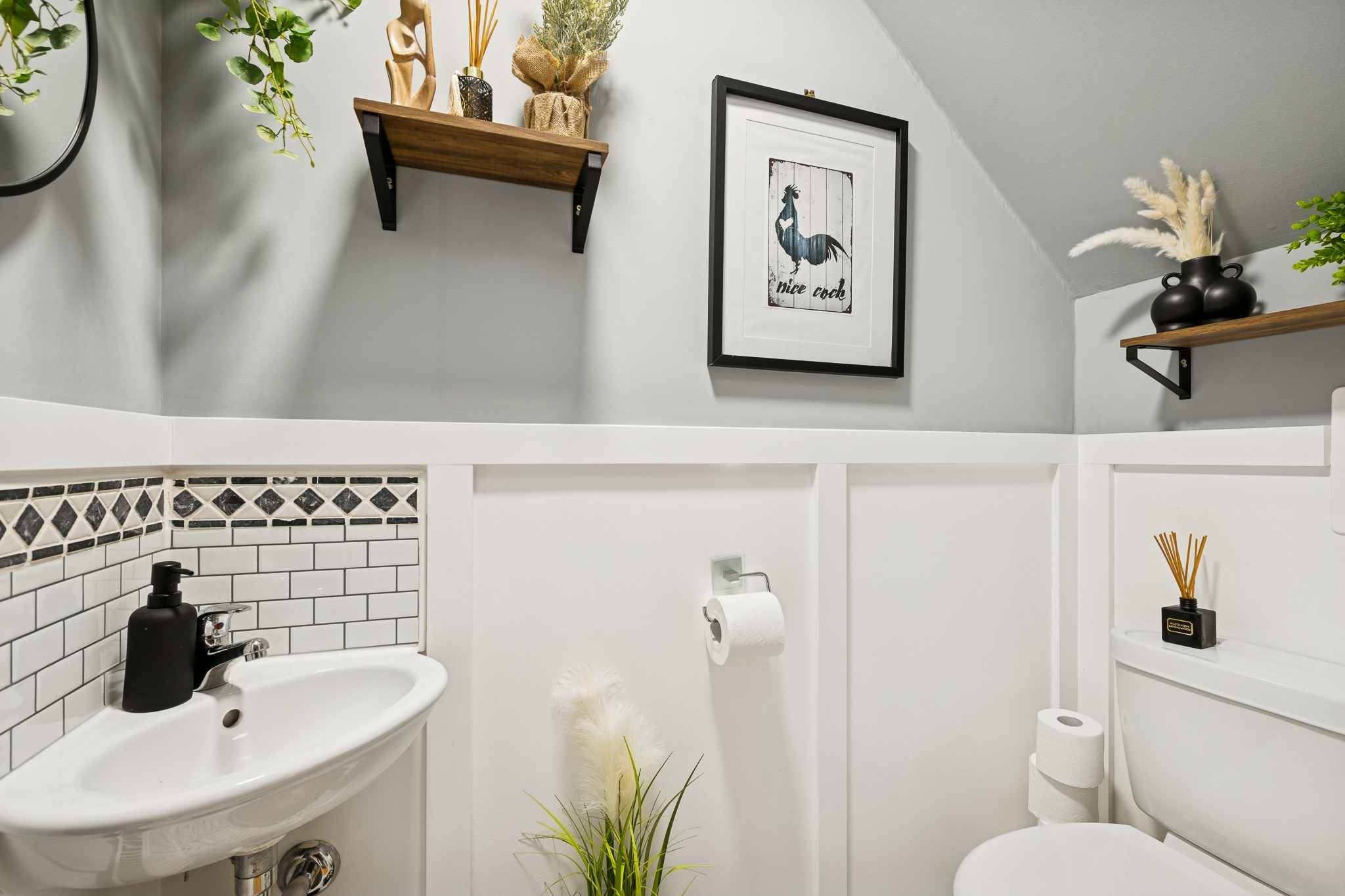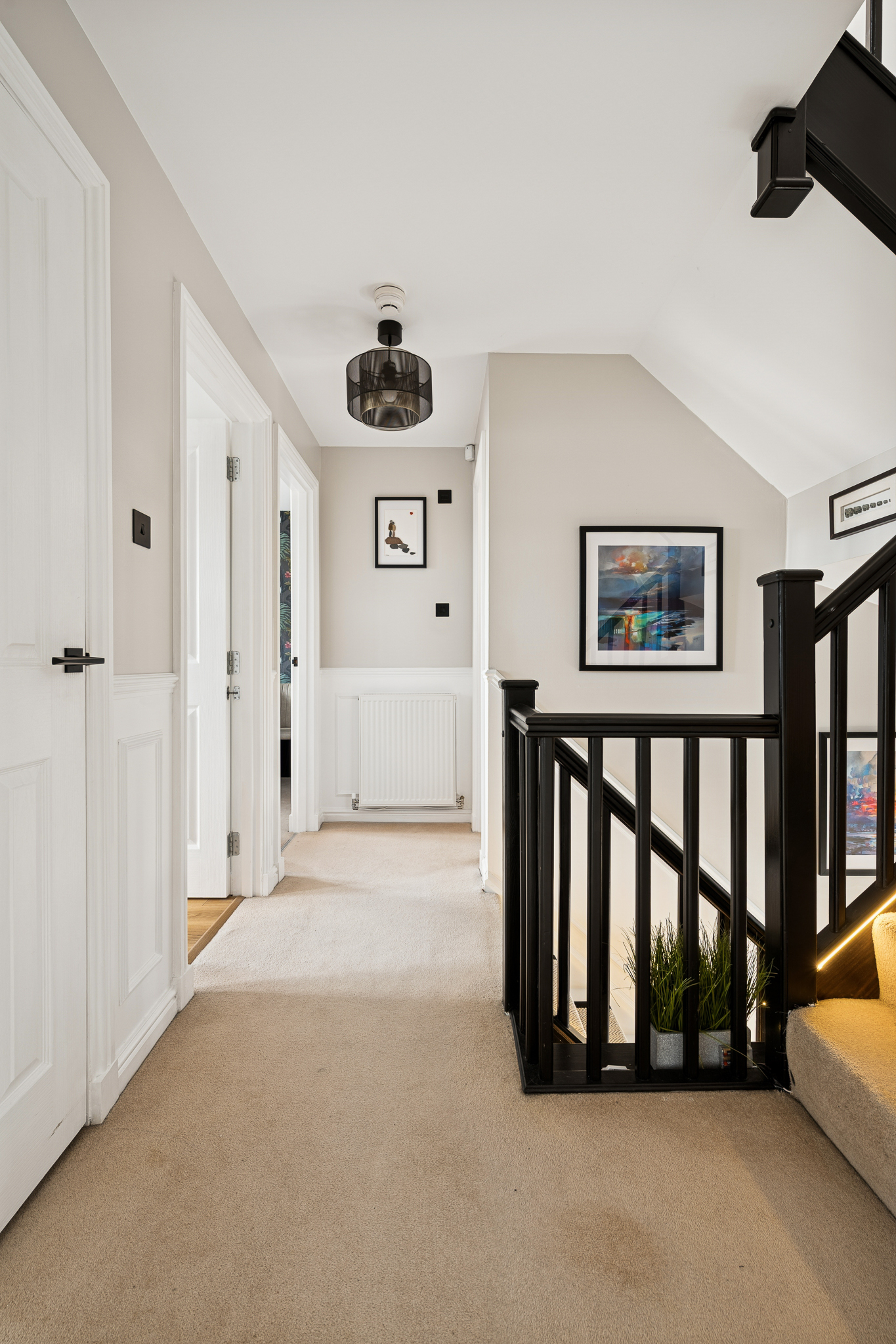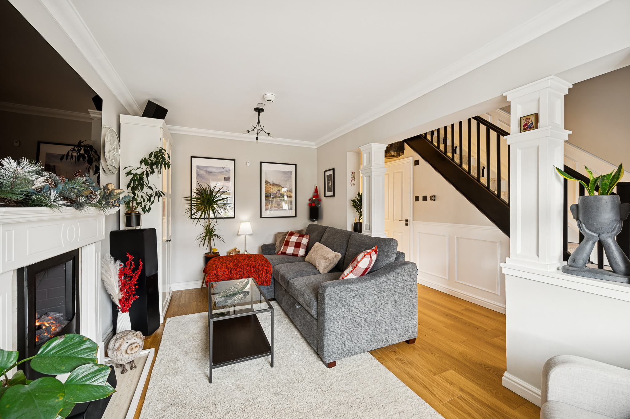 As you enter, you’re welcomed by a bright and inviting hallway that immediately sets the tone for the scale and comfort this home provides. To the left, the lounge offers a warm and spacious retreat, comfortably accommodating a large sofa while featuring an impressive media wall and a feature fireplace. The generous front facing window floods the room with natural light, creating a relaxing and inviting atmosphere. Within the hallway, the downstairs WC is conveniently placed under the stairs and finished with splashback tiling and attractive half height panelling.