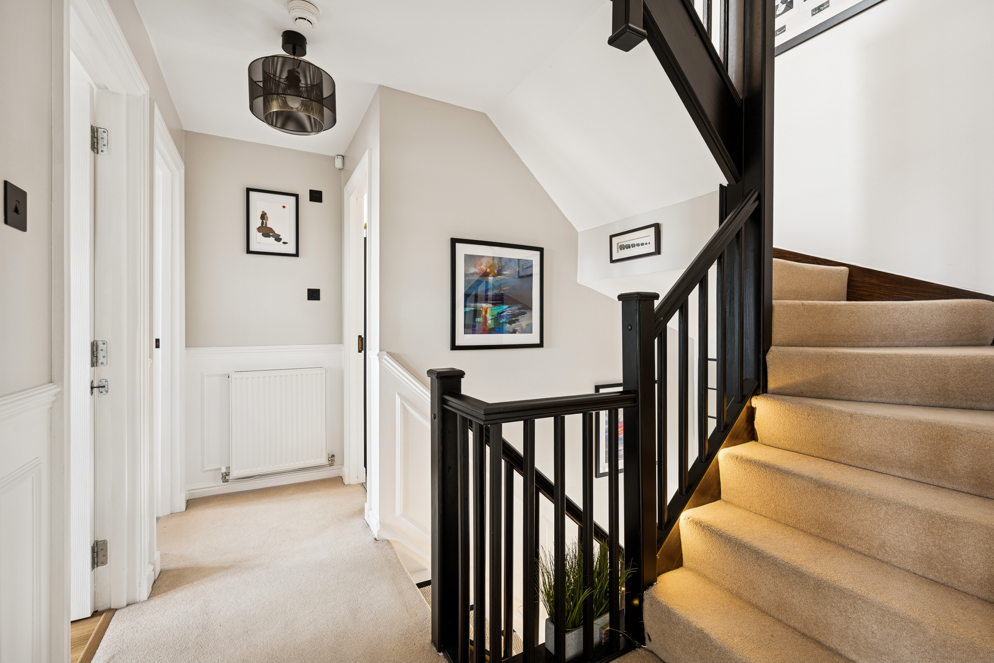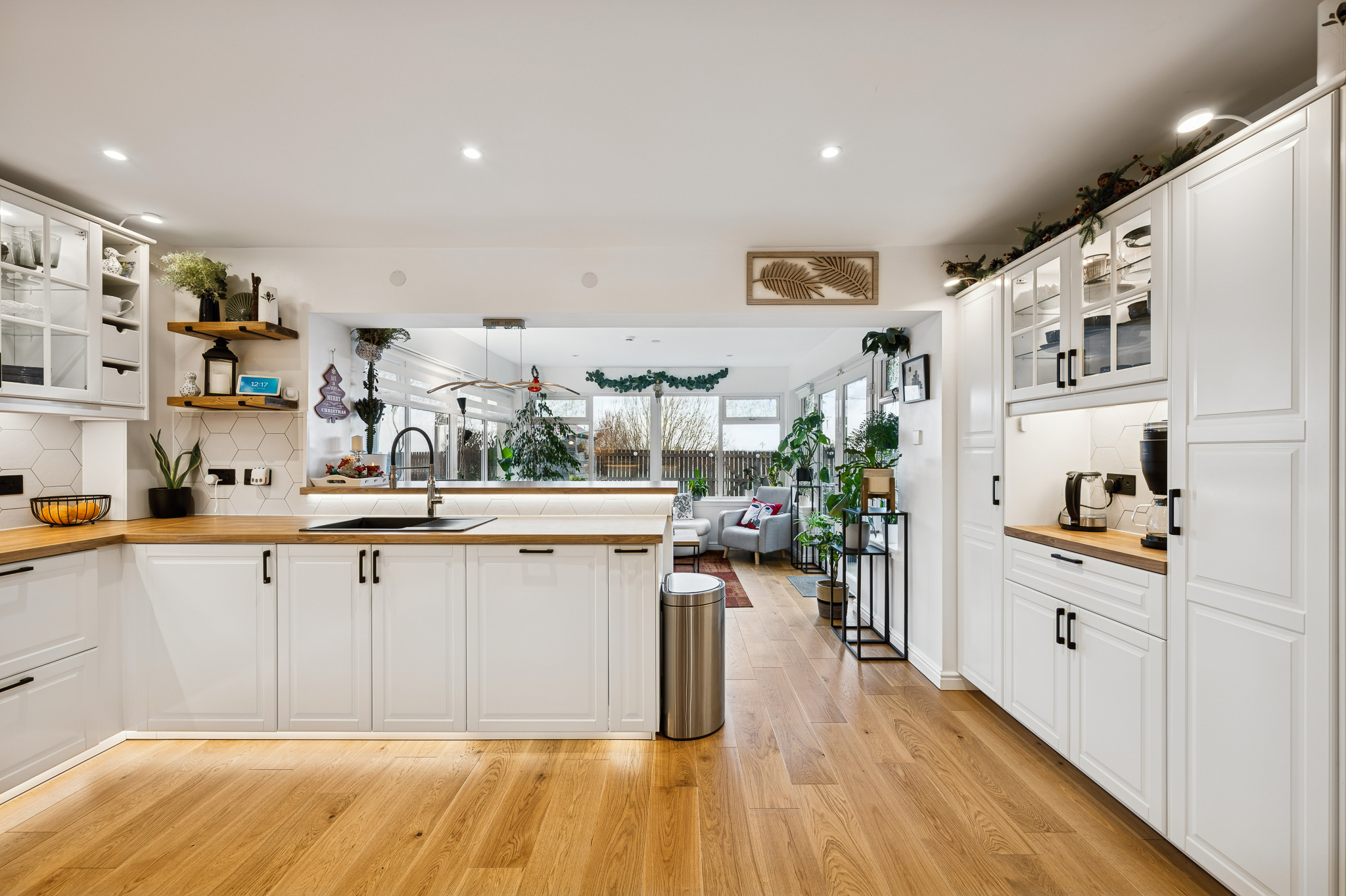 To the rear, the open plan kitchen is connected to the sun room, creating the ideal hub for family life. The kitchen features sleek cabinetry paired with wooden style worktops, generous workspace and a full range of integrated appliances including an oven, grill, induction hob, dishwasher and space for an American style fridge freezer. This space is both practical and stylish offering everything you need in a contemporary family kitchen. Just off the kitchen is the sunroom, a wonderfully bright and versatile space surrounded with 180 degree windows overlooking the rear garden. Perfect as a second lounge, reading nook or entertaining area the sunroom brings the outdoors in and adds a luxurious extra layer of flexibility to the home.