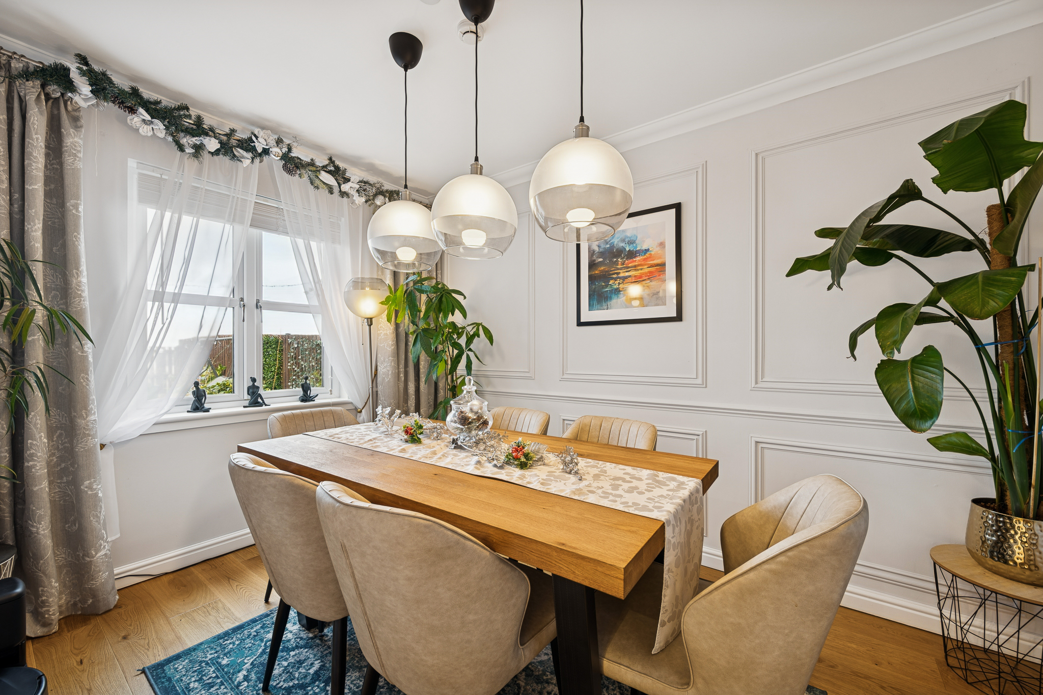 To the right of the kitchen, the separate dining room comfortably fits a six seater dining table and features beautiful character panelling with neutral décor and an elegant ambience ideal for dinner parties and family gatherings.