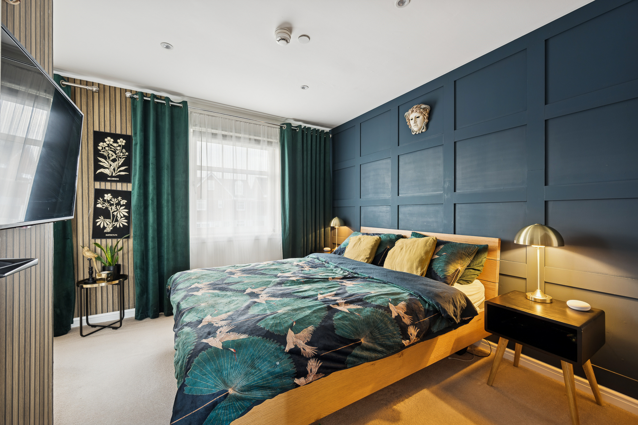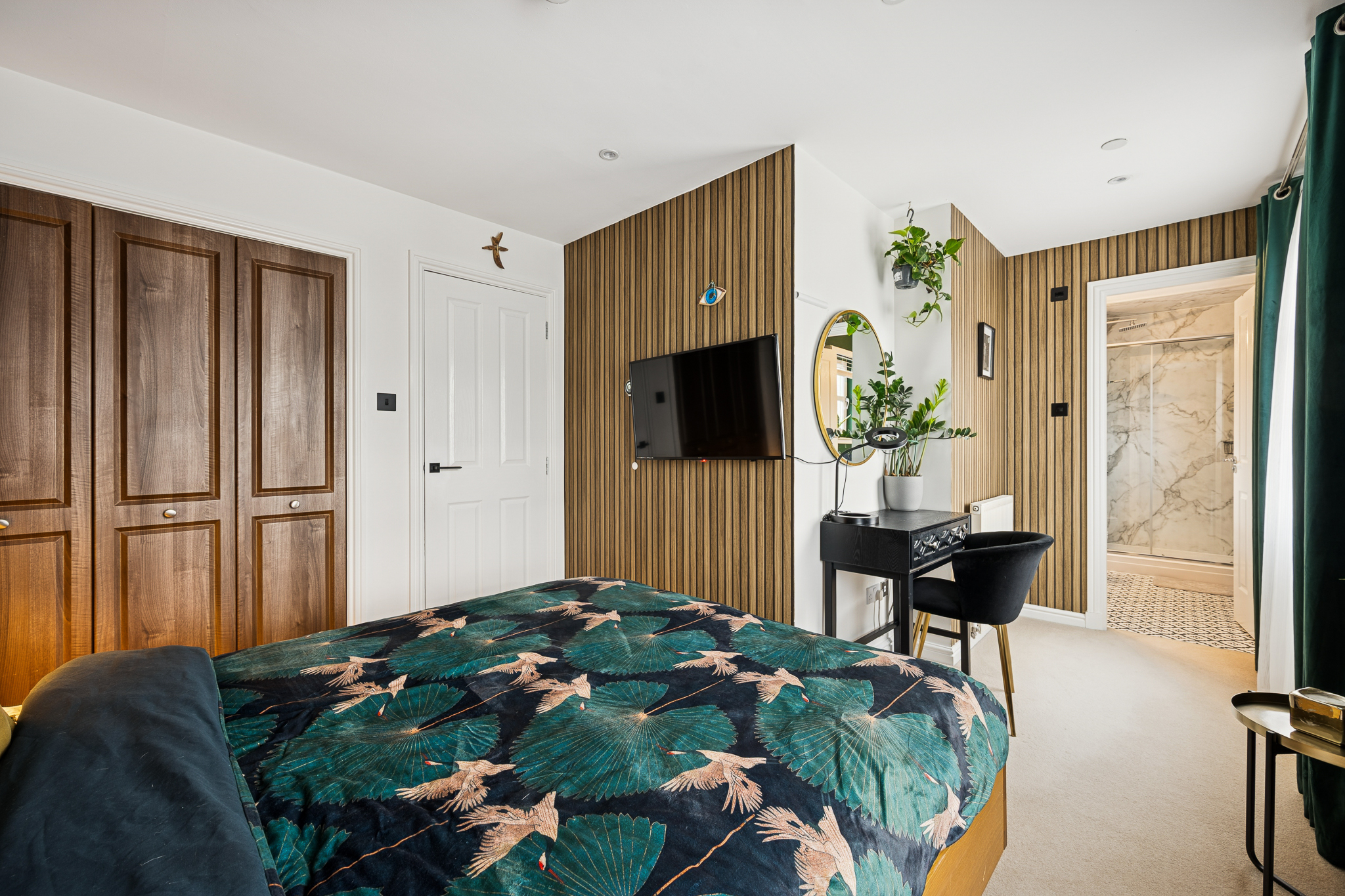 The first floor accommodates four generously sized bedrooms, each offering excellent space and versatility. The principal bedroom is particularly impressive, comfortably hosting a super king size bed with bedside cabinets, and benefiting from dual-aspect windows that enhance the sense of space and light. This room also enjoys its own stylish en-suite, finished with wet wall panelling, chrome accents, a standing shower and a made to measure mirror.