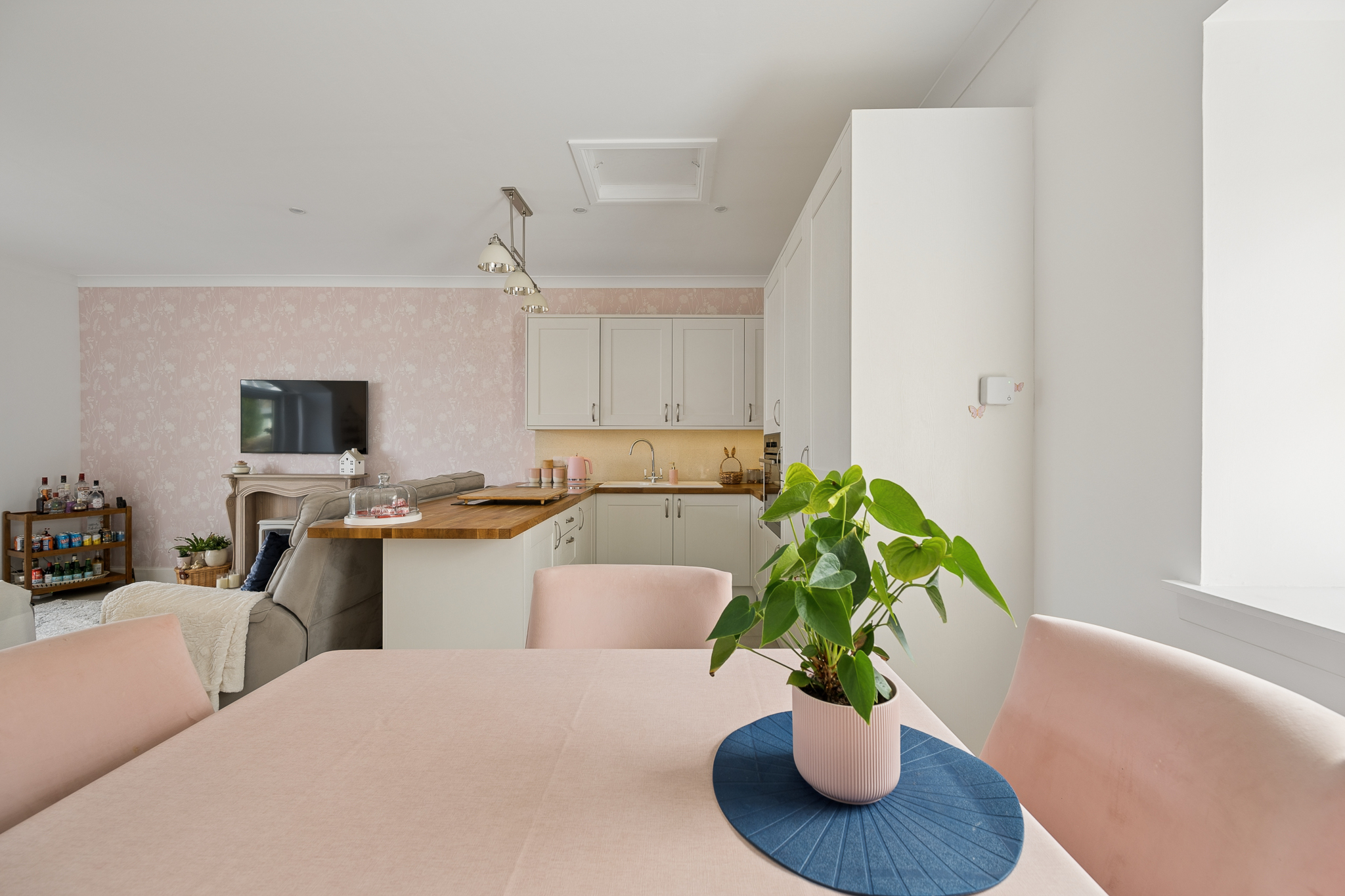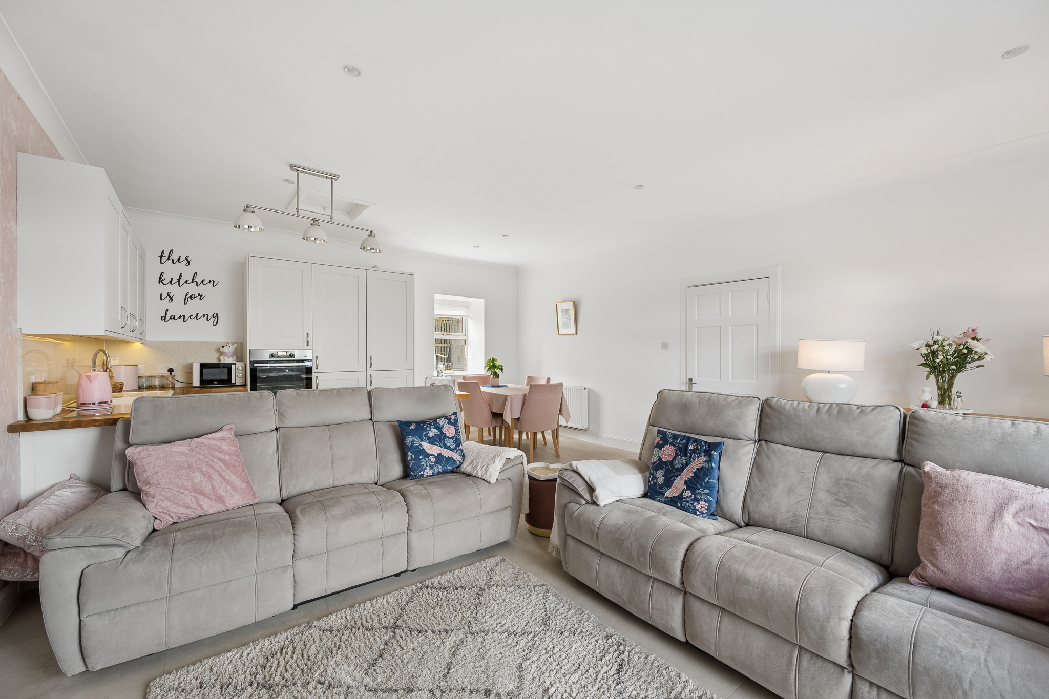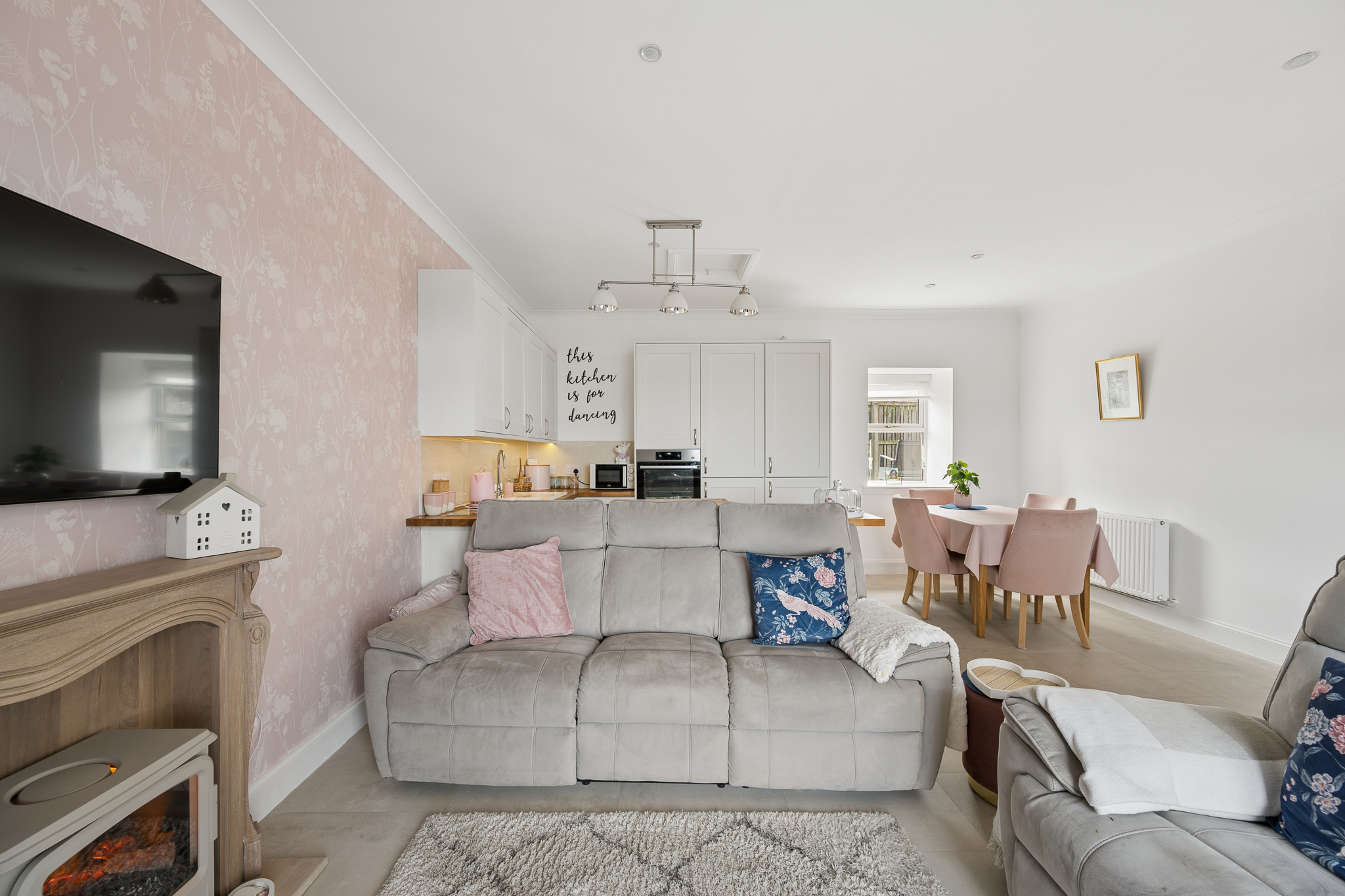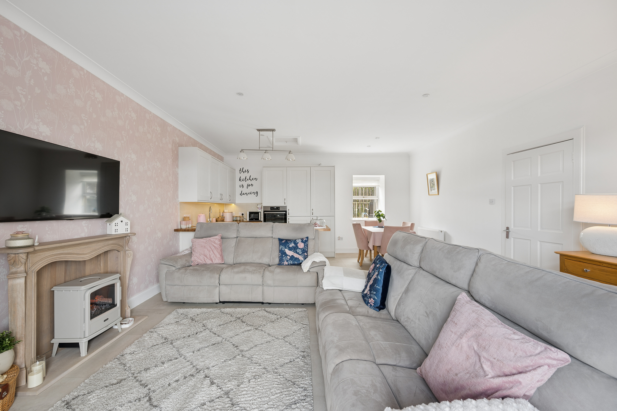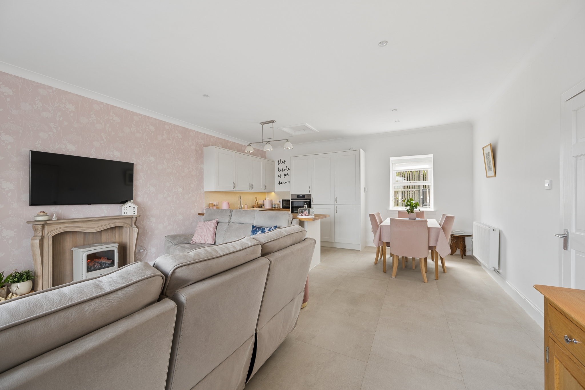 Externally, the property continues to impress. To the front, there is a generous patio area, beautifully arranged with planting and seating, ideal for enjoying outdoor living. To the rear, a small slabbed area offers additional low maintenance outdoor space, while a well kept communal lawn enhances the overall setting. The property further benefits from two allocated parking spaces, ensuring convenience for homeowners and visitors alike.