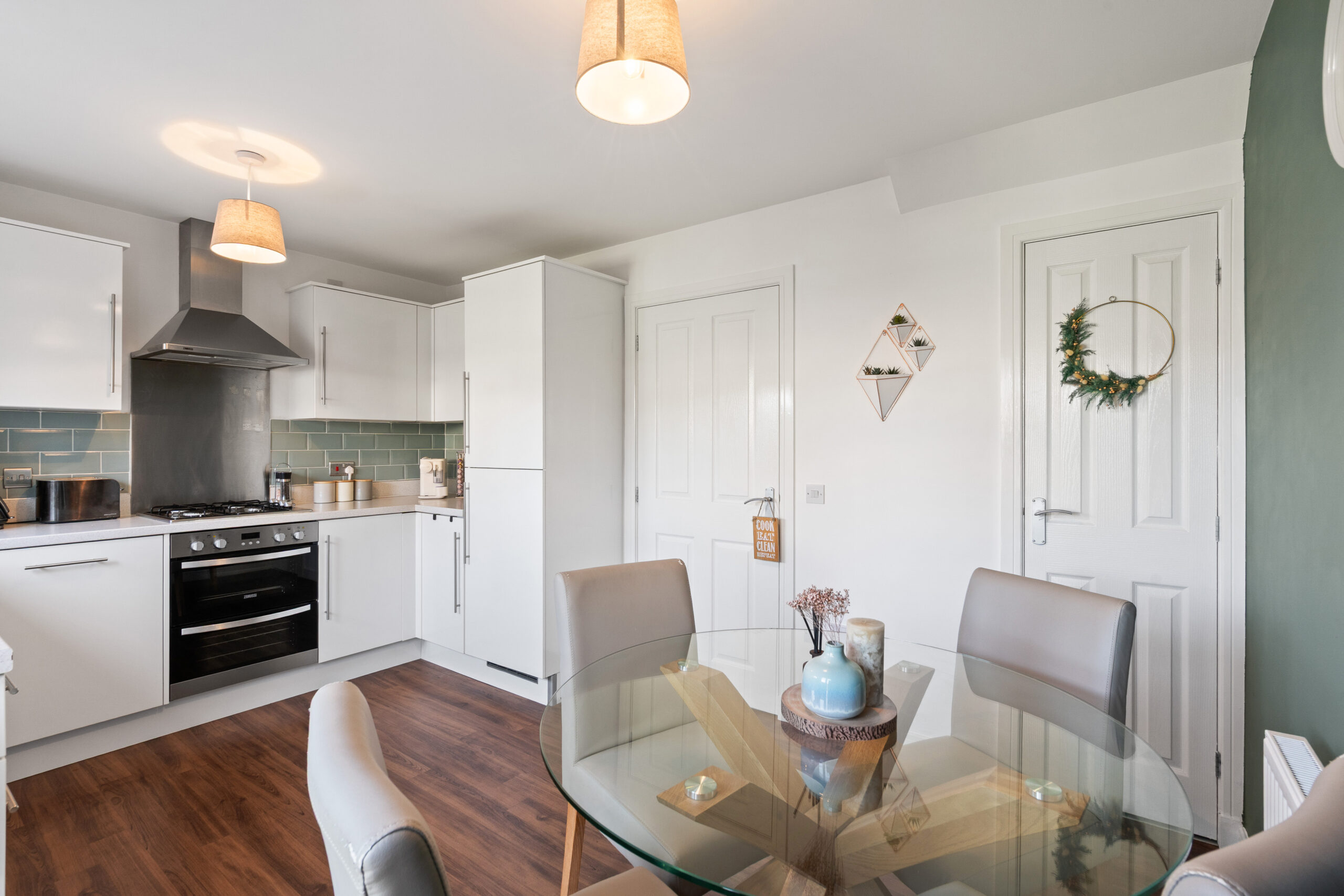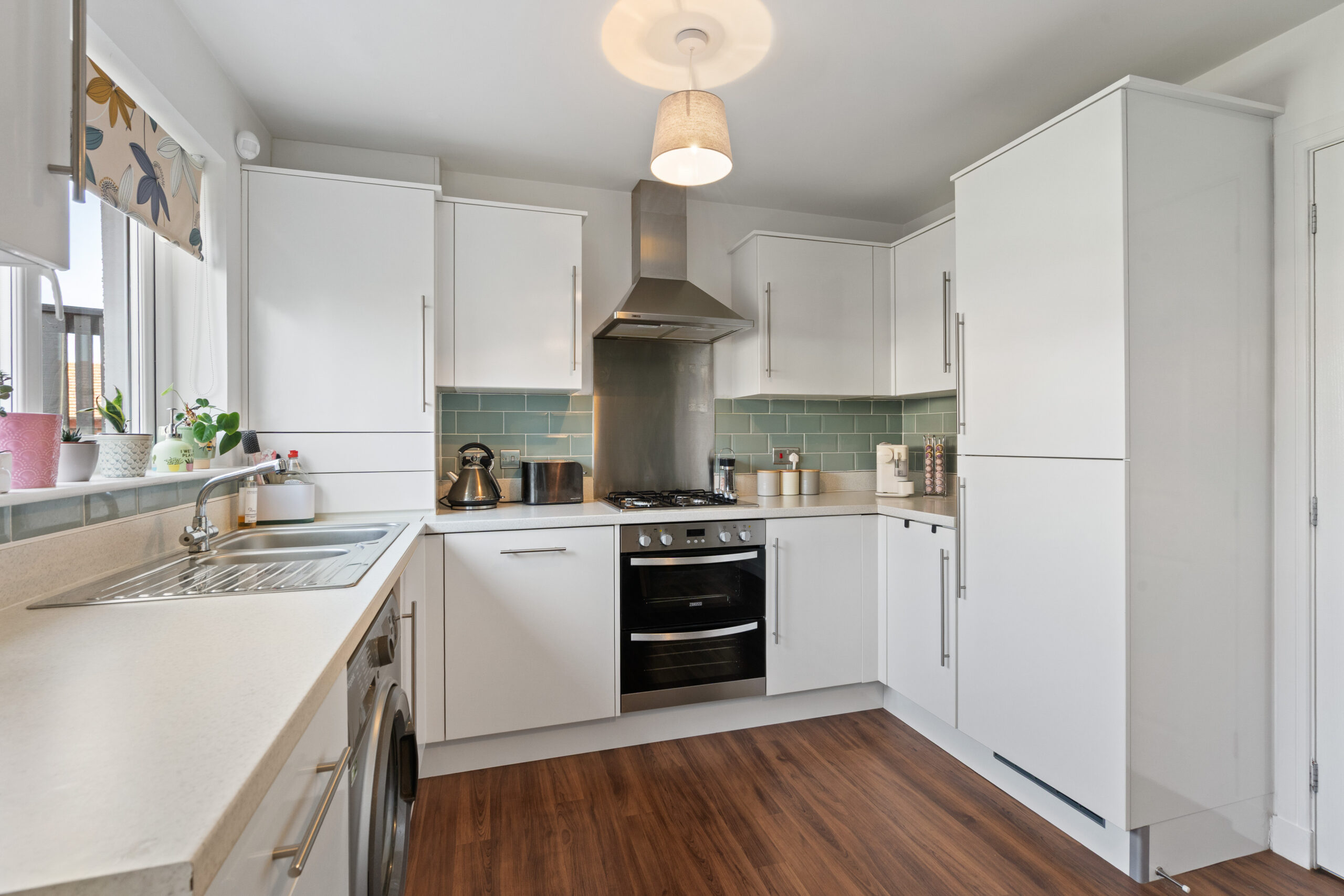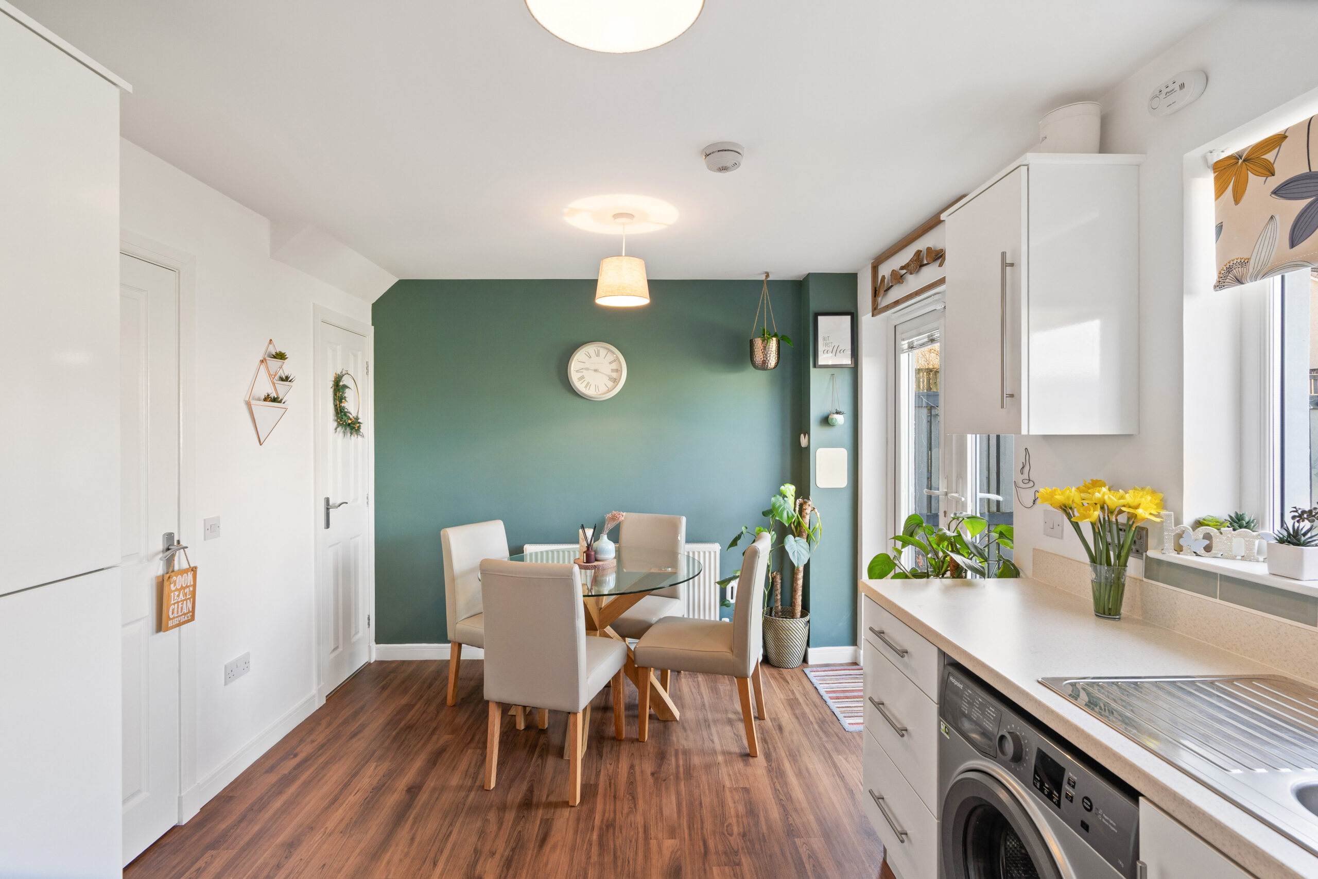To the rear of the property is the open plan kitchen and dining area, spanning the full width of the home. The kitchen is fitted with white gloss cabinetry and complemented by splashback tiling and generous worktop space. Integrated appliances include a fridge freezer and dishwasher, alongside a four point gas hob and oven, with additional space for a washing machine. There is room for dining for two to four people, while a useful storage cupboard is positioned underneath the stairs. Patio doors provide access to the rear garden and allow natural light to fill the space.