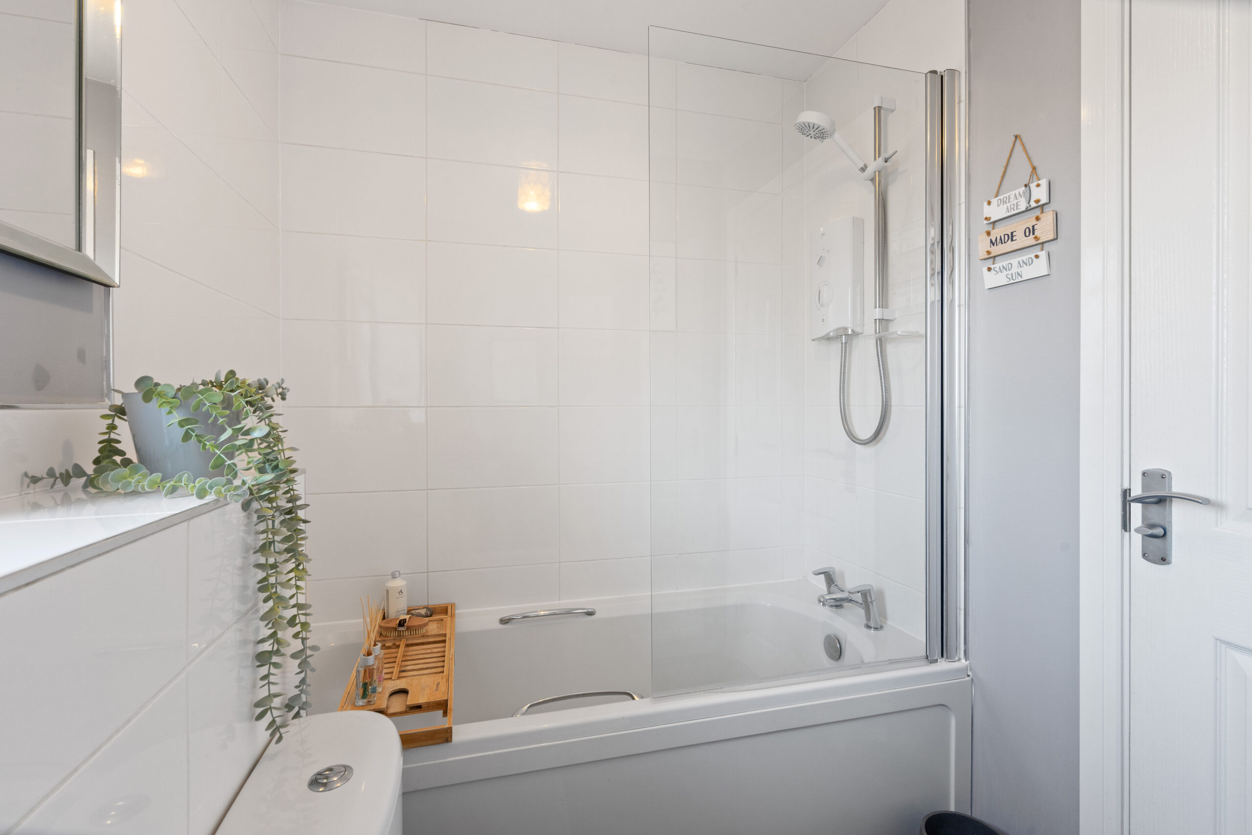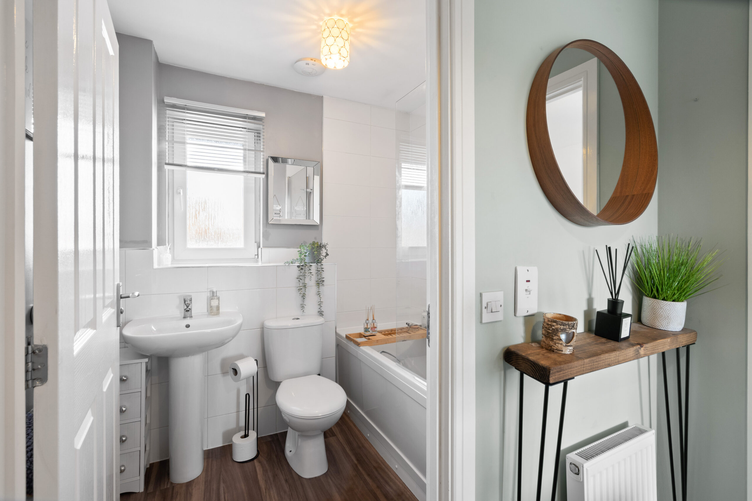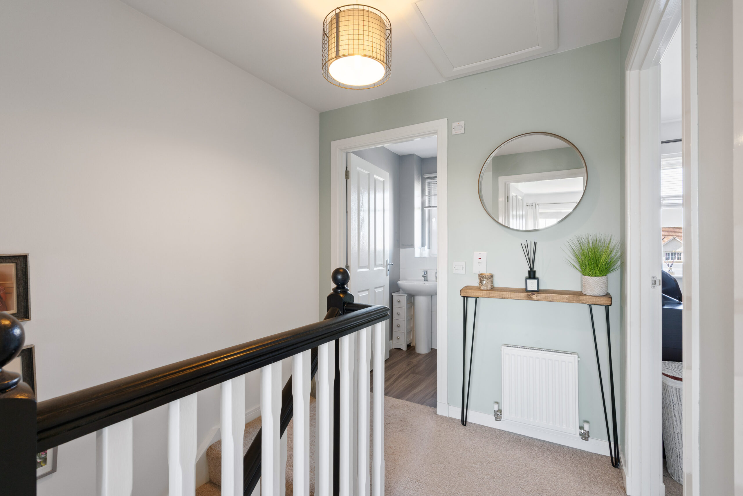 The main family bathroom is also located on the upper level and comprises a modern three piece suite including a bathtub with overhead shower, finished with full tiling and neutral décor. The upstairs landing is spacious and bright, enhancing the overall feel of the home.