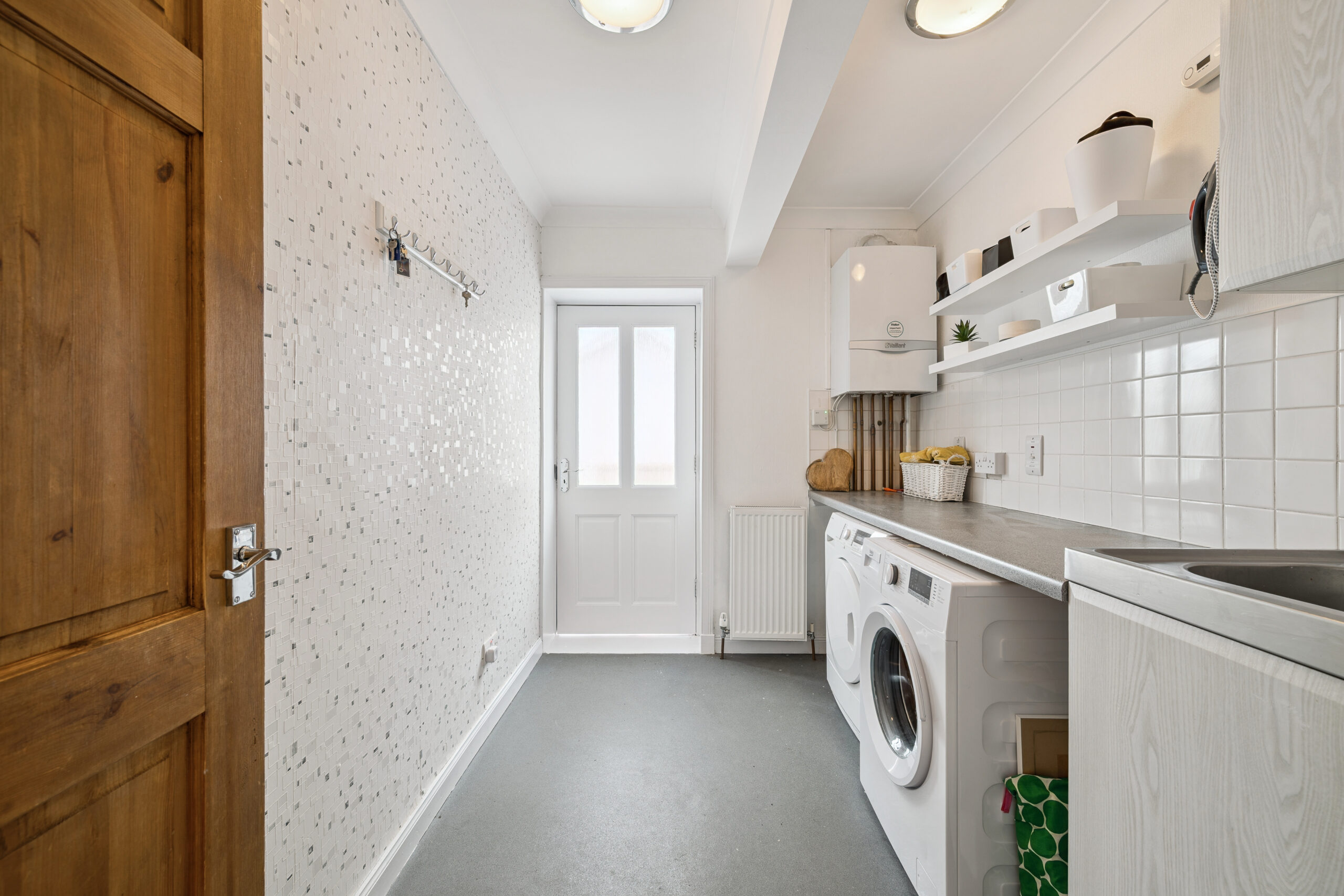 A well appointed utility room provides the perfect space to keep laundry and daily essentials tucked away complete with cabinetry and space for a washing machine and tumble dryer.