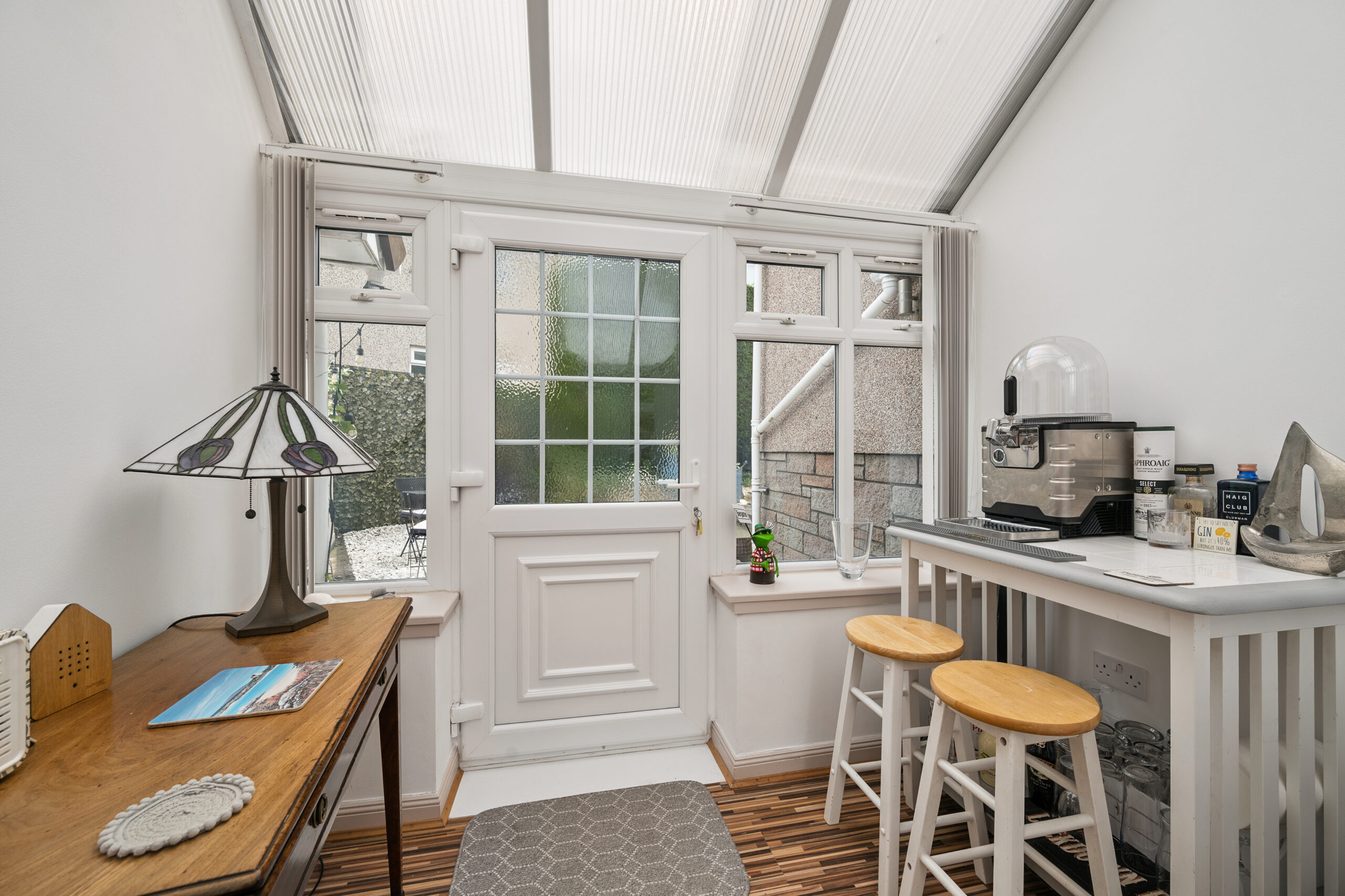 From the utility a short staircase leads to a lower level conservatory space, a unique addition that opens up exciting possibilities. There are two external doors providing easy, separate access from both front and rear gardens. Whether used as a garden room or creative studio this area adds yet more flexibility to this already generous home. This leads directly into the integrated double garage, a standout feature. With an electric roller door it offers excellent security and convenience whether for vehicle storage or a home workshop.