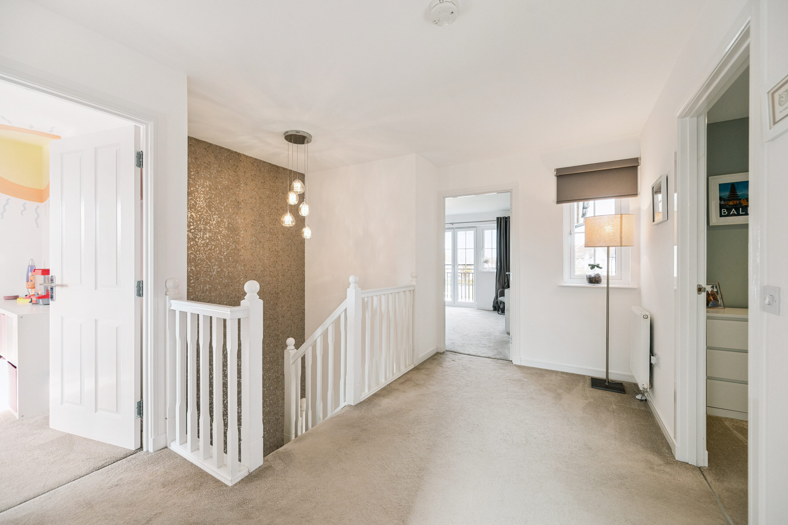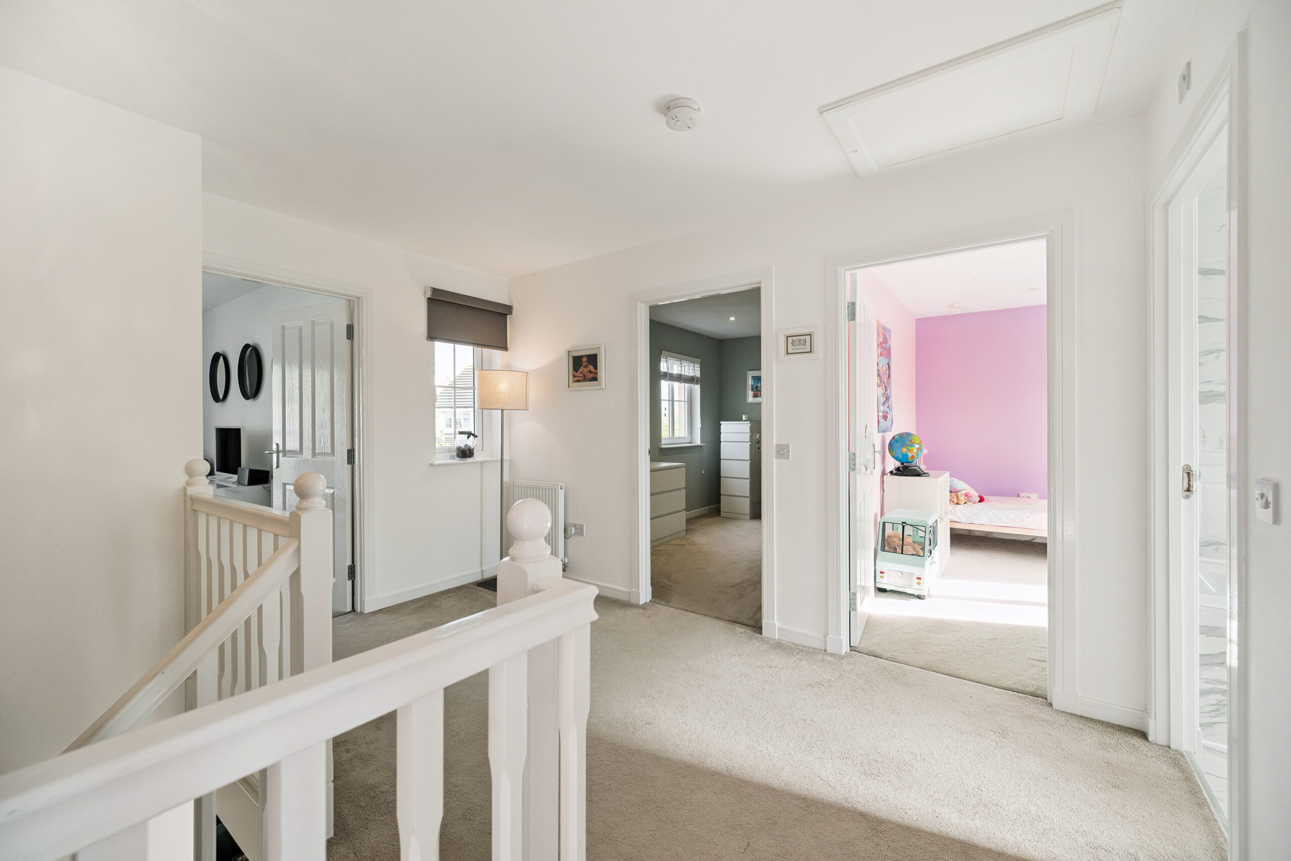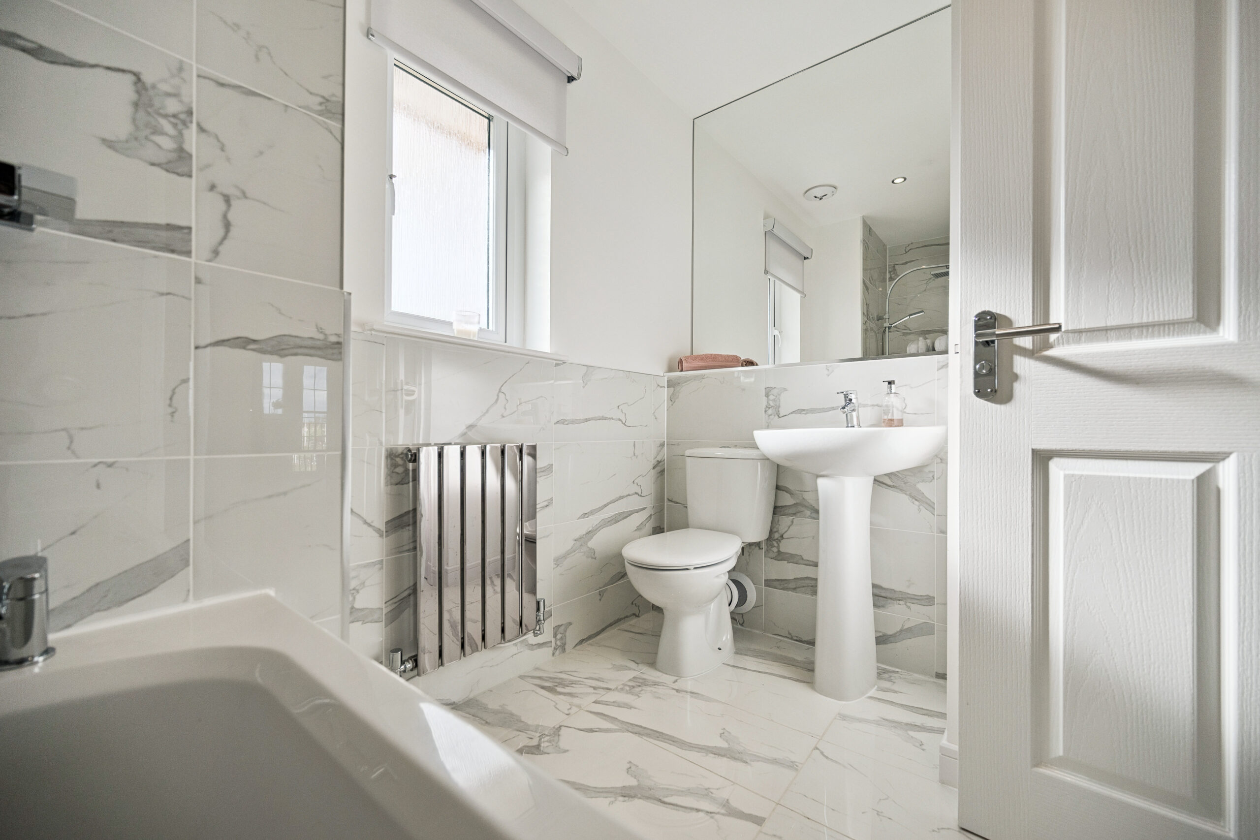 Upstairs a generous landing leads to four double bedrooms. The principal suite is a sanctuary of style featuring a Juliet balcony that invites natural light and offers open views. A fitted wardrobe provides excellent storage while the upgraded ensuite impresses with a walk in shower and marble effect tiling for a spa like feel. The remaining three bedrooms are all spacious and adaptable two with built-in storage, making them ideal for family, guests or home working. Completing the upstairs is the elegant family bathroom finished to the same high standard with marble effect tiling and a sleek three piece suite including shower over bath.