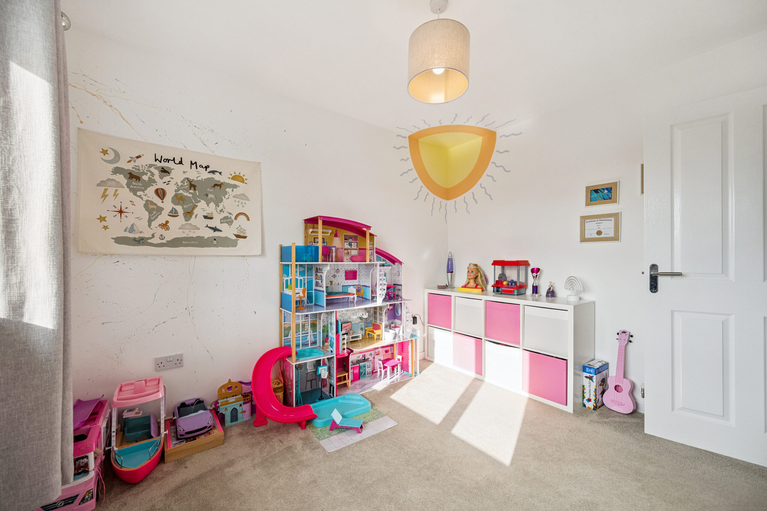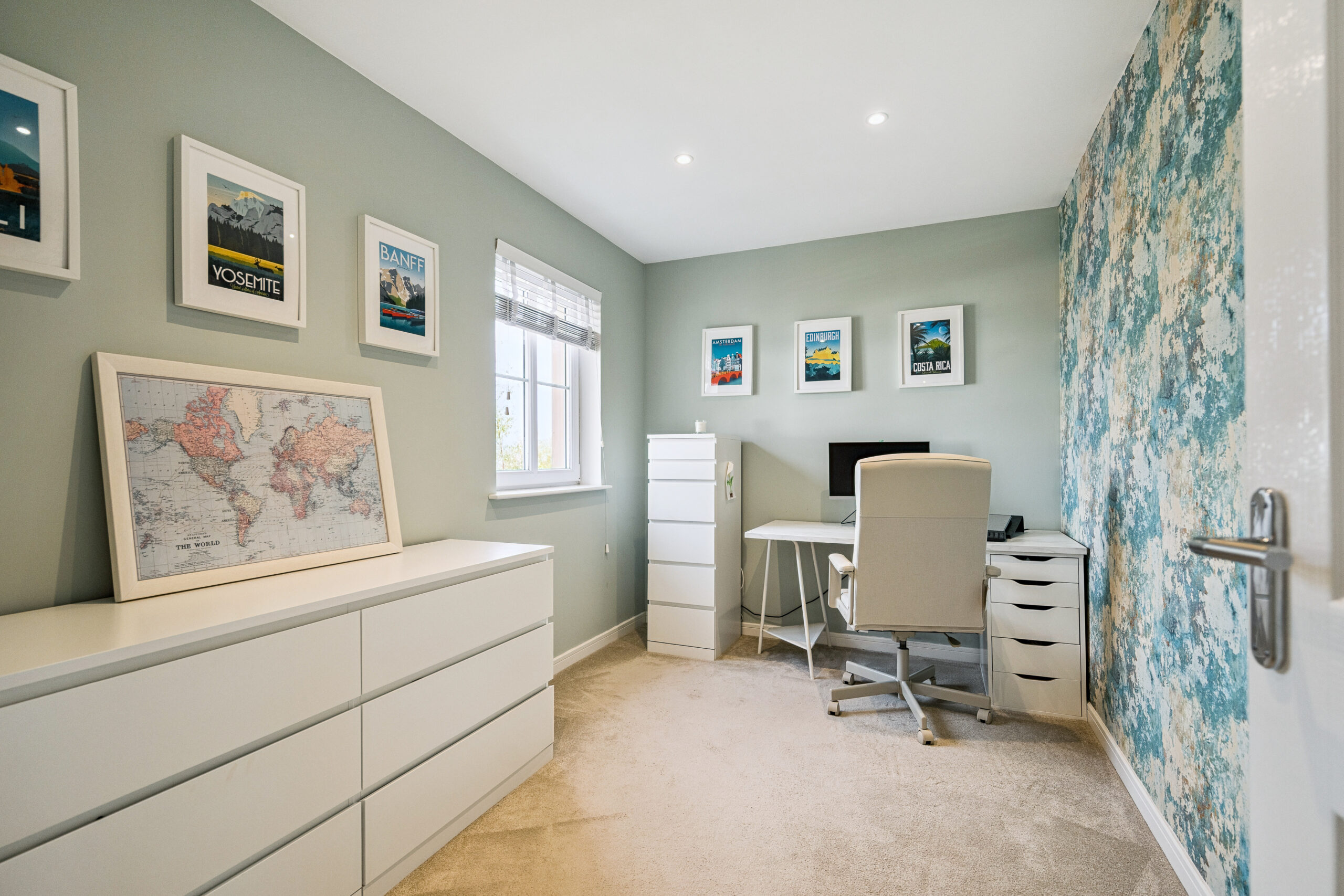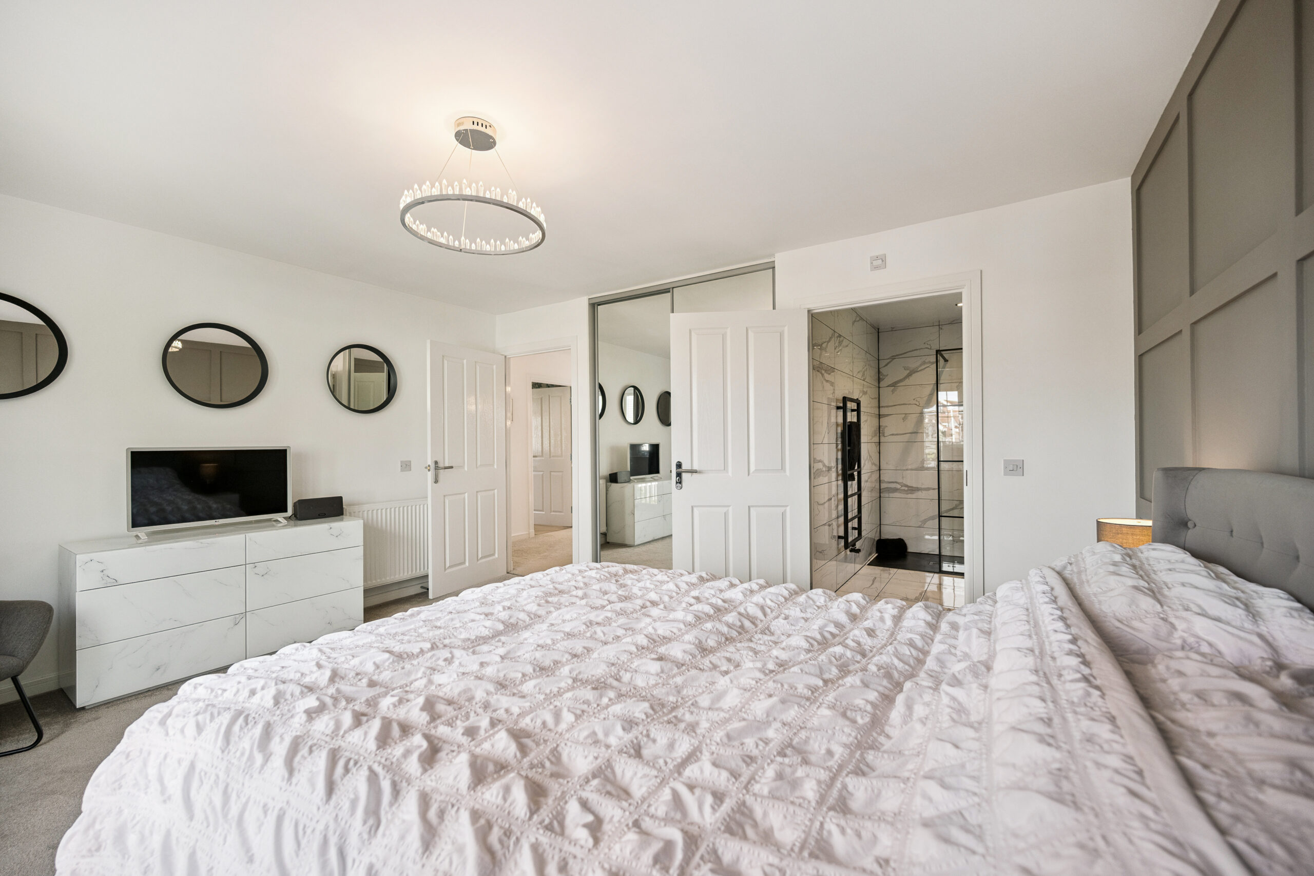Upstairs a generous landing leads to four double bedrooms. The principal suite is a sanctuary of style featuring a Juliet balcony that invites natural light and offers open views. A fitted wardrobe provides excellent storage while the upgraded ensuite impresses with a walk in shower and marble effect tiling for a spa like feel. The remaining three bedrooms are all spacious and adaptable two with built-in storage, making them ideal for family, guests or home working. Completing the upstairs is the elegant family bathroom finished to the same high standard with marble effect tiling and a sleek three piece suite including shower over bath.