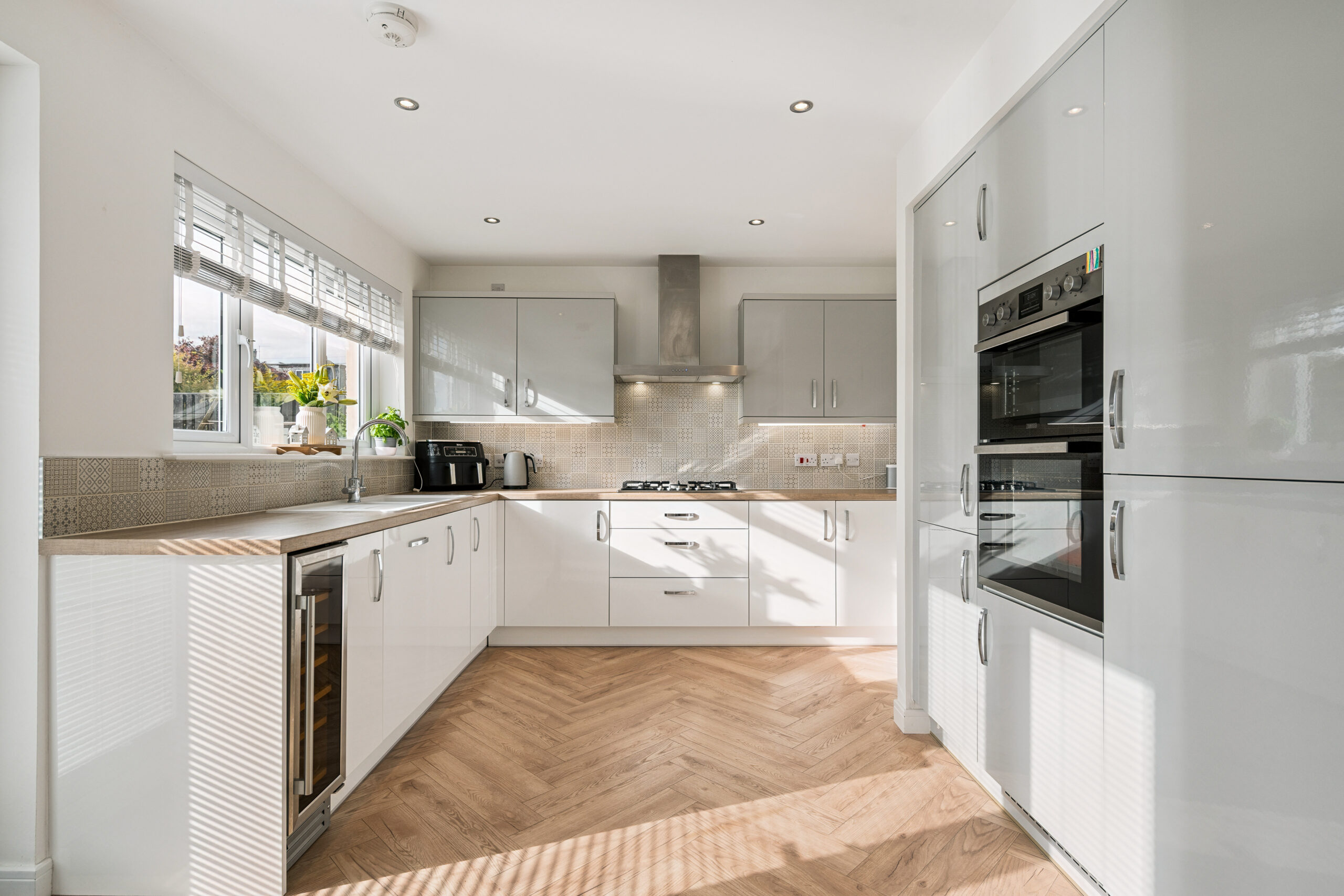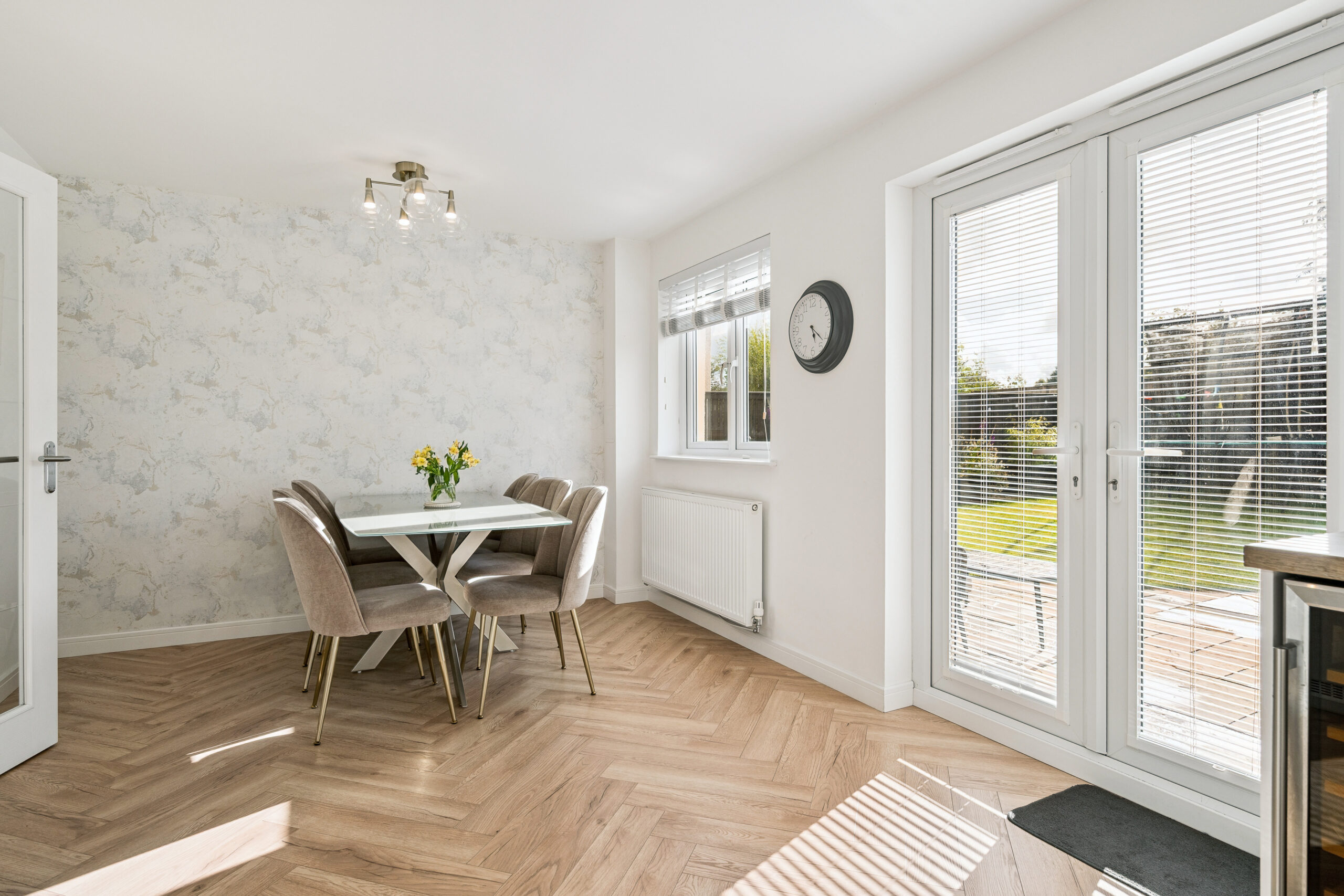The true heart of the home lies to the rear where a contemporary open plan kitchen and dining space unfolds. Sleek white and grey high gloss cabinetry is paired with stylish worktops creating a striking modern look. Integrated appliances including a fridge/freezer, dishwasher, oven, hob and microwave ensure both convenience and clean lines. With space for a six seater dining table this is the perfect setting for both everyday family meals and entertaining. Patio doors open seamlessly onto the garden extending the living space outdoors in the warmer months.