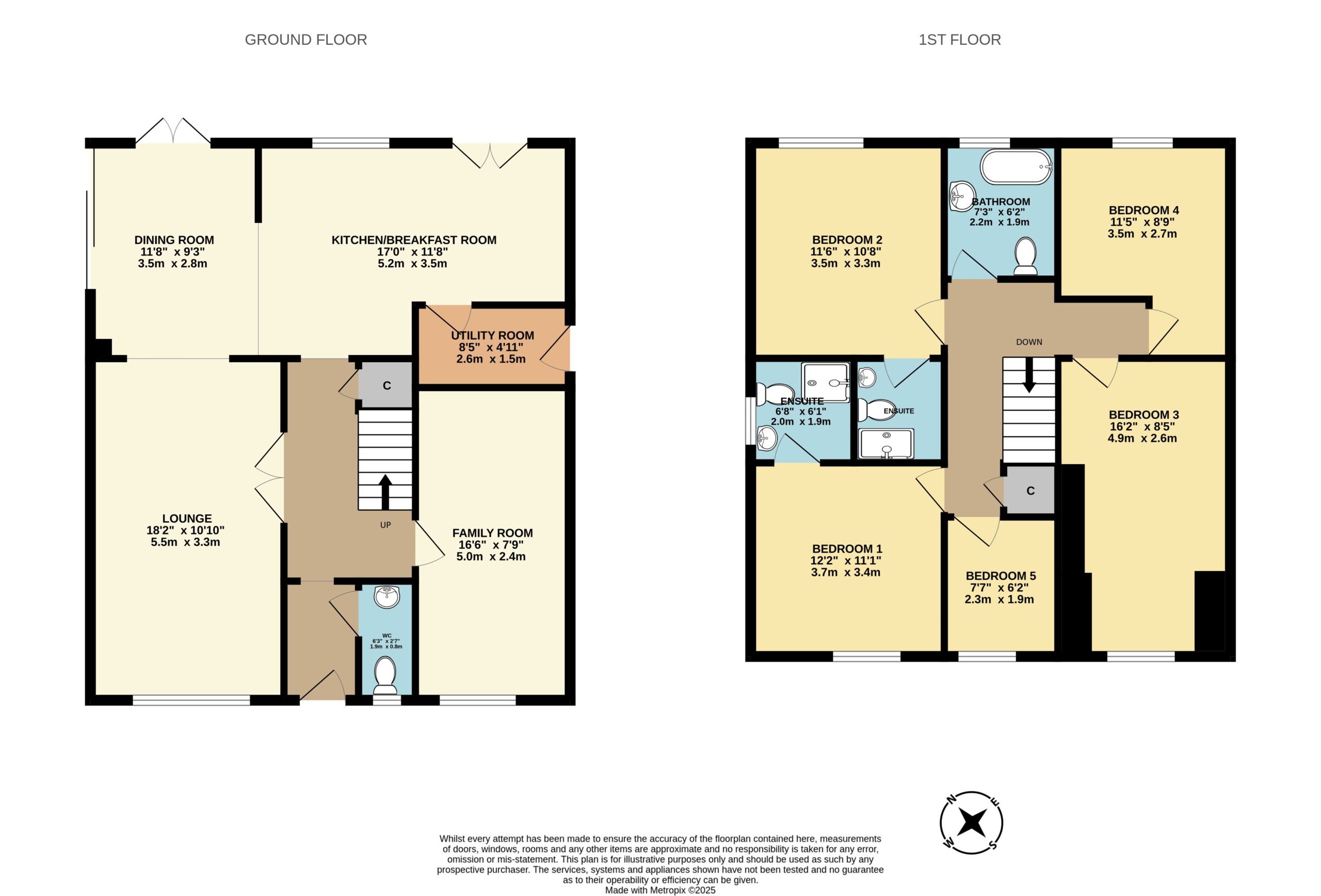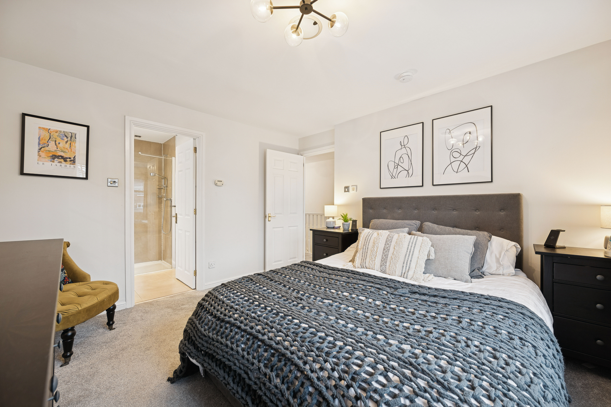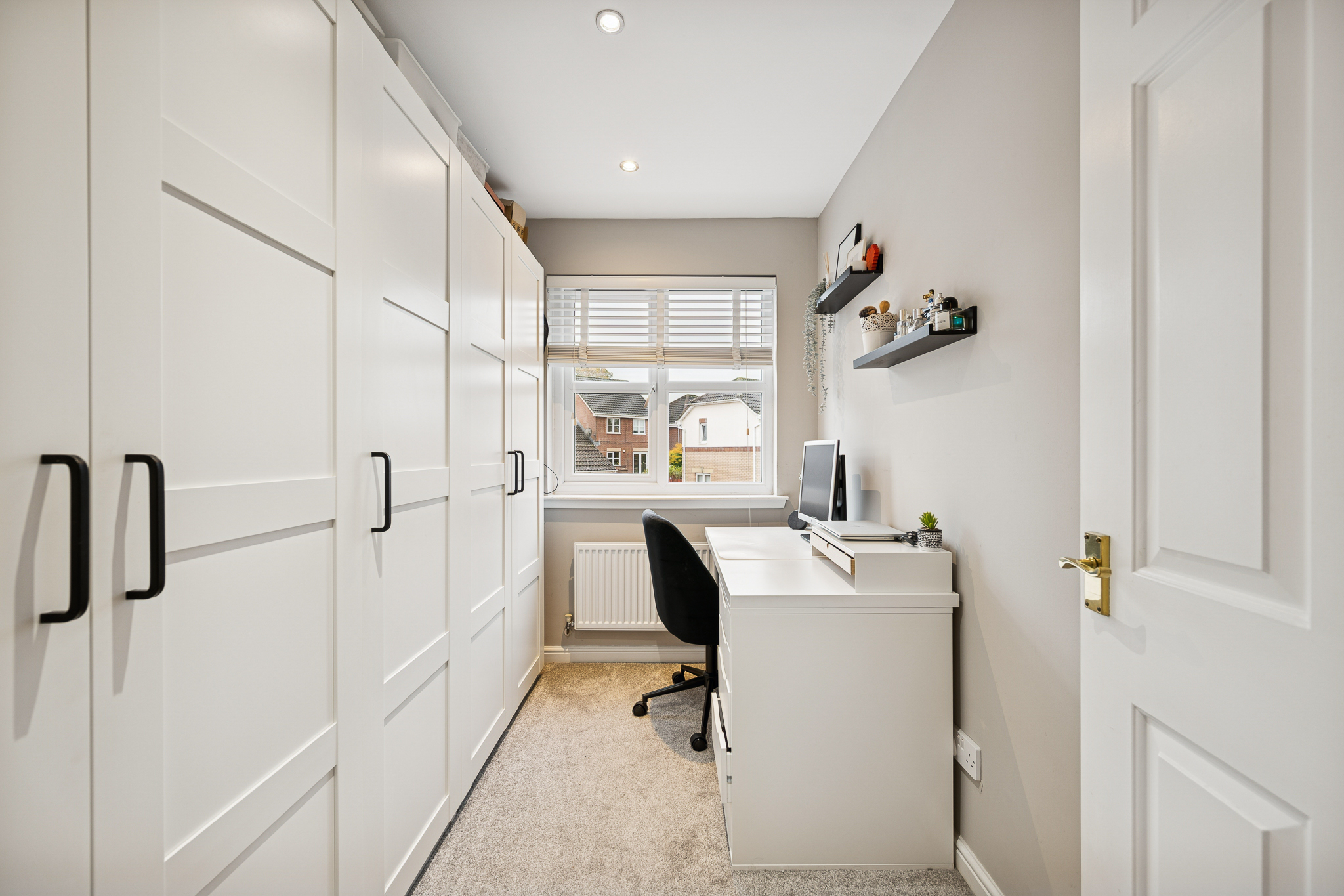 Upstairs, the sense of quality continues across five beautifully appointed bedrooms. The principal suite is an elegant retreat, spacious enough for a king-size bed with ample room for freestanding furniture, complemented by a luxurious ensuite with a fully tiled walk-in shower and stylish fixtures. The second bedroom also benefits from its own chic ensuite, while bedrooms three and four offer bright, comfortable spaces ideal for family living. Bedroom five, currently an office with fitted wardrobes, offers flexibility as a dressing room, nursery or home office.