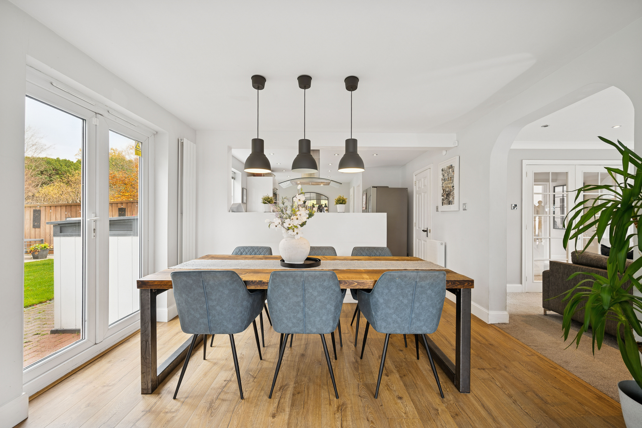 The dining area comfortably accommodates an eight-seater table and opens through bi-fold doors to the decked terrace beneath a charming pergola - ideal for al fresco dining, evening drinks or relaxing in the hot tub. The kitchen is a true statement of style and practicality, featuring sleek white gloss cabinetry, oak-effect worktops, a five-ring gas hob, integrated double oven and microwave and a versatile breakfast bar - offering a seamless blend of design and functionality. A separate utility room provides additional storage and convenience.