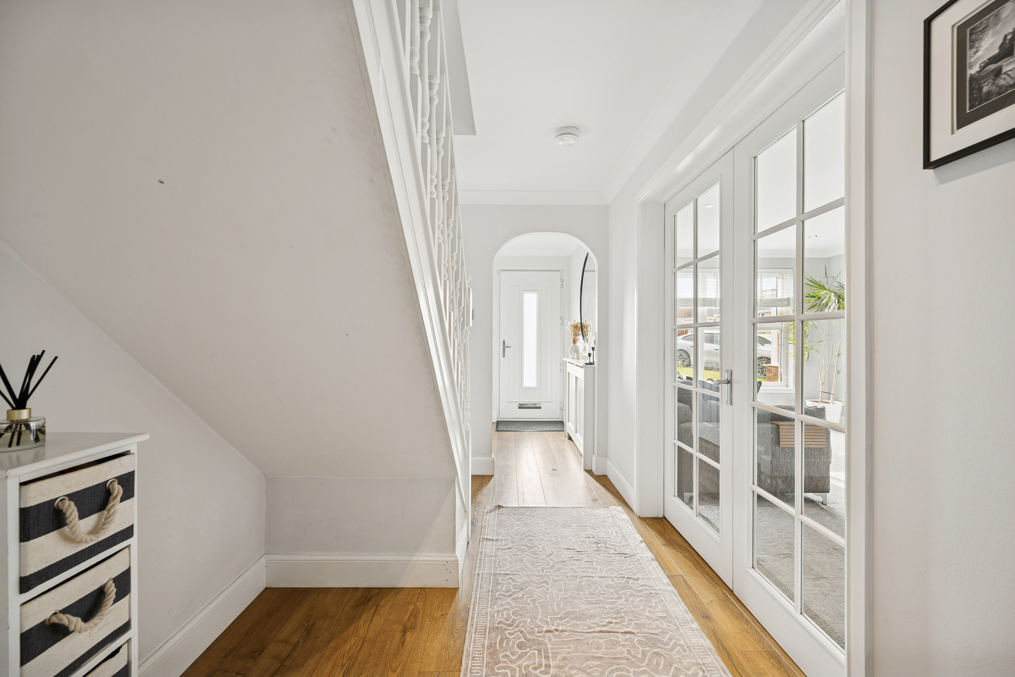 From the moment you arrive, the property commands attention. The expansive corner position, extended monoblock driveway and manicured frontage offer instant kerb appeal - a glimpse of the elegance that continues within. Step through the front door and you’re welcomed by a sense of calm and sophistication, with a bright, spacious hallway featuring wooden flooring and a large, versatile understairs area. To your right, a beautifully designed W/C showcases on-trend panelling and striking gold accents, setting the tone for the thoughtful design carried throughout the home.