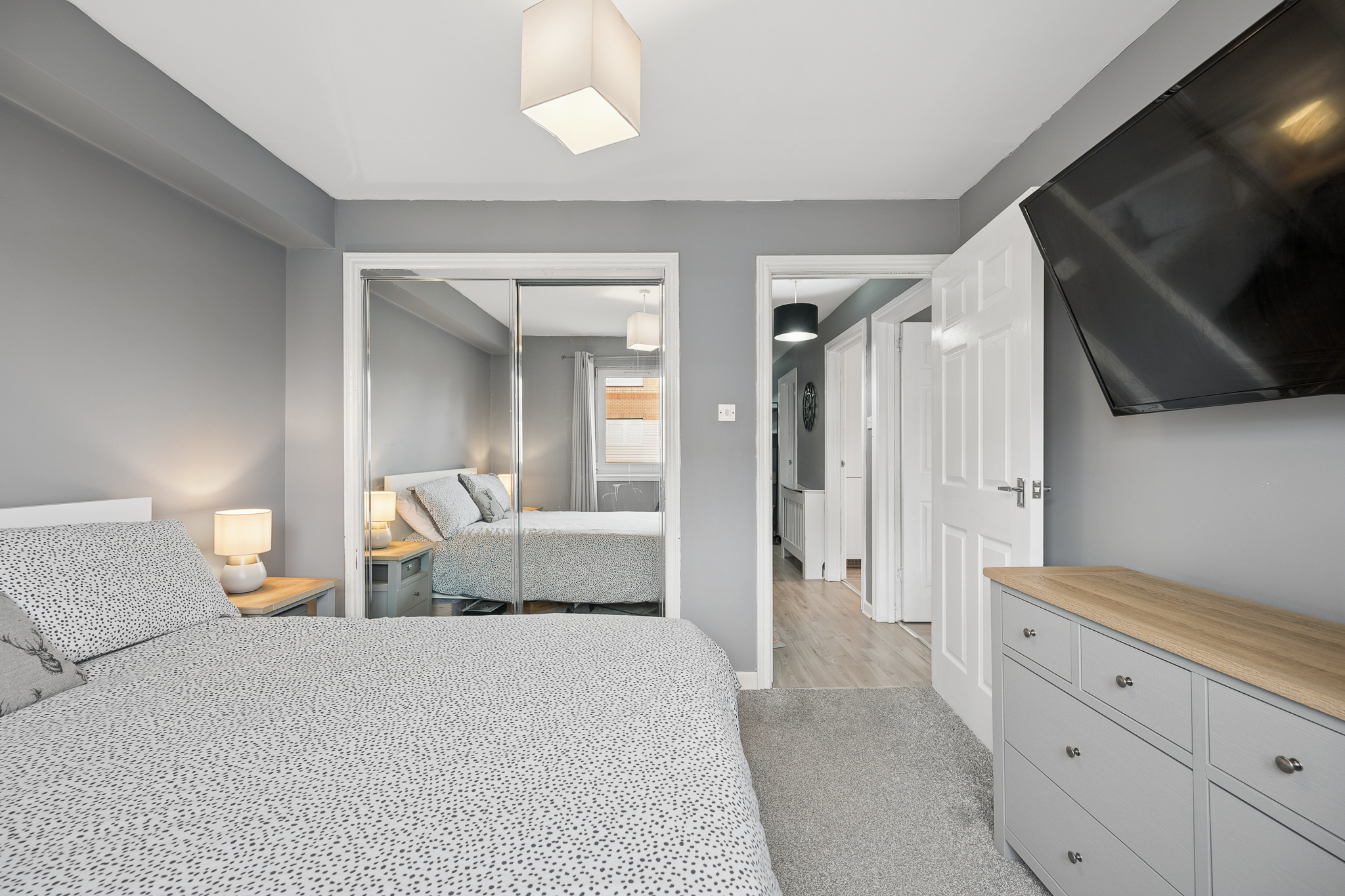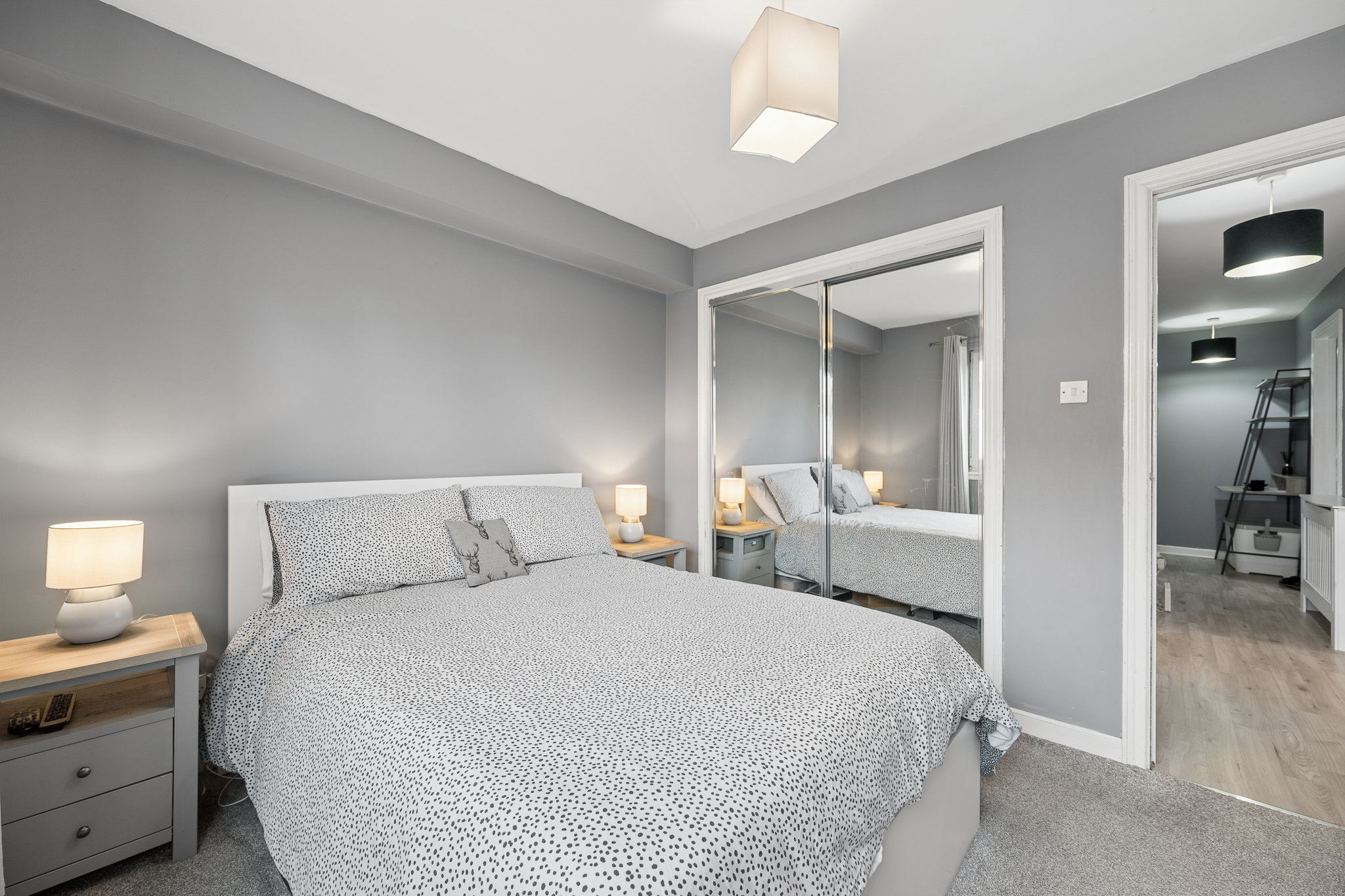 The principal bedroom is generously proportioned and features built-in mirrored wardrobes, providing excellent storage while enhancing the sense of space.