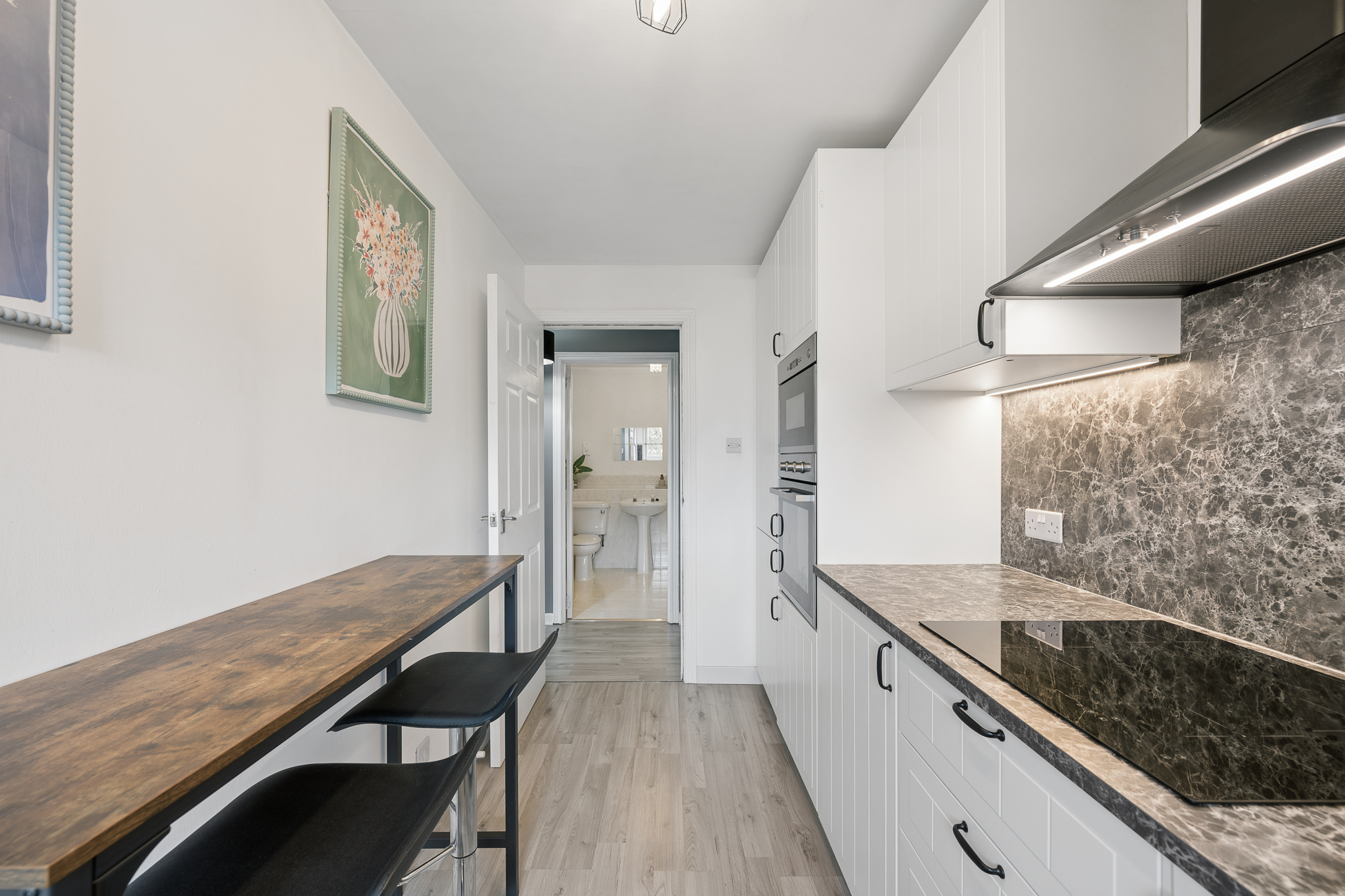 Adjacent is the contemporary kitchen, newly upgraded in 2024 and thoughtfully designed with integrated appliances including a fridge freezer, oven and induction hob, offering both functionality and a sleek finish.