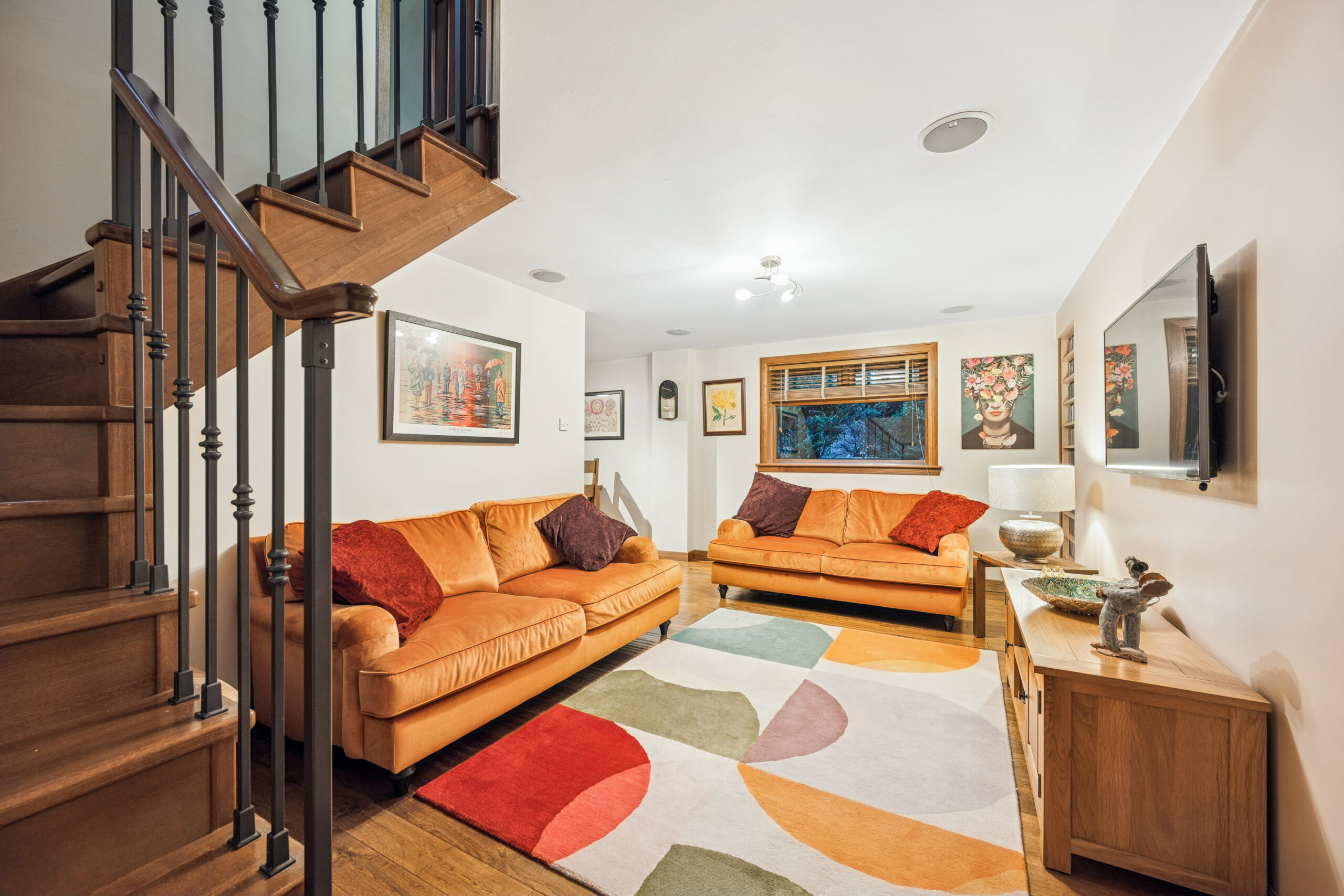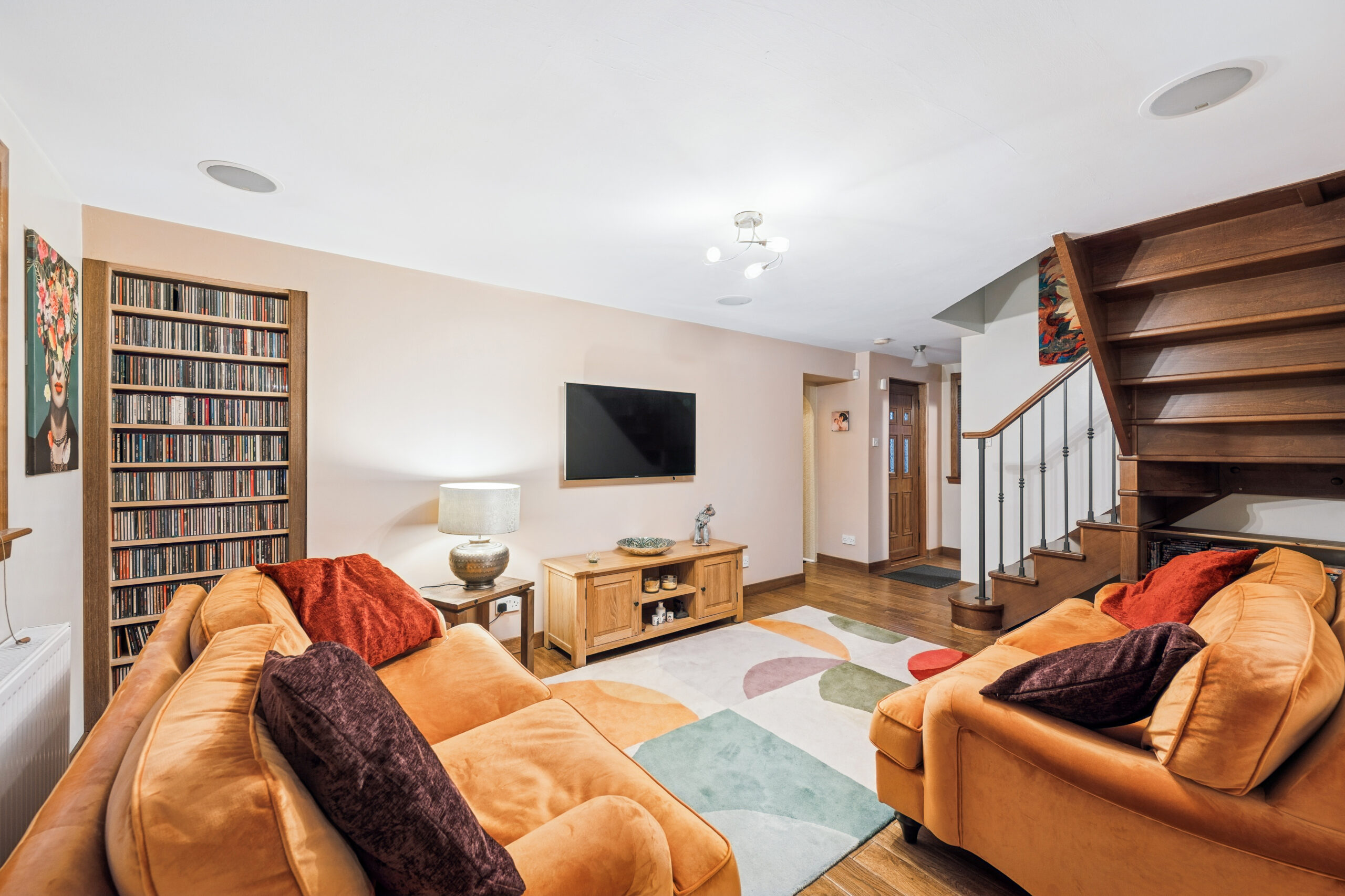 At the end of the hallway, the home opens into a warm, versatile sitting room. Soft lighting, polished wooden flooring and a cosy layout create a welcoming atmosphere. To the left, a handy side entrance offers everyday practicality, accompanied by a cloakroom thoughtfully designed for coats, boots and shoes. The room’s standout feature is the magnificent solid wooden staircase, a true architectural statement with beautifully crafted treads and iron balustrades that elevate the style of the space.