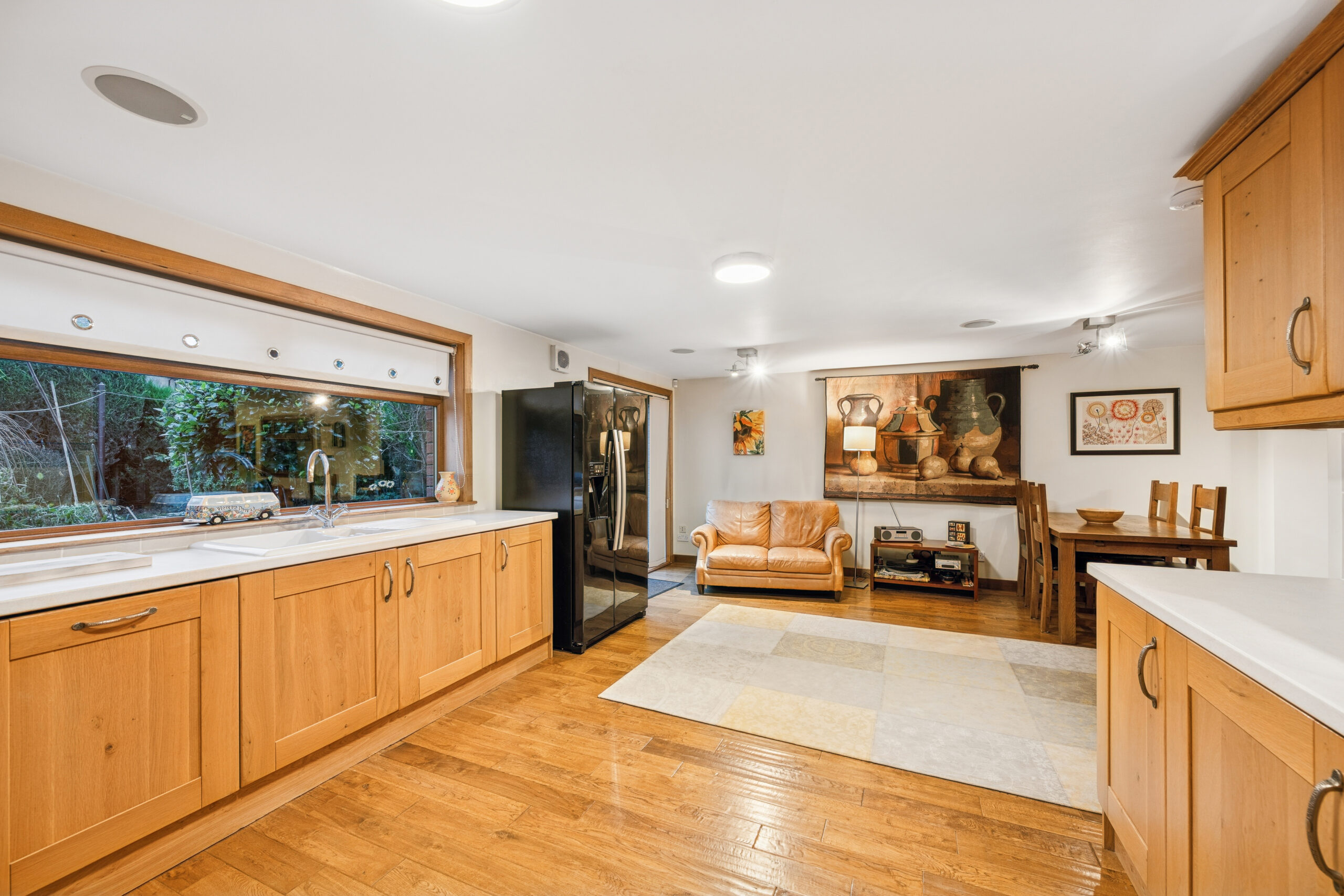 From the sitting room you step into the spectacular kitchen/diner, housed within the thoughtfully designed rear extension. This expansive, open-plan area offers a beautiful blend of warmth and contemporary comfort. Rich, polished wooden floors flow underfoot, complementing the extensive handcrafted cabinetry that frames the room. A range-style cooker sits proudly at the centre of the kitchen, bordered by vast worktop space ideal for cooking, socialising and hosting. A wide picture window frames the garden like a living artwork, while patio doors open directly onto the rear terrace, allowing for effortless indoor–outdoor living.