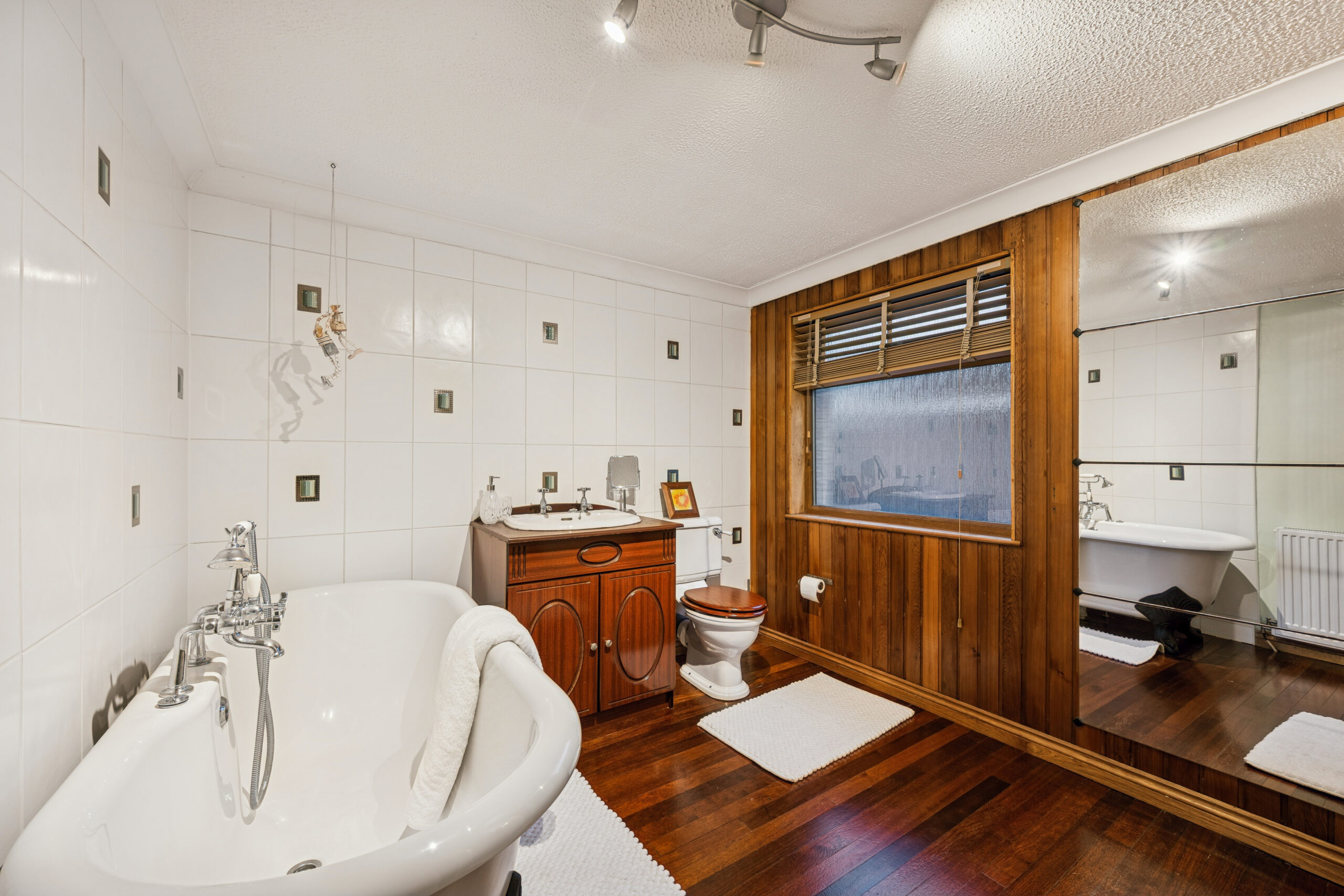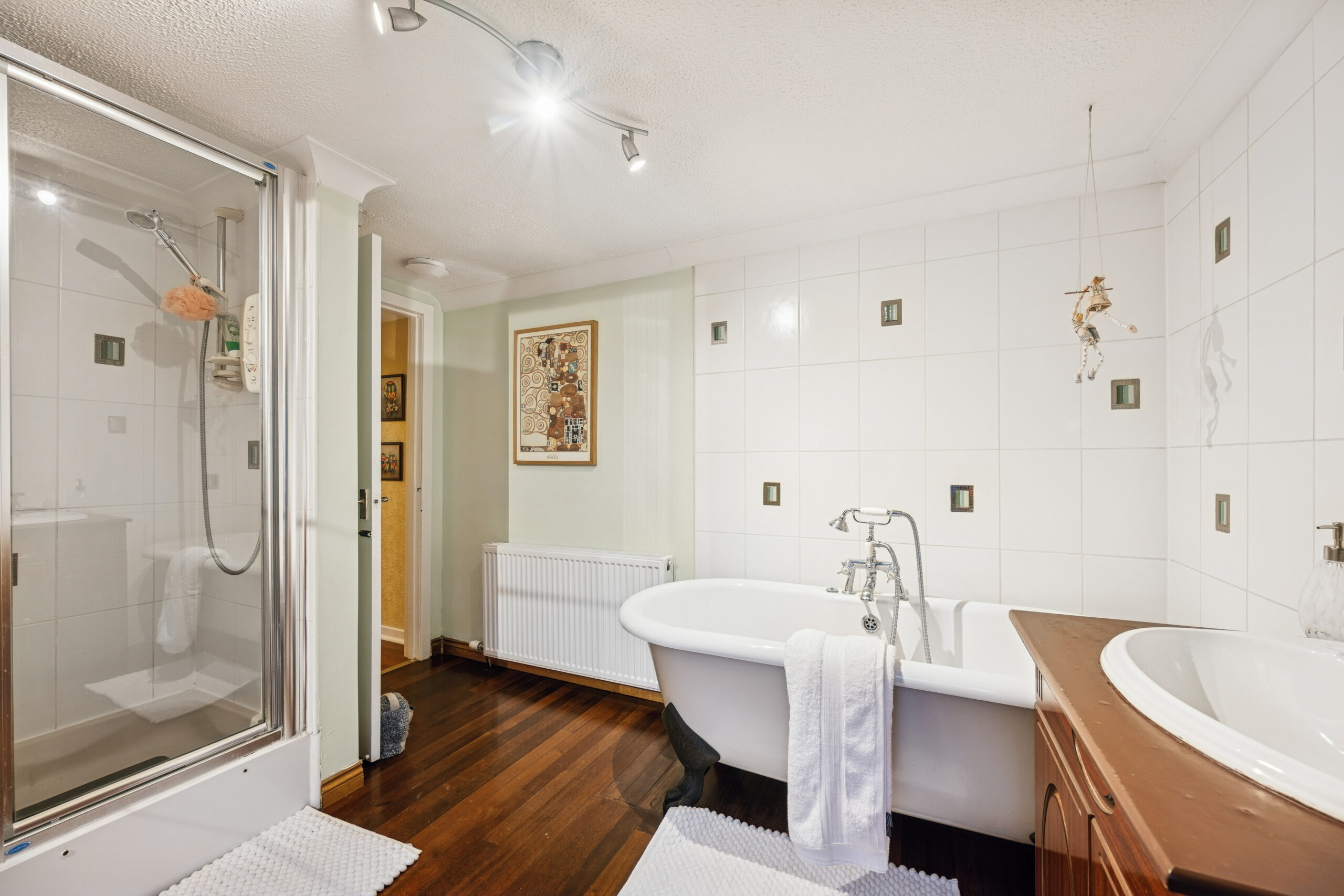 The family bathroom on the left is a true delight: spacious, luxurious, and designed for relaxation. A classic roll-top ceramic bath with claw feet takes centre stage, offering the perfect spot to unwind. A separate shower cubicle, vanity unit, WC, generous original wood detailing, and built-in storage complete this beautifully balanced four-piece suite.