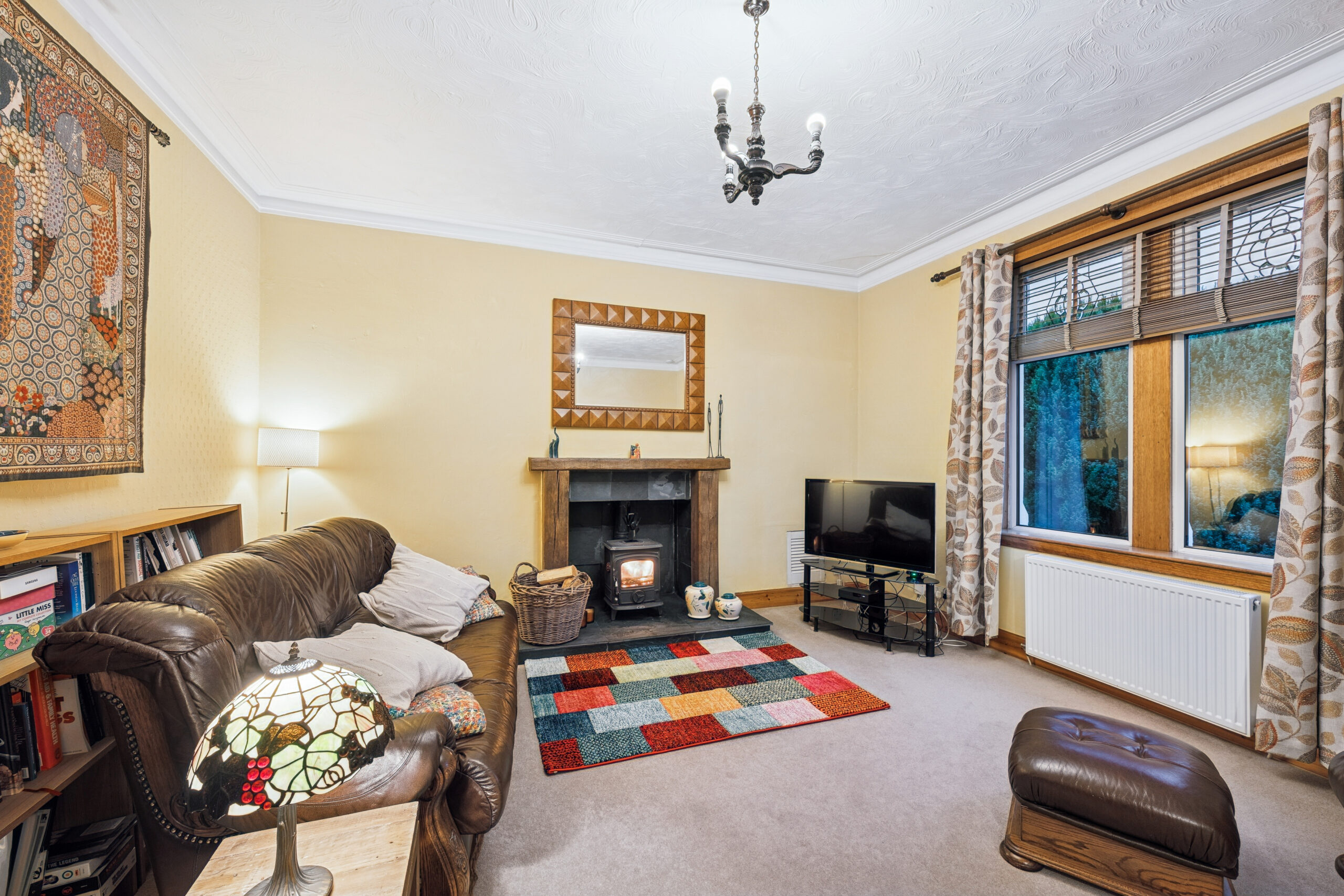 To the right, the lounge exudes instant comfort and sophistication. The impressive ceiling height enhances the sense of openness, while a large front-facing window bathes the room in natural light. At its heart sits a beautiful log-burning stove framed within a traditional fireplace, the perfect centrepiece for winter evenings. Plush carpeting underfoot adds warmth to the room’s traditional proportions, creating a space that feels both elegant and inviting.
