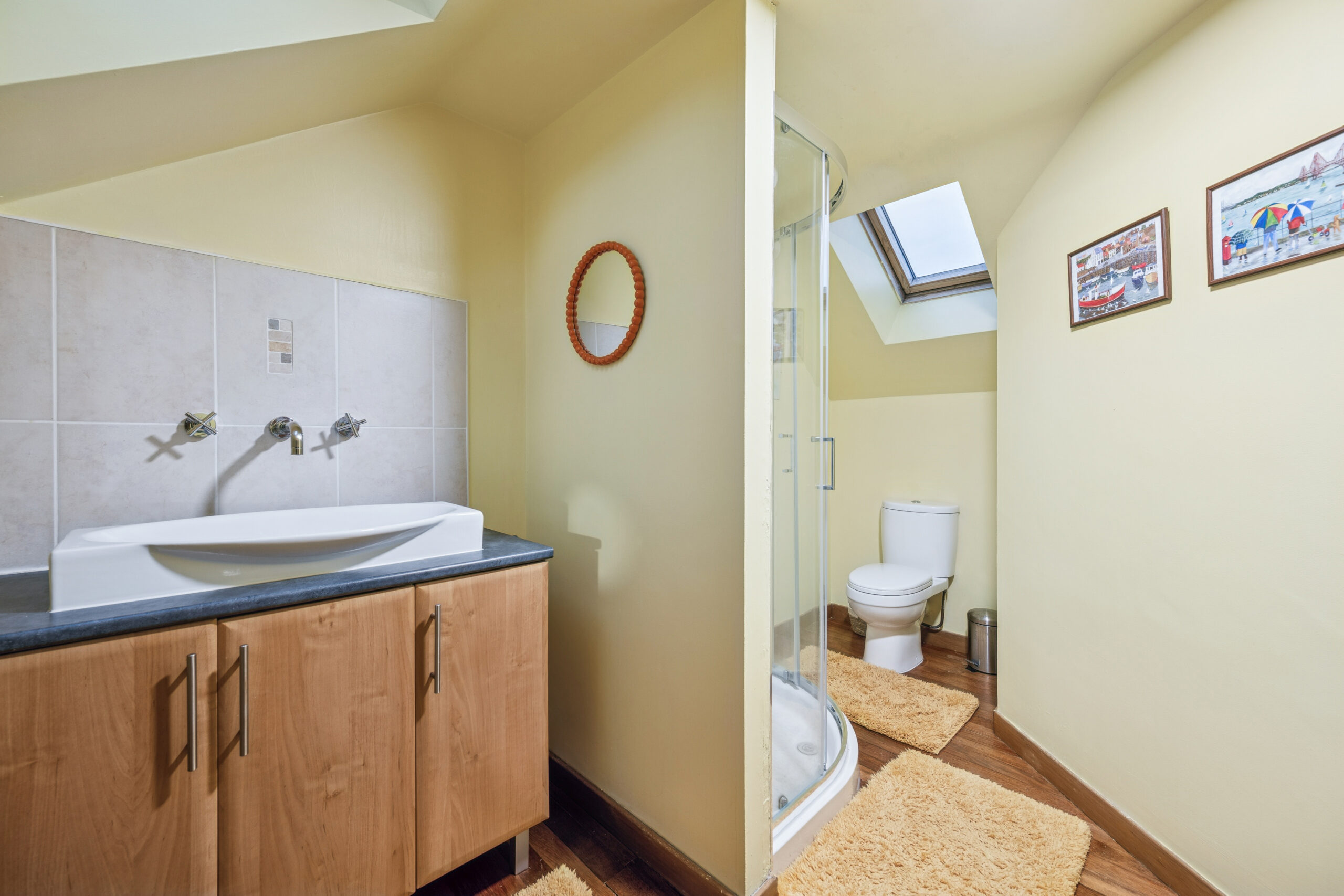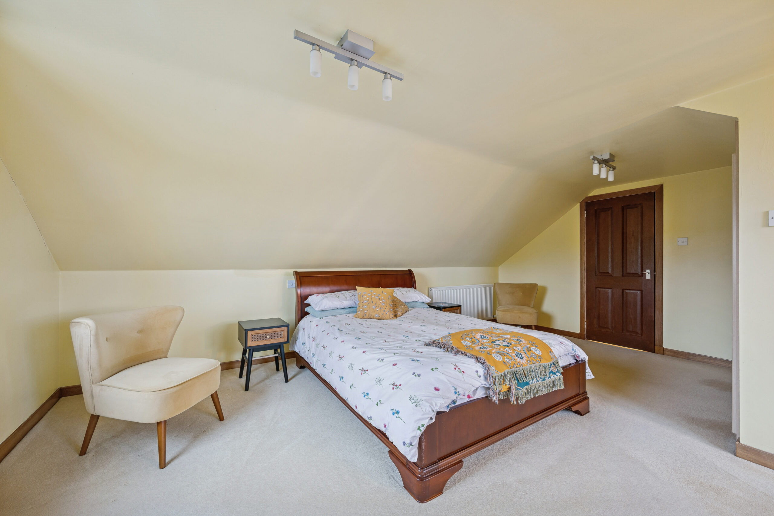 The staircase leads to the wonderfully private principal bedroom suite, occupying the entire upper floor. This room is nothing short of impressive, light, airy and exceptionally spacious. The gentle angles of the ceiling create intimate corners while still allowing for generous movement throughout. Double-aspect windows frame views over the garden and surrounding greenery, filling the room with natural light from dawn to dusk. Fitted wardrobes offer discreet yet practical storage, enhancing the room’s calm, uncluttered feel. Across the landing, the principal shower room features a modern corner shower, WC, vanity unit and skylights that wash the space in soft daylight.