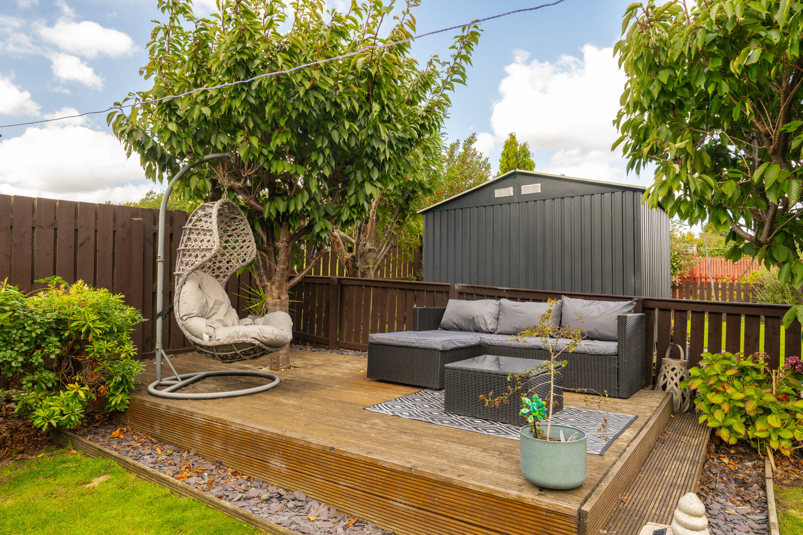 The southwest facing rear garden is both generous and private, with no properties overlooking. It has been fully landscaped and features decking immediately outside the dining area, ideal for alfresco dining, as well as additional decking at the rear for relaxing or entertaining. A large outdoor storage unit offers excellent practicality for garden tools and equipment.