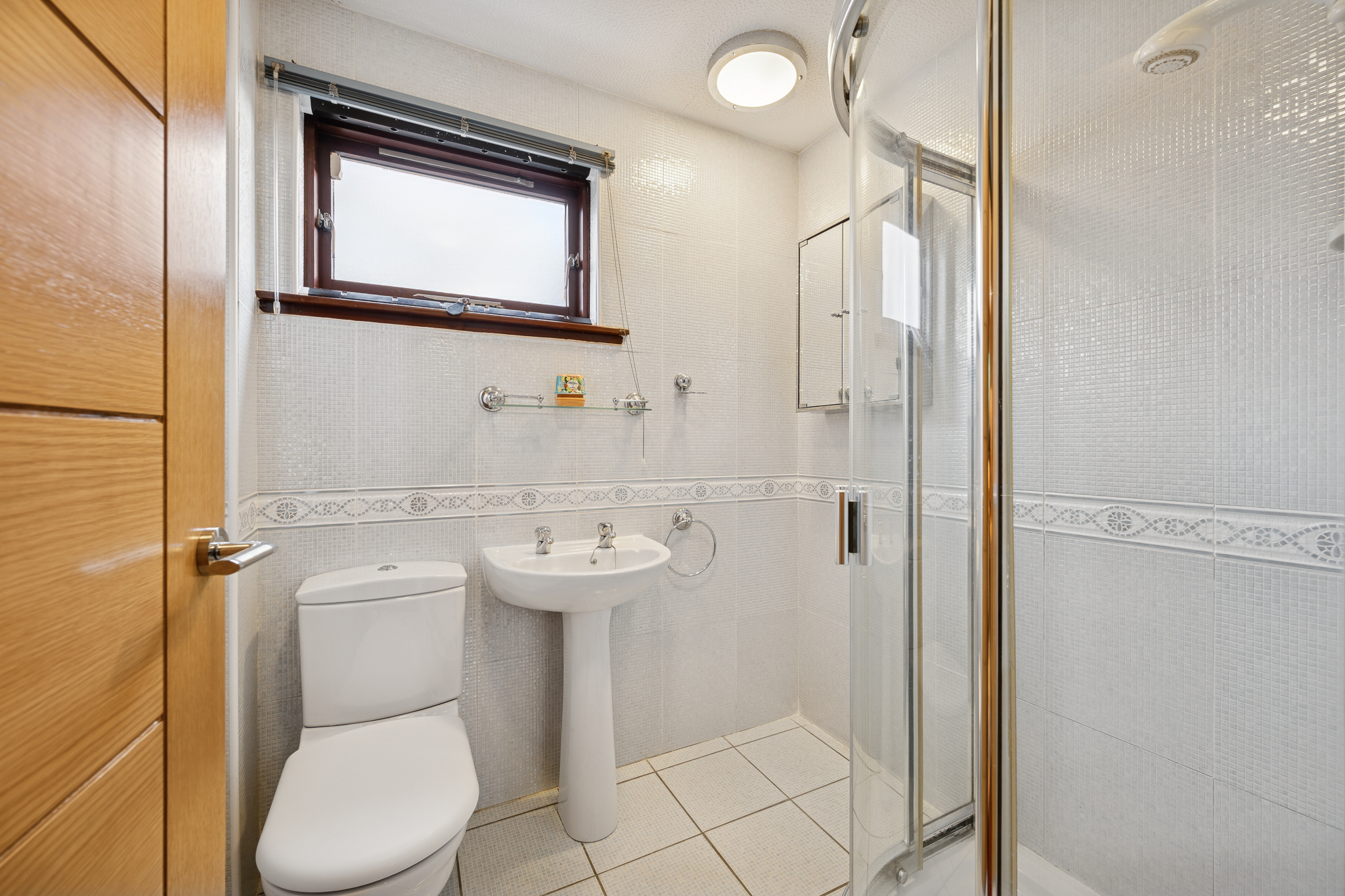 Further along the hallway, a useful storage cupboard provides ideal space for linen and household essentials. The main bathroom is positioned toward the rear of the property and comprises a fully tiled three piece suite with a standing shower, offering a practical and functional layout.
