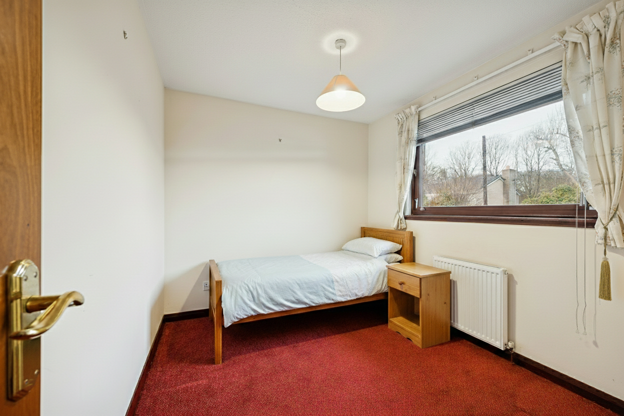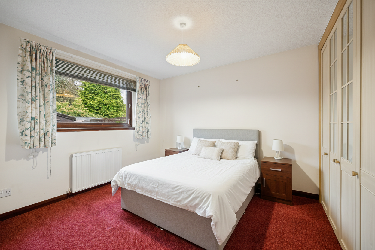 The principal bedroom is located to the rear of the home, providing a quieter and more private setting. This room comfortably hosts a king-size bed with bedside cabinets and benefits from a large fitted wardrobe, offering excellent storage without compromising floor space.