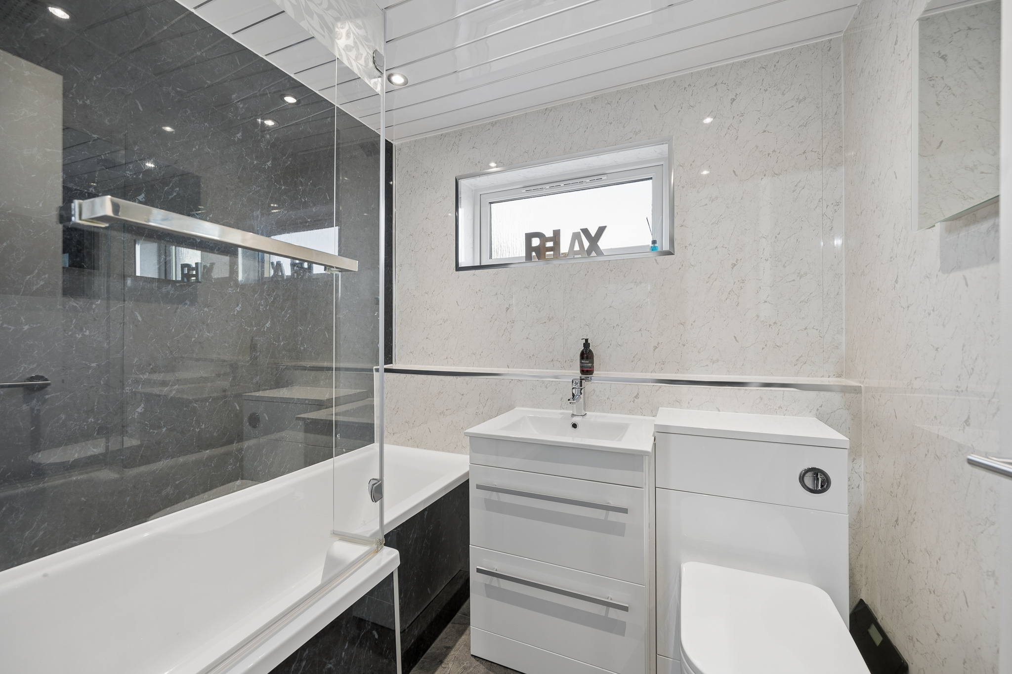 The family bathroom completes the upper level and features a modern suite including a bath with overhead rainfall shower and glass screen, complemented by contemporary wall panelling and modern flooring.
