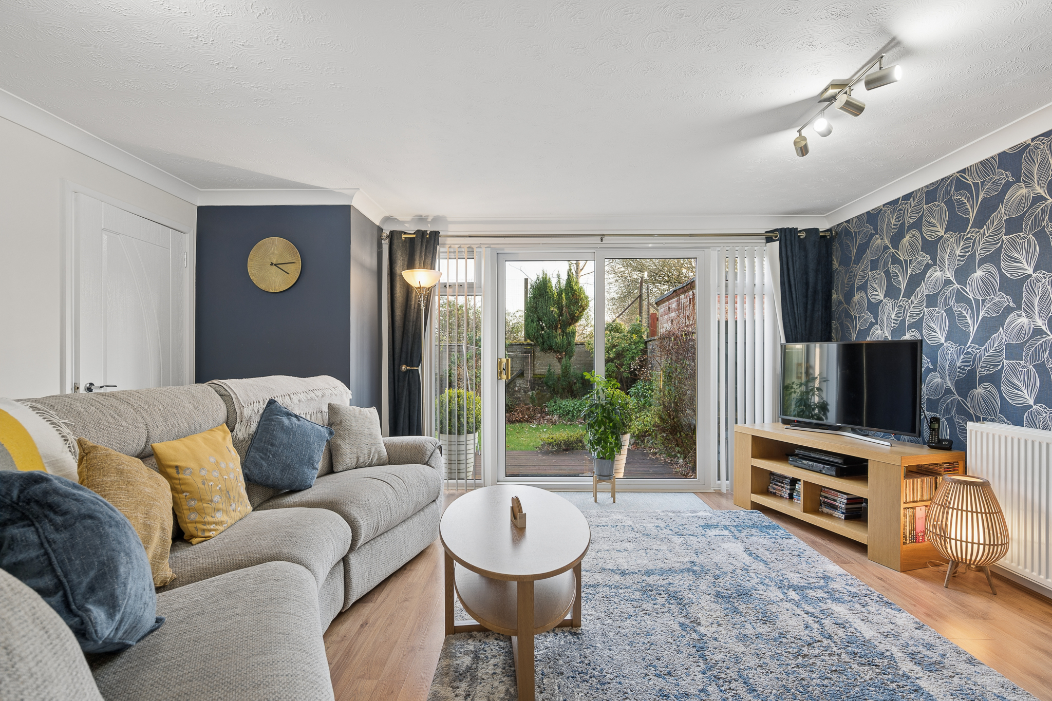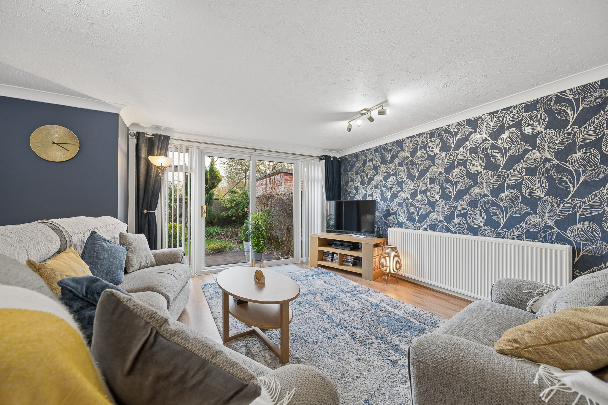 Moving further through the property, the hallway opens into the main lounge, a spacious and comfortable living area located at the rear of the home. Finished with wood effect flooring and modern décor, the room enjoys excellent natural light thanks to large French doors which open directly onto the garden, creating an easy connection between indoor and outdoor living.