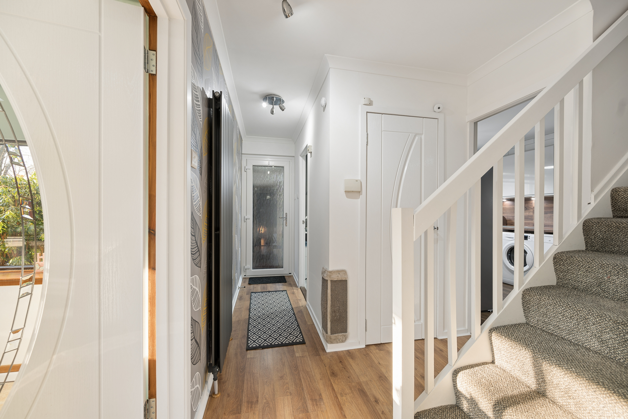 At the front door opens you are welcomed into a useful entrance porch, providing a practical space for coats and shoes before entering the main home. From here, you are welcomed into a bright and stylish entrance hallway, finished with warm wood effect flooring and modern décor. A contemporary vertical radiator adds a modern design feature while maintaining the clean, uncluttered feel of the space as the hallway leads naturally through the ground floor.