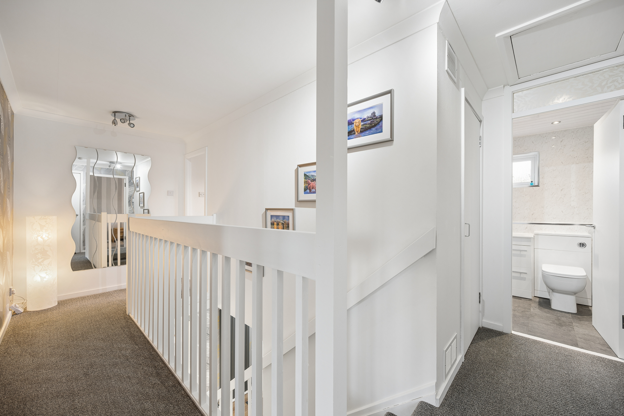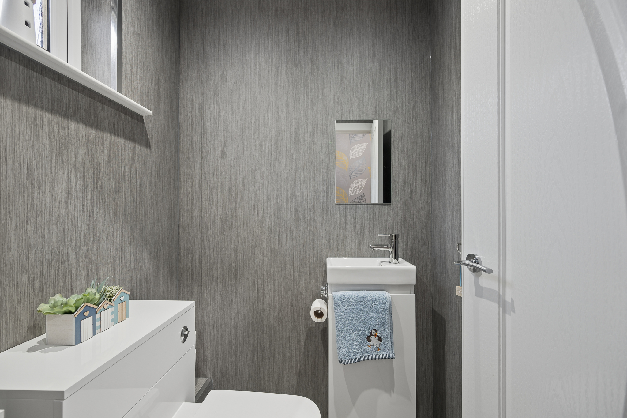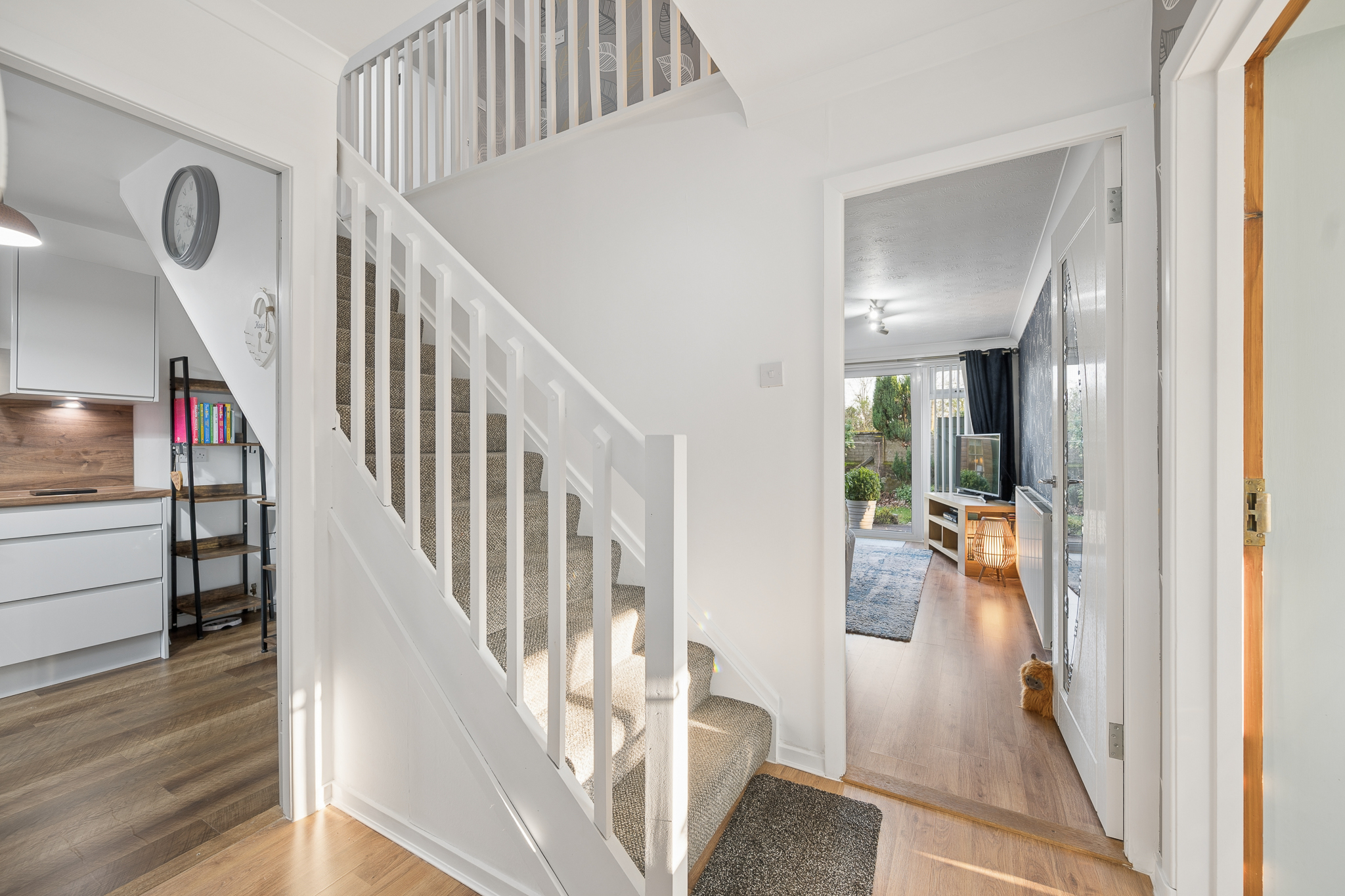 Immediately off the hallway is the downstairs WC, fitted with a WC and wash hand basin set within a vanity unit and finished with modern grey wet wall panelling, giving the space a clean and contemporary feel. Continuing along the hallway there is also a useful storage cupboard before entering the kitchen.