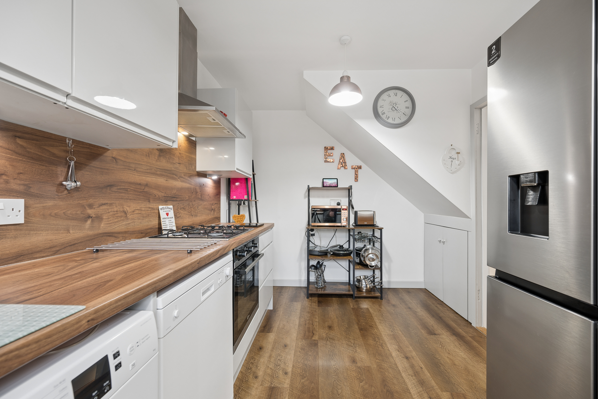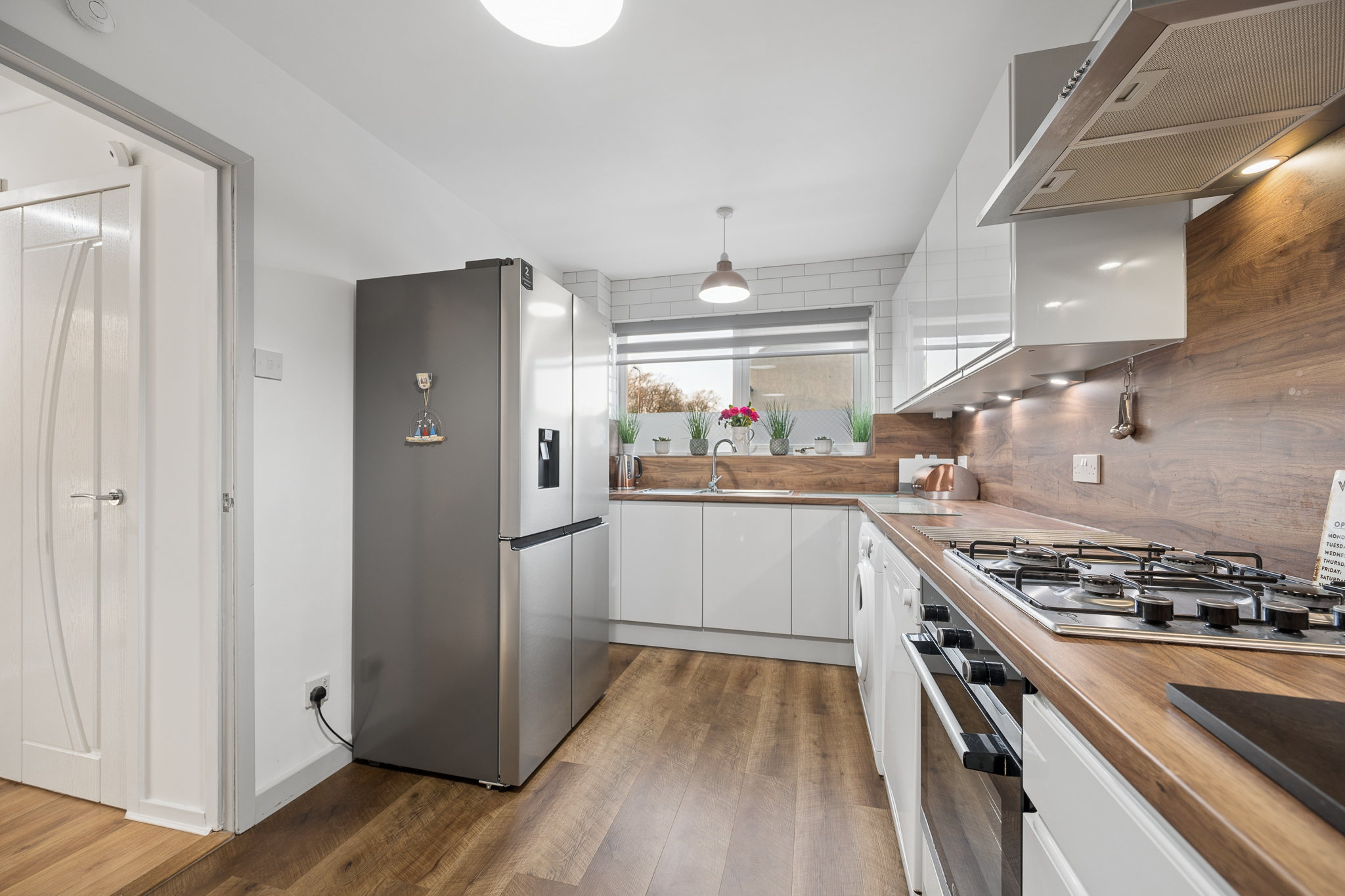 The kitchen is both stylish and functional, fitted with white sleek high gloss units complemented by warm wooden worktops and tiled splashbacks. A large window above the sink brings in plenty of natural light, while the layout offers good storage and preparation space along with room for appliances including an American style fridge freezer.
