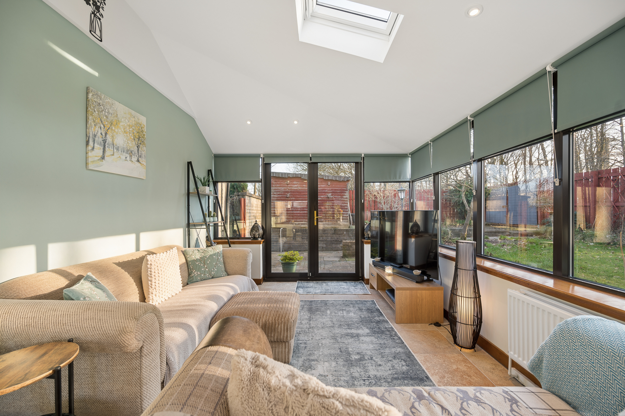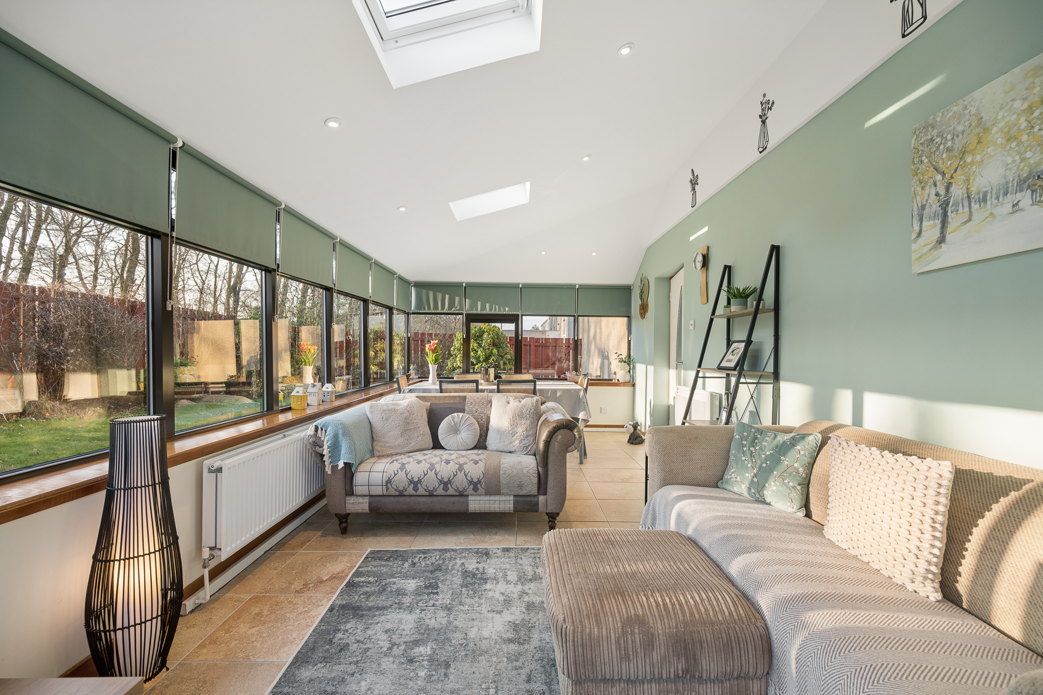From the hallway there is also access to the side extension, a fantastic additional living space that offers real flexibility for family life. With windows on three sides and two skylights above, the room is filled with natural light throughout the day. Finished with tiled flooring and neutral décor, it could be used as a formal dining room, second sitting room, playroom or home office. French doors lead directly out to the garden, making it an ideal space for entertaining or enjoying the garden during warmer months.