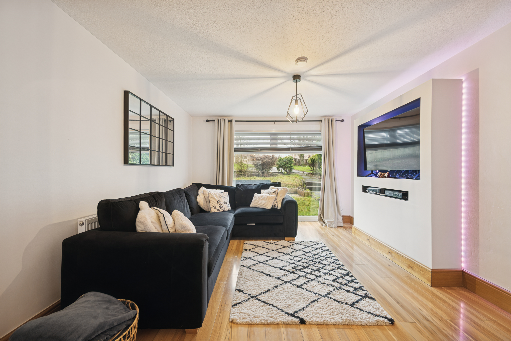 An attractive archway leads through to the bright and welcoming living room, which enjoys a large front facing window allowing plenty of natural light. A contemporary media wall provides a striking focal point, making this an ideal space to relax.