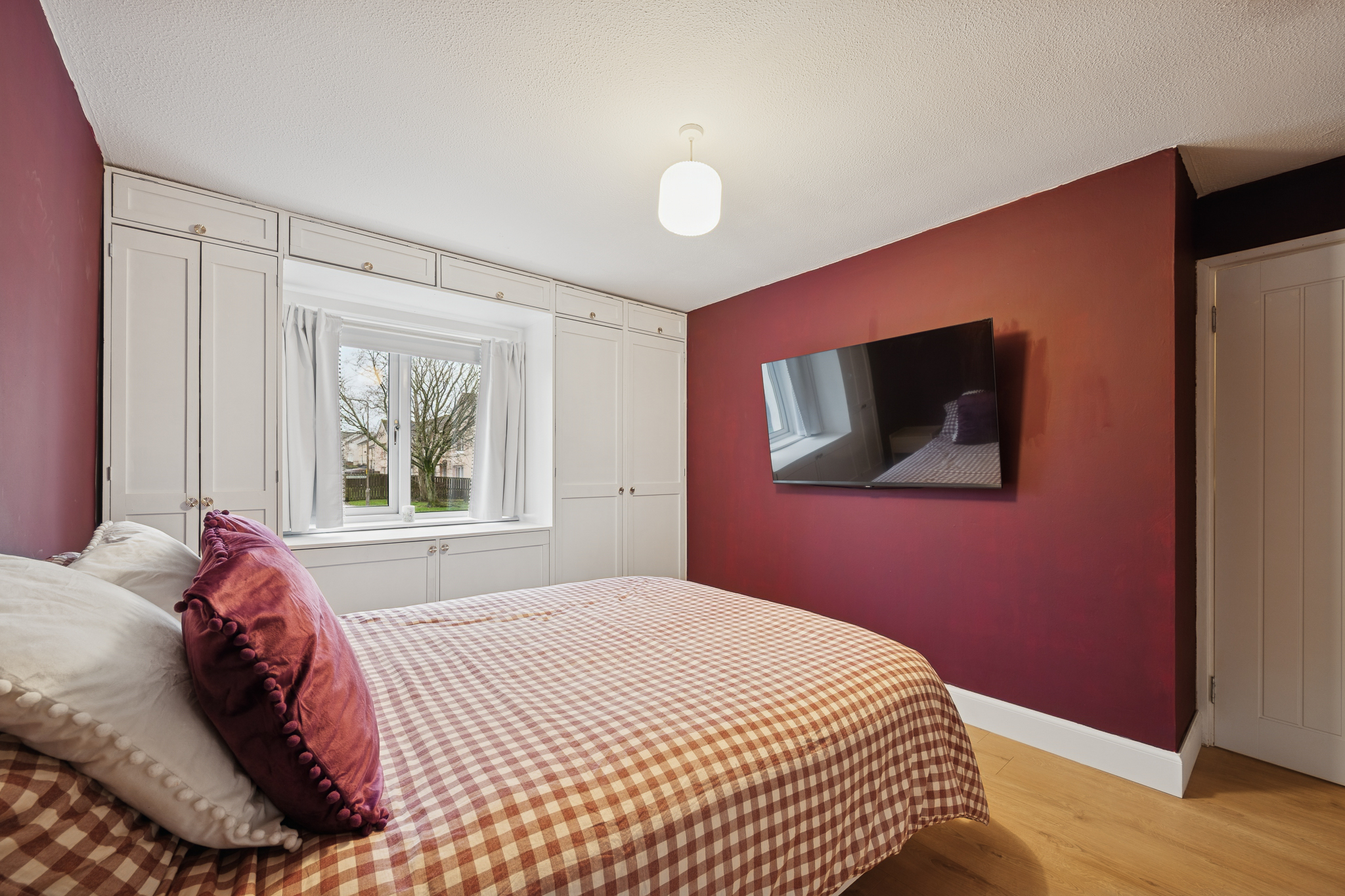 Bedroom two is a generous double bedroom, finished in neutral décor with wooden flooring and benefiting from a large built in storage cupboard. The principal bedroom is an excellent sized room, presented in immaculate condition and offering extensive built in storage, including fitted units surrounding the window as well as an additional built in cupboard.