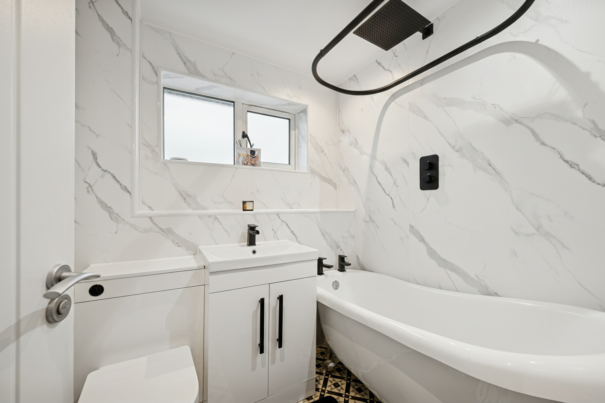 To the first floor, the family bathroom has been fully renovated to a high standard and features a freestanding bath, vanity sink unit with storage beneath, stylish black taps and fittings and a distinctive black iron radiator, all finished with modern wall panelling.