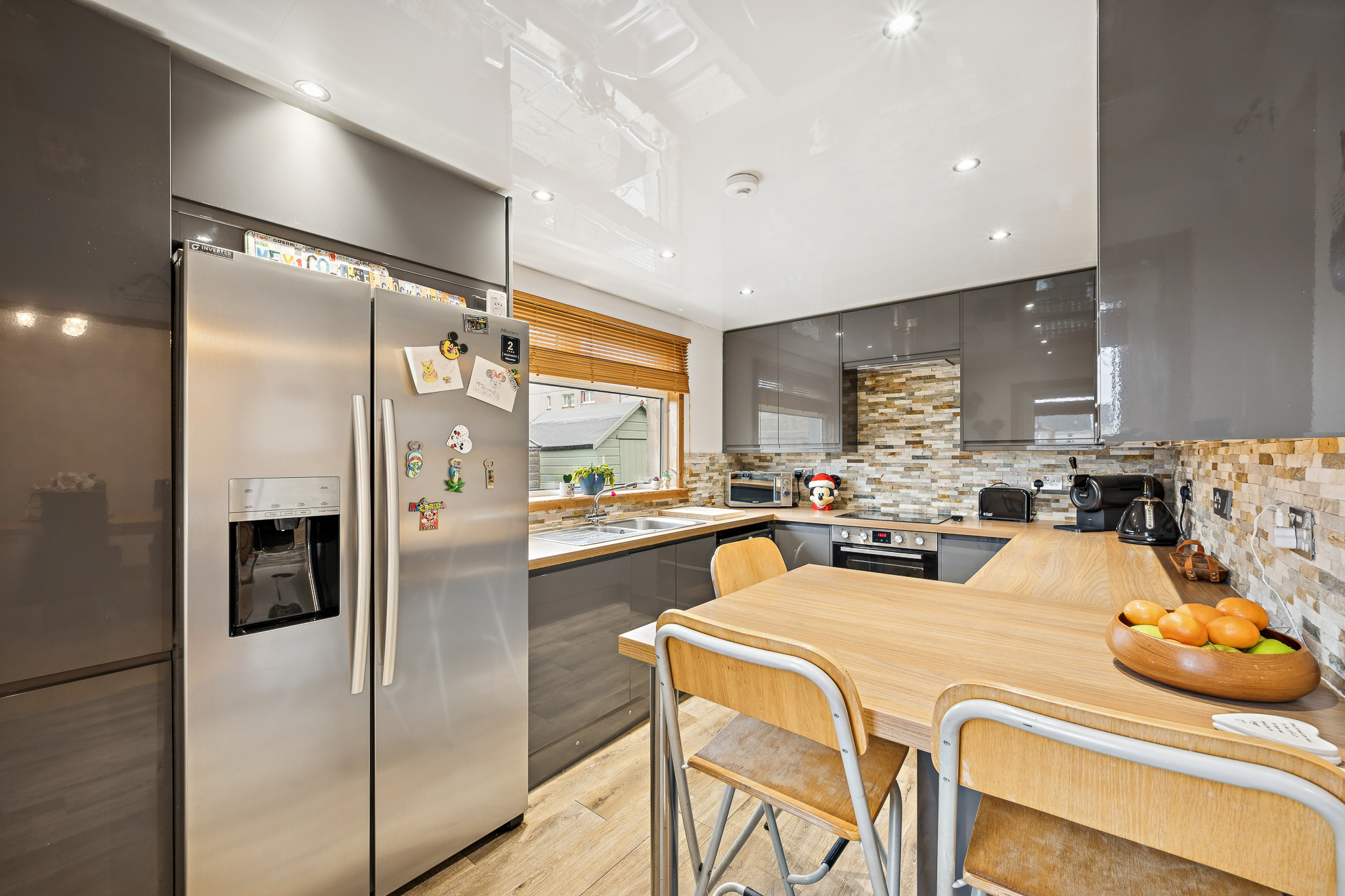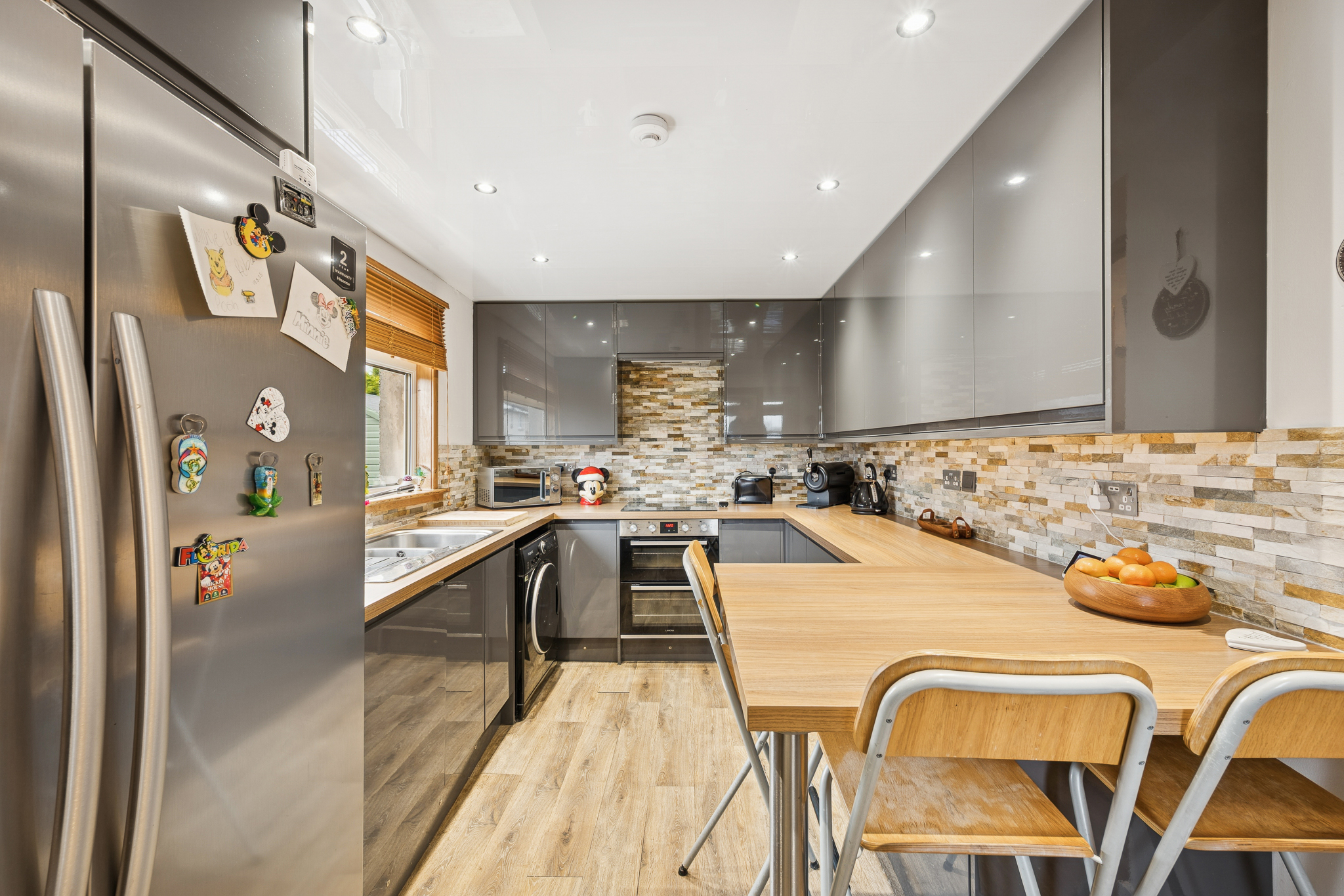 To the rear of the property, the stylish kitchen forms part of a modern extension. Finished with sleek dark grey gloss cabinetry and wooden-style worktops, this impressive space is both functional and visually appealing. The kitchen includes a four point induction hob with integrated oven and grill, integrated dishwasher, space for a washing machine and a convenient breakfast bar. With plenty of worktop and storage space, it’s perfectly designed for busy households and keen cooks alike.