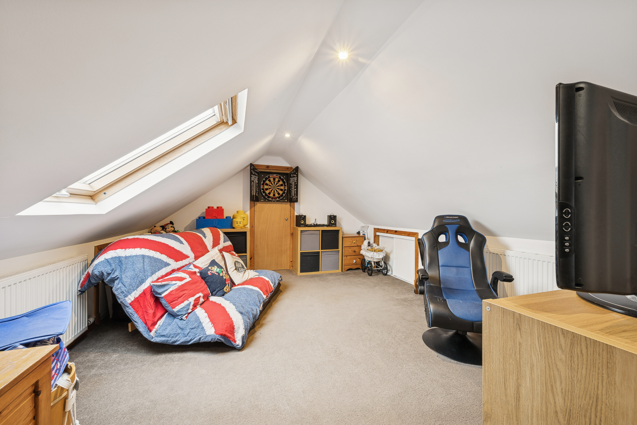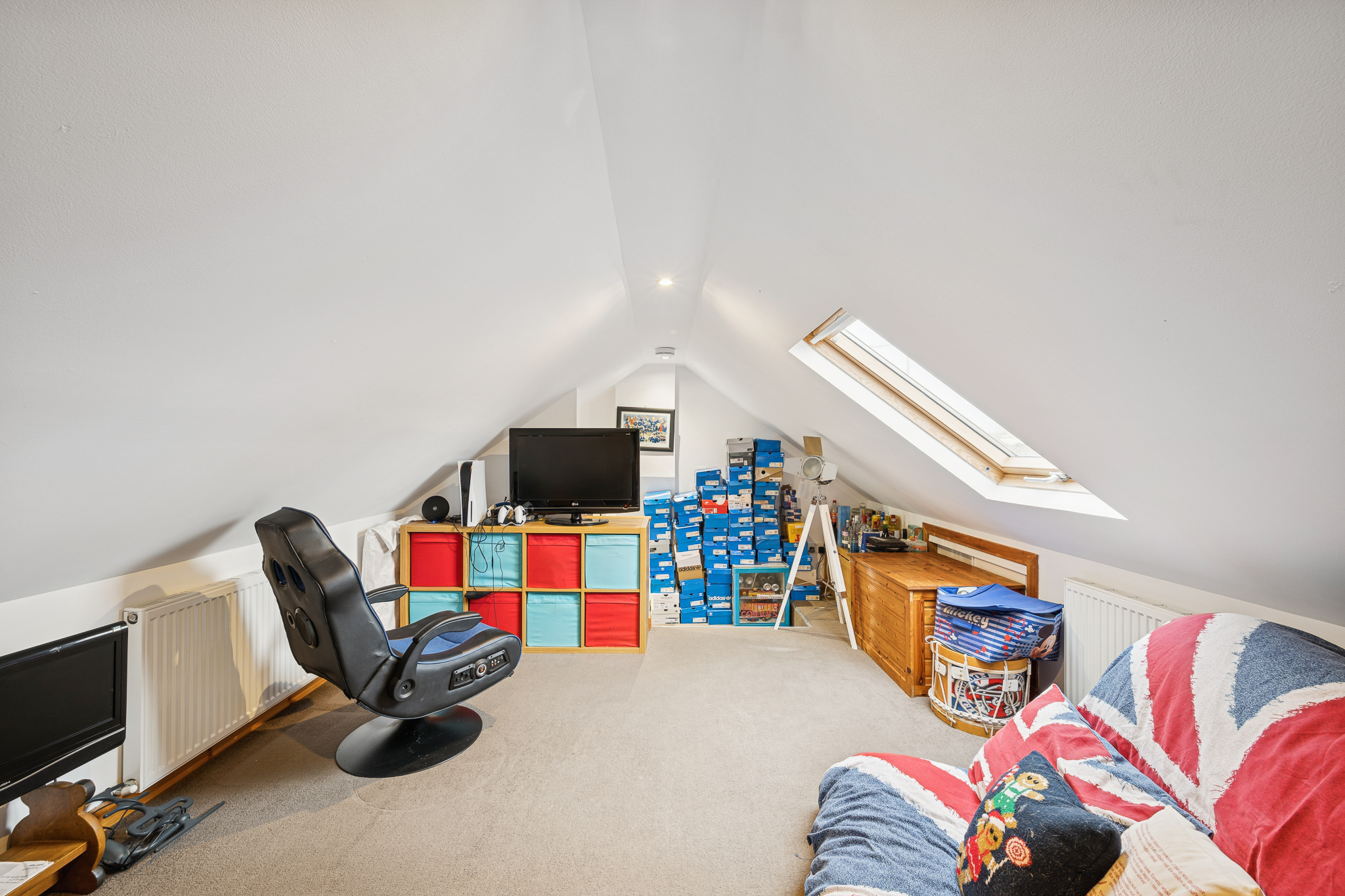 A staircase leads to the loft conversion, a fantastic additional room offering complete versatility. Currently used as a games room, it can easily serve as a third bedroom, home office, studio or playroom. The space features a skylight window for natural light and retains accessible storage areas within the eaves, making it both functional and flexible.